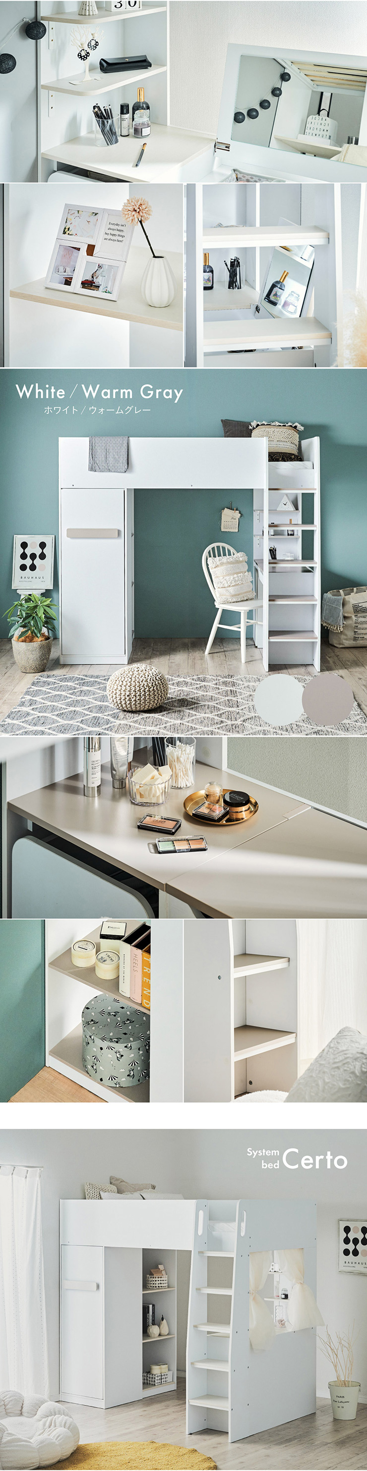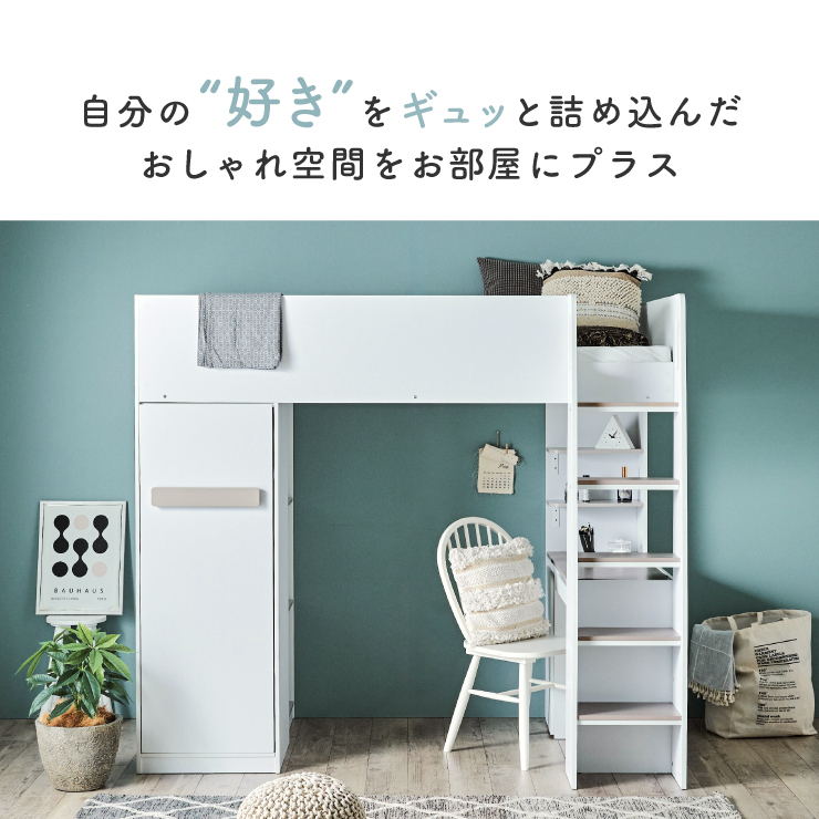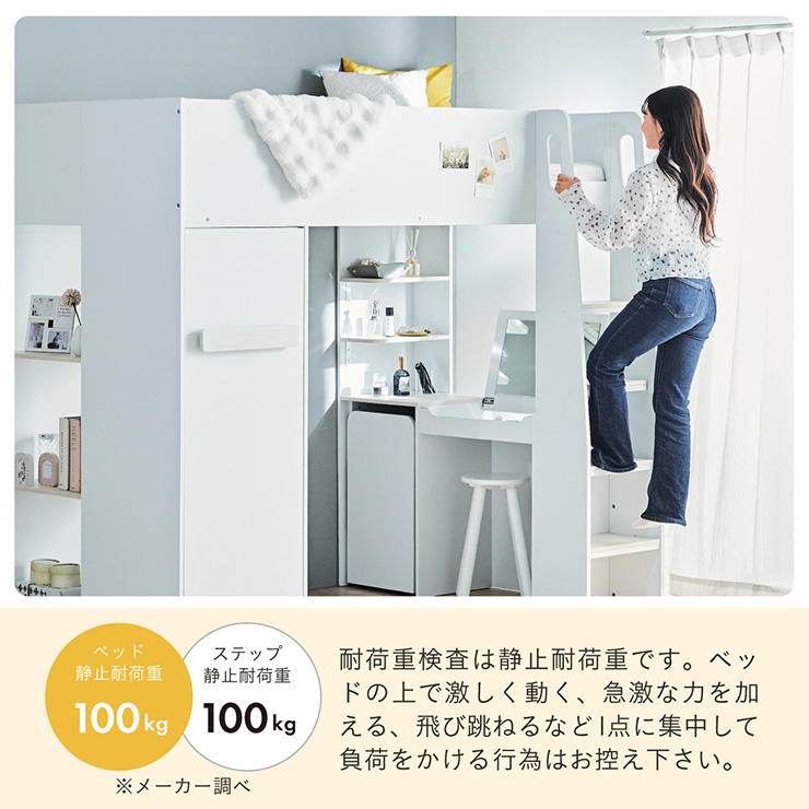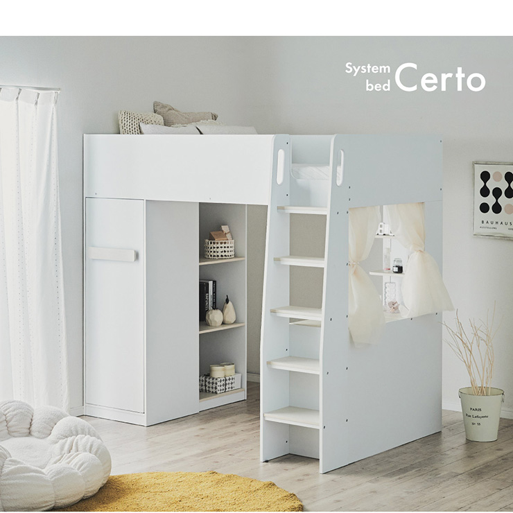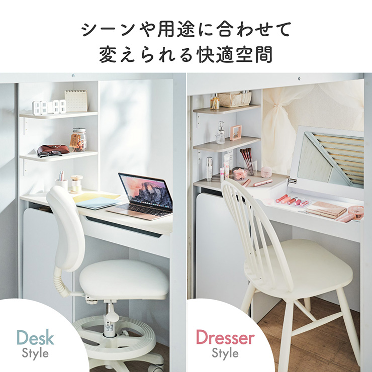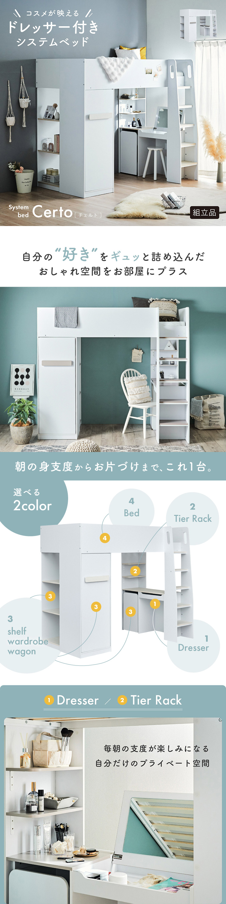 | コスメが映える ドレッサー付きシステムベッド Certo(チェルト) 自分の"好き"をギュッと詰め込んだおしゃれ空間をお部屋にプラス 朝の身支度からお片付けまで、これ1台。 ■顔周りまでしっかり映るワイドミラー メイクもヘアセットもサッと整う使いやすさにこだわったミラーです。 ■コスメや小物をすっきり整理できる天板下収納 一目で収納場所がわかるので、朝の支度もスムーズです。 ■ミラーはスロークローズ仕様 慌ただしい朝でも、ゆっくり静かに閉まるから安心♪ ※ソフトクローズは、天板を半分以上開いた状態から閉じる場合のみ作動します。半分以下の位置から閉じた場合は、ソフトクローズは働きません。 ■ミラーを閉じれば100cm×40cmの広々デスクとして使える2way仕様 ■メイク中にサッと手が届くラック お気に入りを並べて魅せる収納としても楽しめます。 ※棚板は固定棚となります。 ■シーズンや用途に合わせて変えられる快適空間 ■A4サイズの本や小物をたっぷり置ける広々シェルフ ※棚板は固定棚となります。 ■生活感を隠してスッキリ収納 整理しやすい縦長ワードローブで収納力も◎ ■使い勝手の良いワゴン ・ワイドな開口で取り出しやすい、たっぷり入る2段収納 ・使わないときはサッと収納して見た目もすっきり ・前後にだけ動かせるキャスターで周囲にぶつからず出し入れスムーズ ■商品詳細 ・ベッドフレーム高34cm ・上り下りしやすい幅違いのステップ ・つかみやすい取っ手 ・スチール製の補強フレーム ※こちらはお客様組み立てとなります。 ※組み立て方や若干の個体差によって、表記サイズと完成系のサイズに多少の誤差が生じる場合がございます。予めご了承ください。 ※こちらの商品はベッド本体のみの販売となります。マットレスは付属しておりません。 | |