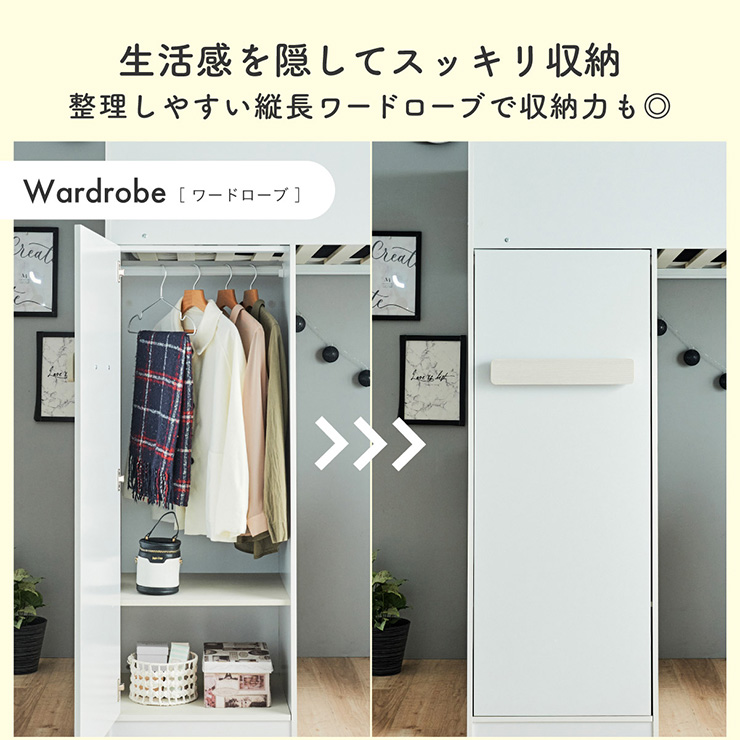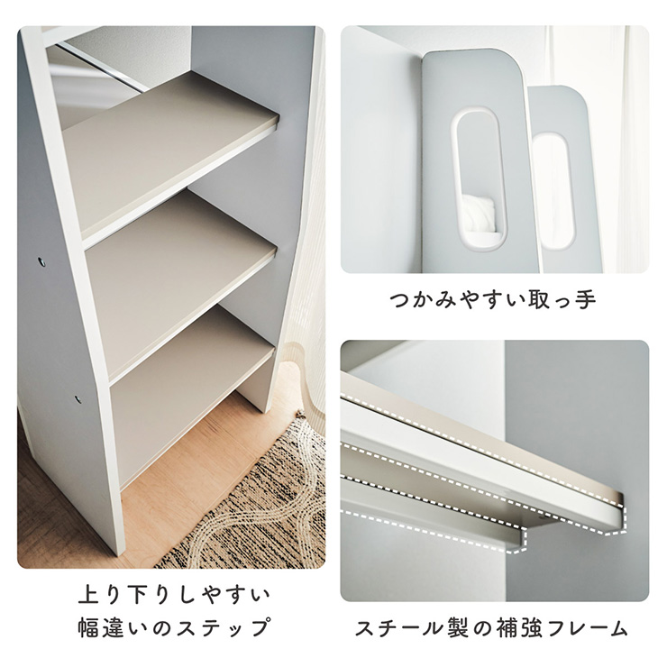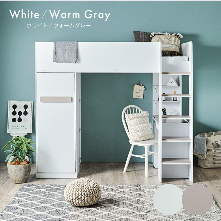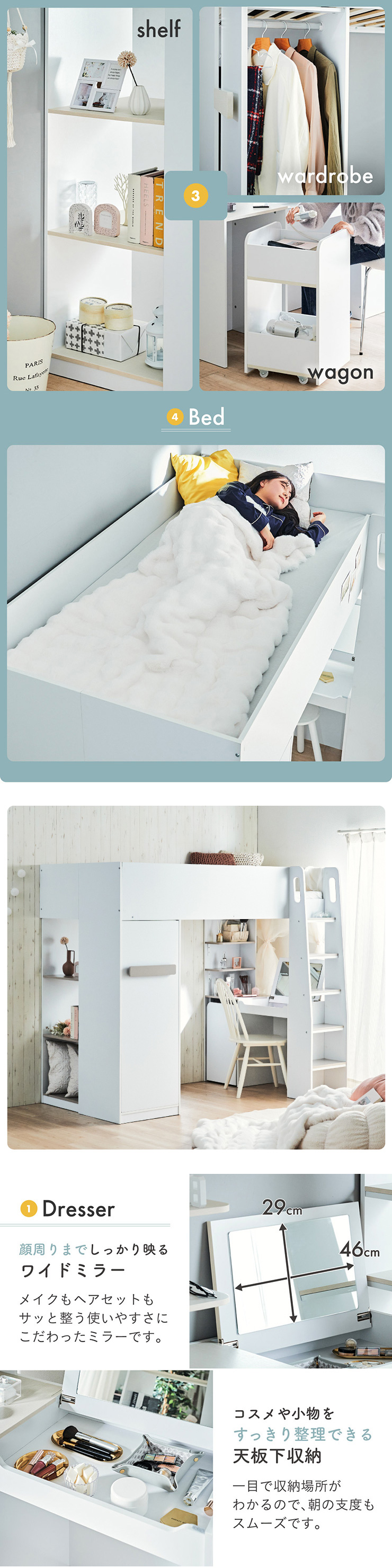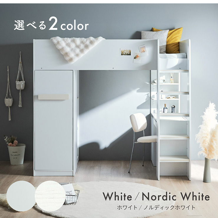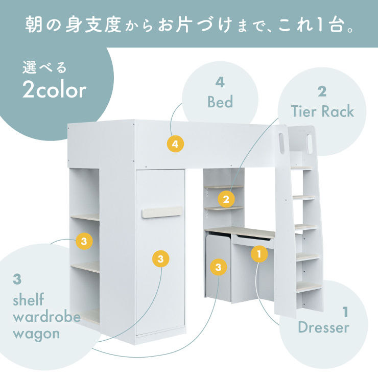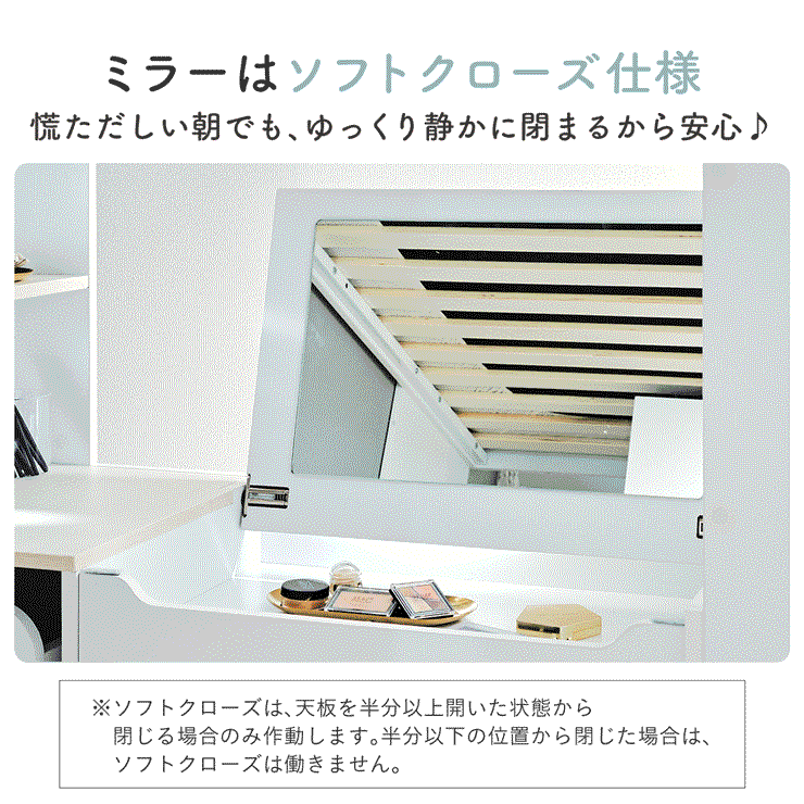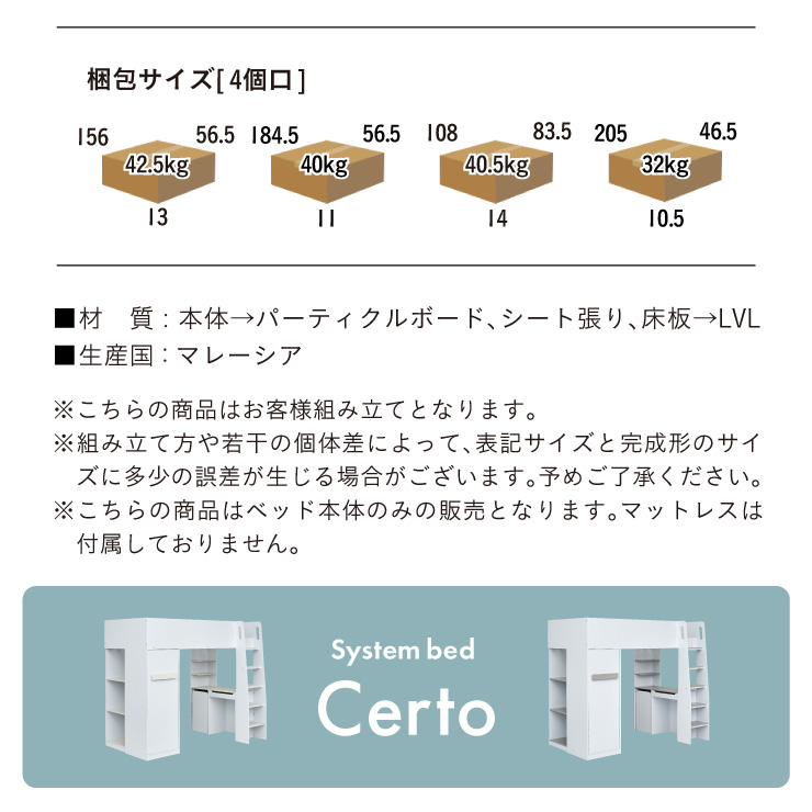 | コスメが映える ドレッサー付きシステムベッド Certo(チェルト) 自分の"好き"をギュッと詰め込んだおしゃれ空間をお部屋にプラス 朝の身支度からお片付けまで、これ1台。 ■顔周りまでしっかり映るワイドミラー メイクもヘアセットもサッと整う使いやすさにこだわったミラーです。 ■コスメや小物をすっきり整理できる天板下収納 一目で収納場所がわかるので、朝の支度もスムーズです。 ■ミラーはスロークローズ仕様 慌ただしい朝でも、ゆっくり静かに閉まるから安心♪ ※ソフトクローズは、天板を半分以上開いた状態から閉じる場合のみ作動します。半分以下の位置から閉じた場合は、ソフトクローズは働きません。 ■ミラーを閉じれば100cm×40cmの広々デスクとして使える2way仕様 ■メイク中にサッと手が届くラック お気に入りを並べて魅せる収納としても楽しめます。 ※棚板は固定棚となります。 ■シーズンや用途に合わせて変えられる快適空間 ■A4サイズの本や小物をたっぷり置ける広々シェルフ ※棚板は固定棚となります。 ■生活感を隠してスッキリ収納 整理しやすい縦長ワードローブで収納力も◎ ■使い勝手の良いワゴン ・ワイドな開口で取り出しやすい、たっぷり入る2段収納 ・使わないときはサッと収納して見た目もすっきり ・前後にだけ動かせるキャスターで周囲にぶつからず出し入れスムーズ ■商品詳細 ・ベッドフレーム高34cm ・上り下りしやすい幅違いのステップ ・つかみやすい取っ手 ・スチール製の補強フレーム ※こちらはお客様組み立てとなります。 ※組み立て方や若干の個体差によって、表記サイズと完成系のサイズに多少の誤差が生じる場合がございます。予めご了承ください。 ※こちらの商品はベッド本体のみの販売となります。マットレスは付属しておりません。 | |