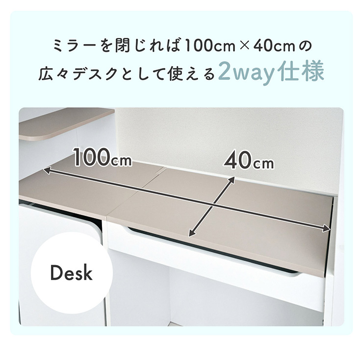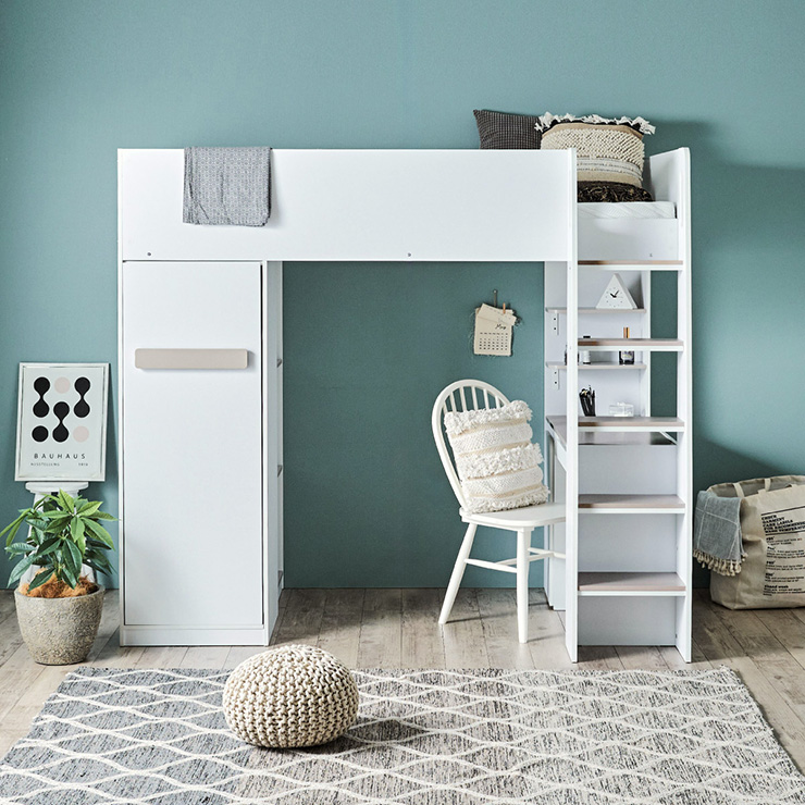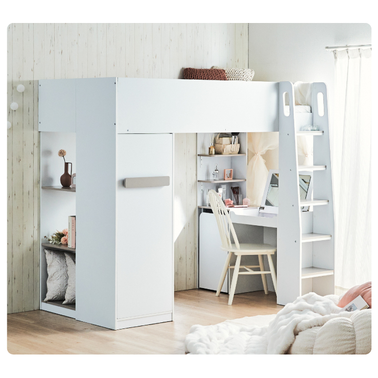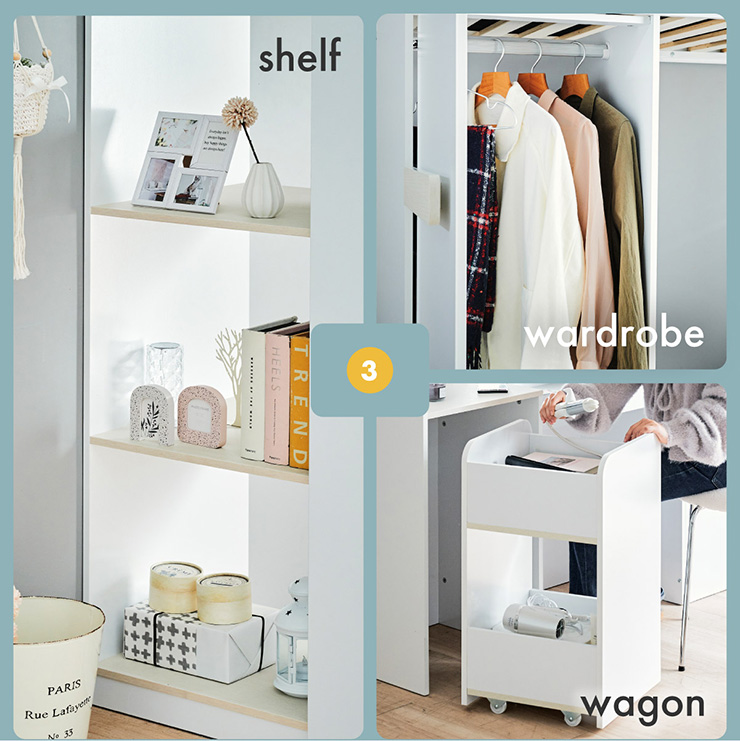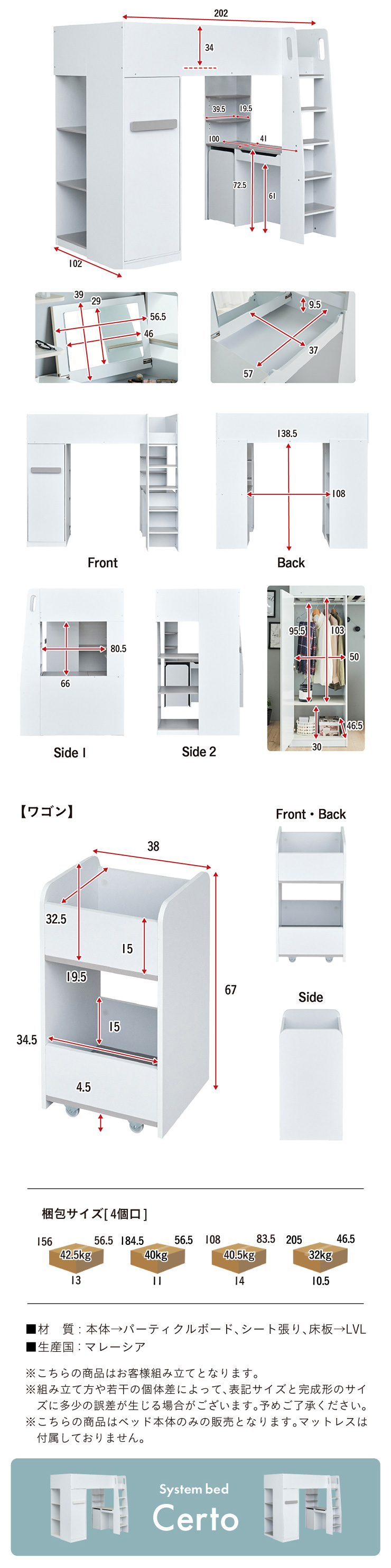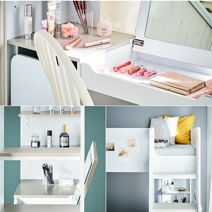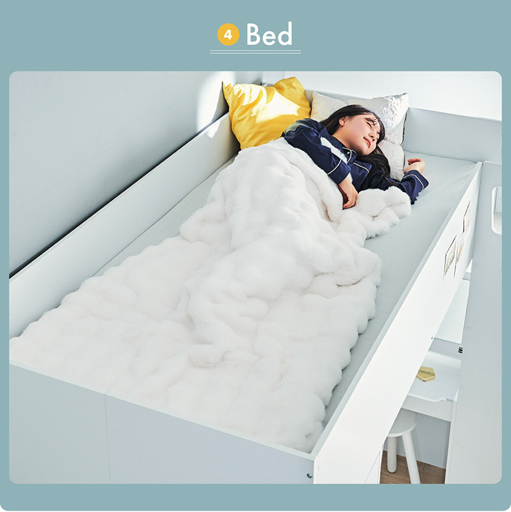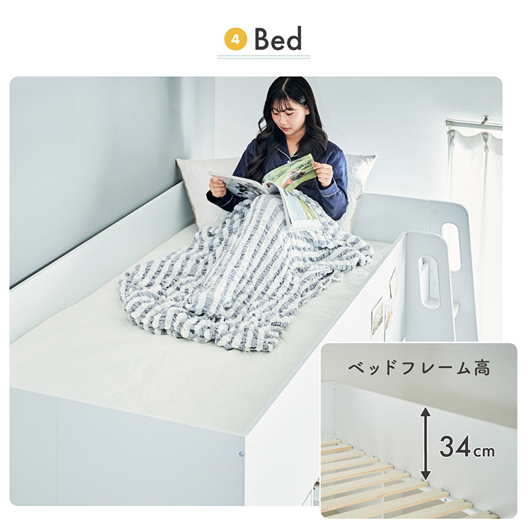 | コスメが映える ドレッサー付きシステムベッド Certo(チェルト) 自分の"好き"をギュッと詰め込んだおしゃれ空間をお部屋にプラス 朝の身支度からお片付けまで、これ1台。 ■顔周りまでしっかり映るワイドミラー メイクもヘアセットもサッと整う使いやすさにこだわったミラーです。 ■コスメや小物をすっきり整理できる天板下収納 一目で収納場所がわかるので、朝の支度もスムーズです。 ■ミラーはスロークローズ仕様 慌ただしい朝でも、ゆっくり静かに閉まるから安心♪ ※ソフトクローズは、天板を半分以上開いた状態から閉じる場合のみ作動します。半分以下の位置から閉じた場合は、ソフトクローズは働きません。 ■ミラーを閉じれば100cm×40cmの広々デスクとして使える2way仕様 ■メイク中にサッと手が届くラック お気に入りを並べて魅せる収納としても楽しめます。 ※棚板は固定棚となります。 ■シーズンや用途に合わせて変えられる快適空間 ■A4サイズの本や小物をたっぷり置ける広々シェルフ ※棚板は固定棚となります。 ■生活感を隠してスッキリ収納 整理しやすい縦長ワードローブで収納力も◎ ■使い勝手の良いワゴン ・ワイドな開口で取り出しやすい、たっぷり入る2段収納 ・使わないときはサッと収納して見た目もすっきり ・前後にだけ動かせるキャスターで周囲にぶつからず出し入れスムーズ ■商品詳細 ・ベッドフレーム高34cm ・上り下りしやすい幅違いのステップ ・つかみやすい取っ手 ・スチール製の補強フレーム ※こちらはお客様組み立てとなります。 ※組み立て方や若干の個体差によって、表記サイズと完成系のサイズに多少の誤差が生じる場合がございます。予めご了承ください。 ※こちらの商品はベッド本体のみの販売となります。マットレスは付属しておりません。 | |