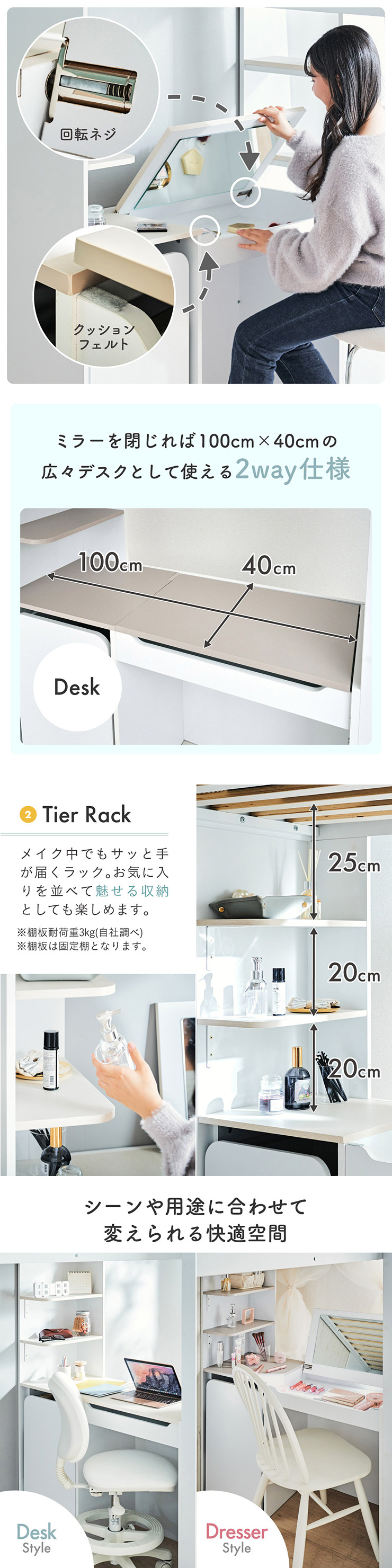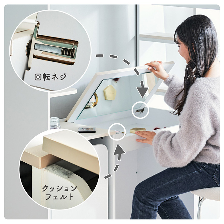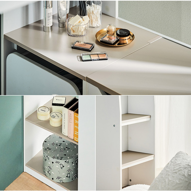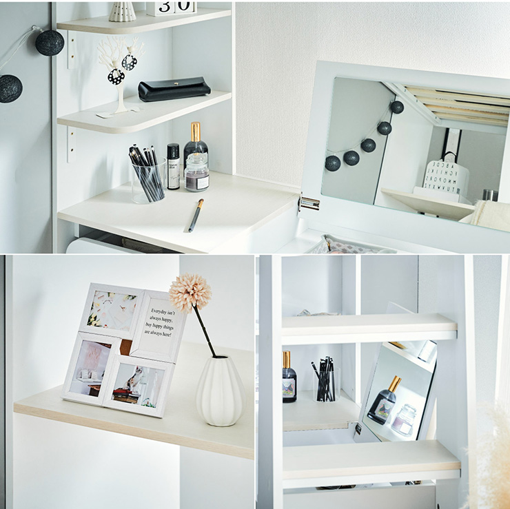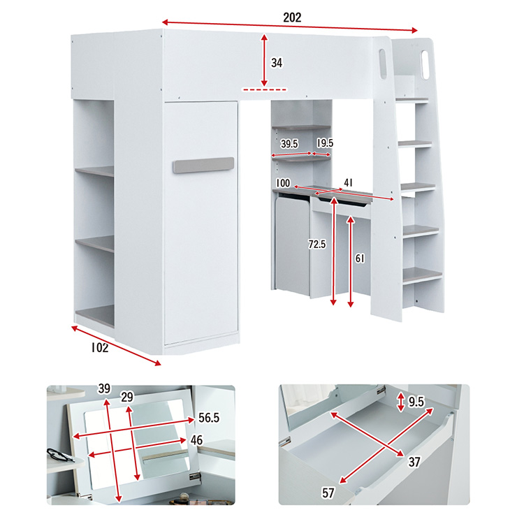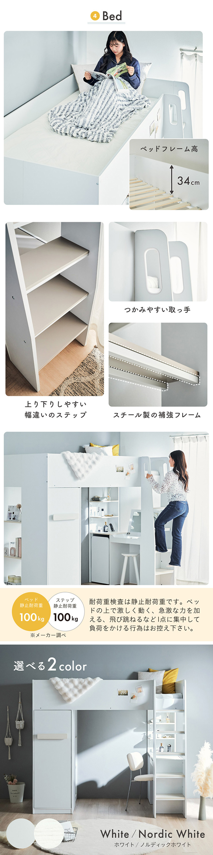 | コスメが映える ドレッサー付きシステムベッド Certo(チェルト) 自分の"好き"をギュッと詰め込んだおしゃれ空間をお部屋にプラス 朝の身支度からお片付けまで、これ1台。 ■顔周りまでしっかり映るワイドミラー メイクもヘアセットもサッと整う使いやすさにこだわったミラーです。 ■コスメや小物をすっきり整理できる天板下収納 一目で収納場所がわかるので、朝の支度もスムーズです。 ■ミラーはスロークローズ仕様 慌ただしい朝でも、ゆっくり静かに閉まるから安心♪ ※ソフトクローズは、天板を半分以上開いた状態から閉じる場合のみ作動します。半分以下の位置から閉じた場合は、ソフトクローズは働きません。 ■ミラーを閉じれば100cm×40cmの広々デスクとして使える2way仕様 ■メイク中にサッと手が届くラック お気に入りを並べて魅せる収納としても楽しめます。 ※棚板は固定棚となります。 ■シーズンや用途に合わせて変えられる快適空間 ■A4サイズの本や小物をたっぷり置ける広々シェルフ ※棚板は固定棚となります。 ■生活感を隠してスッキリ収納 整理しやすい縦長ワードローブで収納力も◎ ■使い勝手の良いワゴン ・ワイドな開口で取り出しやすい、たっぷり入る2段収納 ・使わないときはサッと収納して見た目もすっきり ・前後にだけ動かせるキャスターで周囲にぶつからず出し入れスムーズ ■商品詳細 ・ベッドフレーム高34cm ・上り下りしやすい幅違いのステップ ・つかみやすい取っ手 ・スチール製の補強フレーム ※こちらはお客様組み立てとなります。 ※組み立て方や若干の個体差によって、表記サイズと完成系のサイズに多少の誤差が生じる場合がございます。予めご了承ください。 ※こちらの商品はベッド本体のみの販売となります。マットレスは付属しておりません。 | |