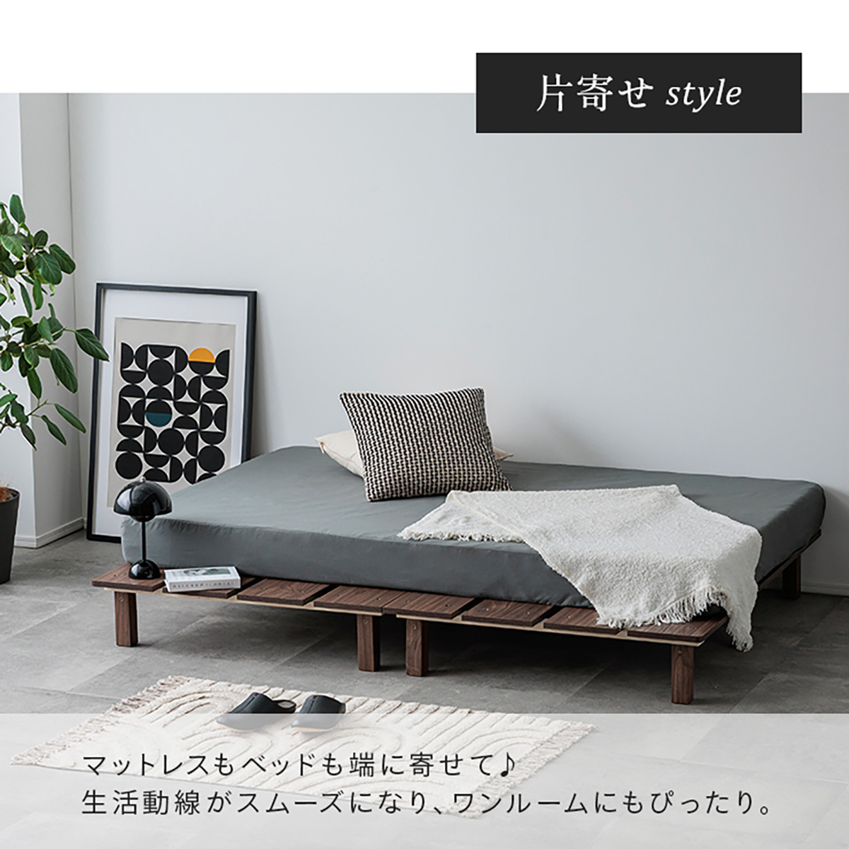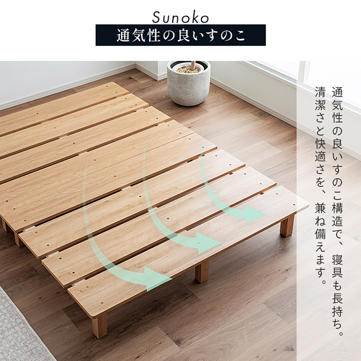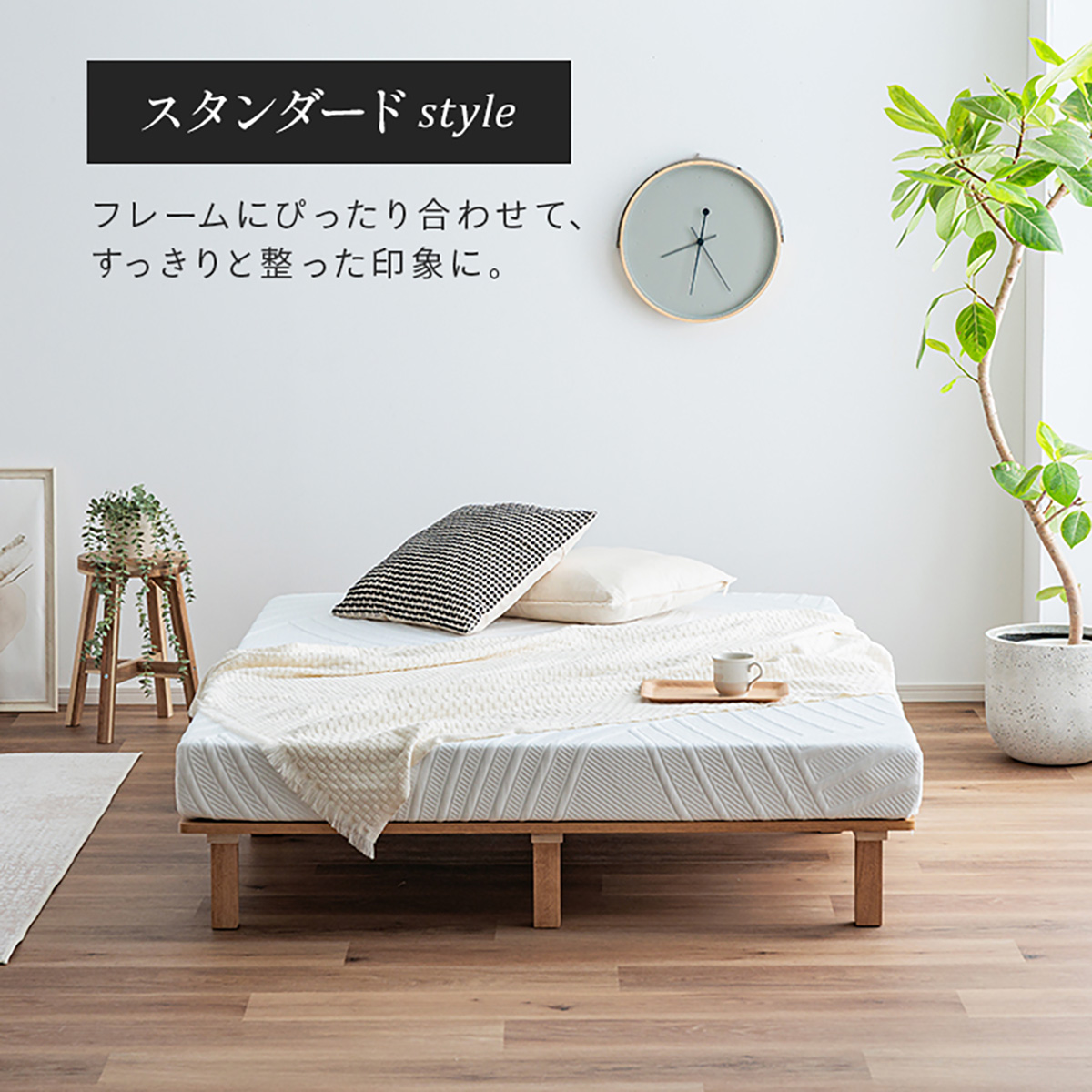 | ステージベッド Soares(ソアレ)+マットレス Ciel(シエル) 現代の暮らしにちょうどいいステージベッド ■美しい木目調 少しマットな質感と温かみある木目調が織りなす、洗礼デザイン ■無駄のないシンプルデザイン すっきりと見せてくれる直線的なフレーム ・床面の空きスペースは、スマホの充電やメガネや本などの小物置きに! ・ベッド下スペースがあるのでお掃除ロボットOK!床下収納にもお使いいただけます。 ■レイアウト自由自在 ヘッドレスだから、壁付けも中央配置もOKなフレキシブルベッド マットレスの置き方やレイアウトで様々なスタイルが可能です。 ■開放感のあるロースタイル 限られたスペースにも、余白を生むデザイン。低めの設計が、天井を高く感じさせ、視線を緩やかに。 ■通気性の良いすのこ 通気性の良いすのこ構造で、寝具も長持ち。清潔さと快適さを、兼ね備えます。 ■敷布団の使用もOK!耐荷重200kg、安定構想 頑丈なつくりで、安定性も確保。安心して使える強さを両立しました。 ■暮らしやすさを両立 ・面取り加工 ・脚部フェルト付き ※サイズの商品画像はSDサイズを使用しております。 ※こちらの商品はお客様組み立てとなります。 ※組み立て方や若干の個体差によって、表記サイズと完成形のサイズに多少の誤差が生じる場合がございます。予めご了承ください。 ※マットレスの幅をぴったりに置きたい場合、1サイズ上げたサイズをご購入ください。 ※お掃除ロボットを使用する場合は、高さをご確認ください。 ※圧縮袋は一度開封すると再圧縮できません。 ※開封する際はハサミを使用し、ケガ等に十分気をつけながら行ってください。 ※開封後約1~2日で本来の大きさに復元します。 ※サイズには多少の誤差が生じる場合がございます。 ※マットレスを干す際、日光にさらし続けると変色を起こす恐れがありますので、ご注意ください。 ※布団乾燥機のご使用はお避け下さい。 ※普段のお手入れは、柔らかい布地で乾拭きしてください。 ※ご使用の際にはカバーや敷きバッド等を合わせてお使い下さい。 ※商品ページの画像内には一部サイズ違いのものを使用しております。 ※マットレスは3か月を目安に頭と足元側を回転して、入れ替えていただくことをおすすめします。また喚起をこまめに行うことで、より長くお使いいただけます。 ※当マットレスは片面仕様です。裏返してご使用はできません。 | |