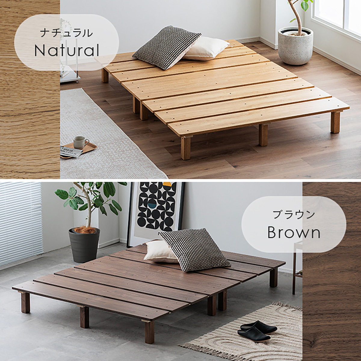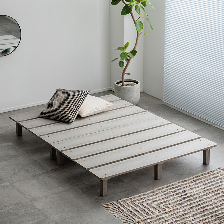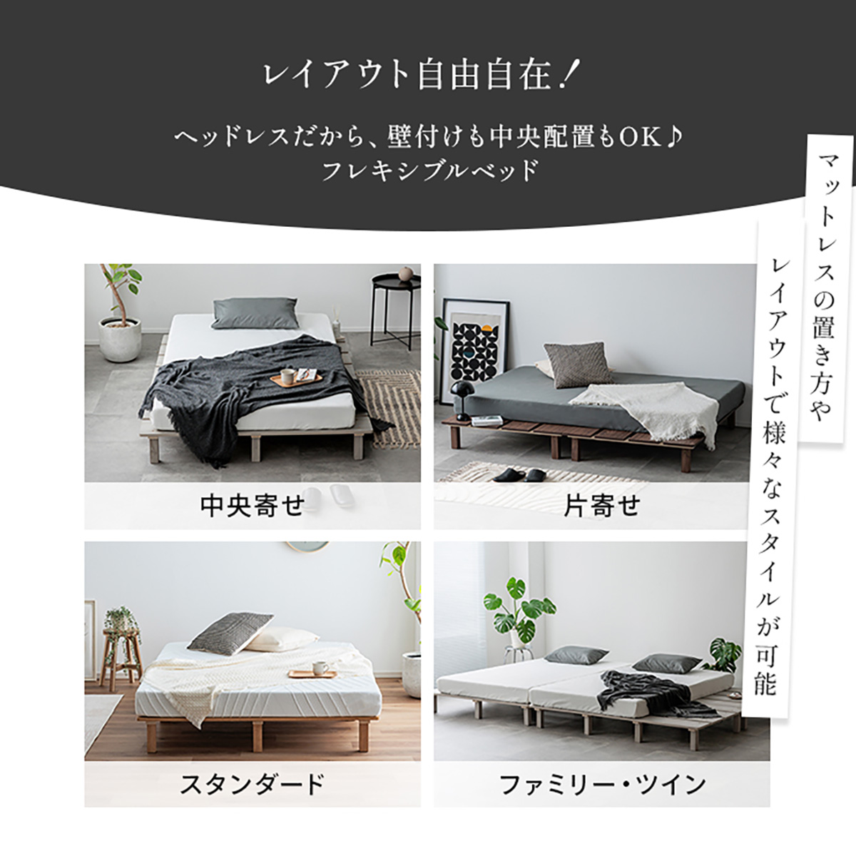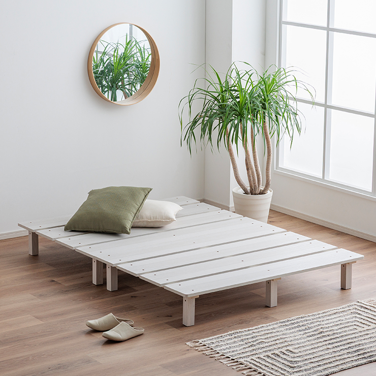 | ステージベッド Soares(ソアレ)+マットレス Ciel(シエル) 現代の暮らしにちょうどいいステージベッド ■美しい木目調 少しマットな質感と温かみある木目調が織りなす、洗礼デザイン ■無駄のないシンプルデザイン すっきりと見せてくれる直線的なフレーム ・床面の空きスペースは、スマホの充電やメガネや本などの小物置きに! ・ベッド下スペースがあるのでお掃除ロボットOK!床下収納にもお使いいただけます。 ■レイアウト自由自在 ヘッドレスだから、壁付けも中央配置もOKなフレキシブルベッド マットレスの置き方やレイアウトで様々なスタイルが可能です。 ■開放感のあるロースタイル 限られたスペースにも、余白を生むデザイン。低めの設計が、天井を高く感じさせ、視線を緩やかに。 ■通気性の良いすのこ 通気性の良いすのこ構造で、寝具も長持ち。清潔さと快適さを、兼ね備えます。 ■敷布団の使用もOK!耐荷重200kg、安定構想 頑丈なつくりで、安定性も確保。安心して使える強さを両立しました。 ■暮らしやすさを両立 ・面取り加工 ・脚部フェルト付き ※サイズの商品画像はSDサイズを使用しております。 ※こちらの商品はお客様組み立てとなります。 ※組み立て方や若干の個体差によって、表記サイズと完成形のサイズに多少の誤差が生じる場合がございます。予めご了承ください。 ※マットレスの幅をぴったりに置きたい場合、1サイズ上げたサイズをご購入ください。 ※お掃除ロボットを使用する場合は、高さをご確認ください。 ※圧縮袋は一度開封すると再圧縮できません。 ※開封する際はハサミを使用し、ケガ等に十分気をつけながら行ってください。 ※開封後約1~2日で本来の大きさに復元します。 ※サイズには多少の誤差が生じる場合がございます。 ※マットレスを干す際、日光にさらし続けると変色を起こす恐れがありますので、ご注意ください。 ※布団乾燥機のご使用はお避け下さい。 ※普段のお手入れは、柔らかい布地で乾拭きしてください。 ※ご使用の際にはカバーや敷きバッド等を合わせてお使い下さい。 ※商品ページの画像内には一部サイズ違いのものを使用しております。 ※マットレスは3か月を目安に頭と足元側を回転して、入れ替えていただくことをおすすめします。また喚起をこまめに行うことで、より長くお使いいただけます。 ※当マットレスは片面仕様です。裏返してご使用はできません。 | |