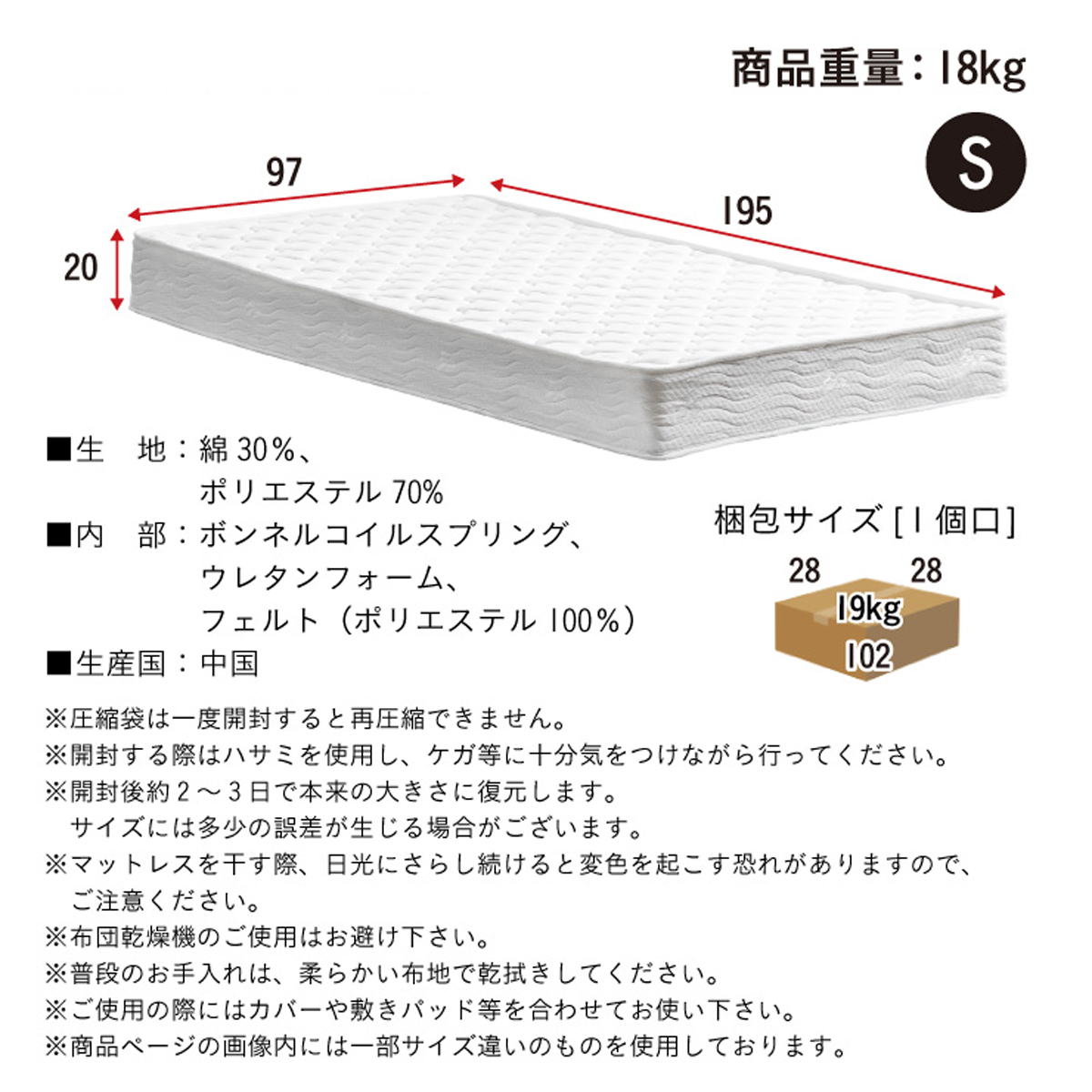 | 材質・素材 | 【ベッド】 MDF・強化シート貼り 【マットレス】 生地:綿30%・ポリエステル70% 内部:ボンネルコイルスプリング・ウレタンフォーム・フェルト(ポリエステル100%) |