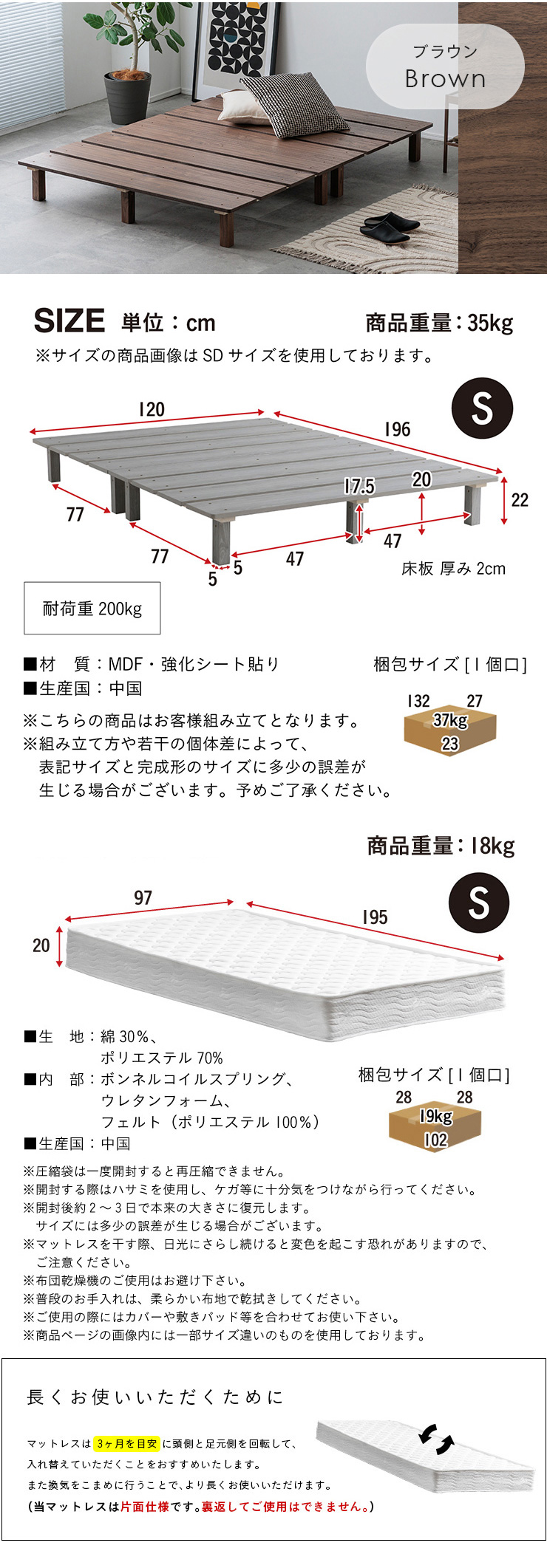 | サイズ | 【ベッド】 本体:約W120 x D196 x H22cm(重量:約35kg) 床板の厚み:約2cm 耐荷重:200kg 梱包サイズ:約132 x 27 x 23cm(重量:約37kg) 【マットレス】 本体:約W97 x D195 x H20cm(重量:約18kg) 梱包サイズ:約28 x 28 x 102cm(重量:約19kg) |