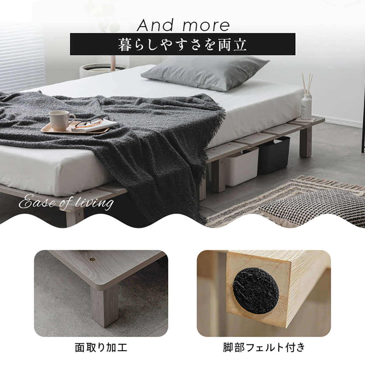 | ステージベッド Soares(ソアレ)+マットレス Ciel(シエル) 現代の暮らしにちょうどいいステージベッド ■美しい木目調 少しマットな質感と温かみある木目調が織りなす、洗礼デザイン ■無駄のないシンプルデザイン すっきりと見せてくれる直線的なフレーム ・床面の空きスペースは、スマホの充電やメガネや本などの小物置きに! ・ベッド下スペースがあるのでお掃除ロボットOK!床下収納にもお使いいただけます。 ■レイアウト自由自在 ヘッドレスだから、壁付けも中央配置もOKなフレキシブルベッド マットレスの置き方やレイアウトで様々なスタイルが可能です。 ■開放感のあるロースタイル 限られたスペースにも、余白を生むデザイン。低めの設計が、天井を高く感じさせ、視線を緩やかに。 ■通気性の良いすのこ 通気性の良いすのこ構造で、寝具も長持ち。清潔さと快適さを、兼ね備えます。 ■敷布団の使用もOK!耐荷重200kg、安定構想 頑丈なつくりで、安定性も確保。安心して使える強さを両立しました。 ■暮らしやすさを両立 ・面取り加工 ・脚部フェルト付き ※こちらの商品はお客様組み立てとなります。 ※組み立て方や若干の個体差によって、表記サイズと完成形のサイズに多少の誤差が生じる場合がございます。予めご了承ください。 ※マットレスの幅をぴったりに置きたい場合、1サイズ上げたサイズをご購入ください。 ※お掃除ロボットを使用する場合は、高さをご確認ください。 ※圧縮袋は一度開封すると再圧縮できません。 ※開封する際はハサミを使用し、ケガ等に十分気をつけながら行ってください。 ※開封後約1~2日で本来の大きさに復元します。 ※サイズには多少の誤差が生じる場合がございます。 ※マットレスを干す際、日光にさらし続けると変色を起こす恐れがありますので、ご注意ください。 ※布団乾燥機のご使用はお避け下さい。 ※普段のお手入れは、柔らかい布地で乾拭きしてください。 ※ご使用の際にはカバーや敷きバッド等を合わせてお使い下さい。 ※商品ページの画像内には一部サイズ違いのものを使用しております。 ※マットレスは3か月を目安に頭と足元側を回転して、入れ替えていただくことをおすすめします。また喚起をこまめに行うことで、より長くお使いいただけます。 ※当マットレスは片面仕様です。裏返してご使用はできません。 | |