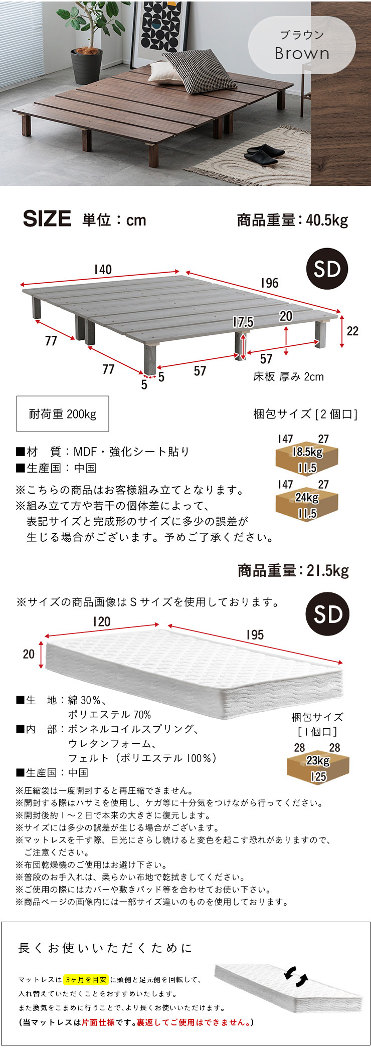 | サイズ | 本体:約W140 x D196 x H22cm(重量:約40.5kg) 床板の厚み:約2cm 耐荷重:200kg 梱包サイズ:約147 x 27 x 11.5cm(重量:約18.5kg)・約147 x 27 x 11.5cm(重量:約24kg) 【マットレス】 本体:約W120 x D195 x H20cm(重量:約21.5kg) 梱包サイズ:約28 x 28 x 125cm(重量:約23kg) |