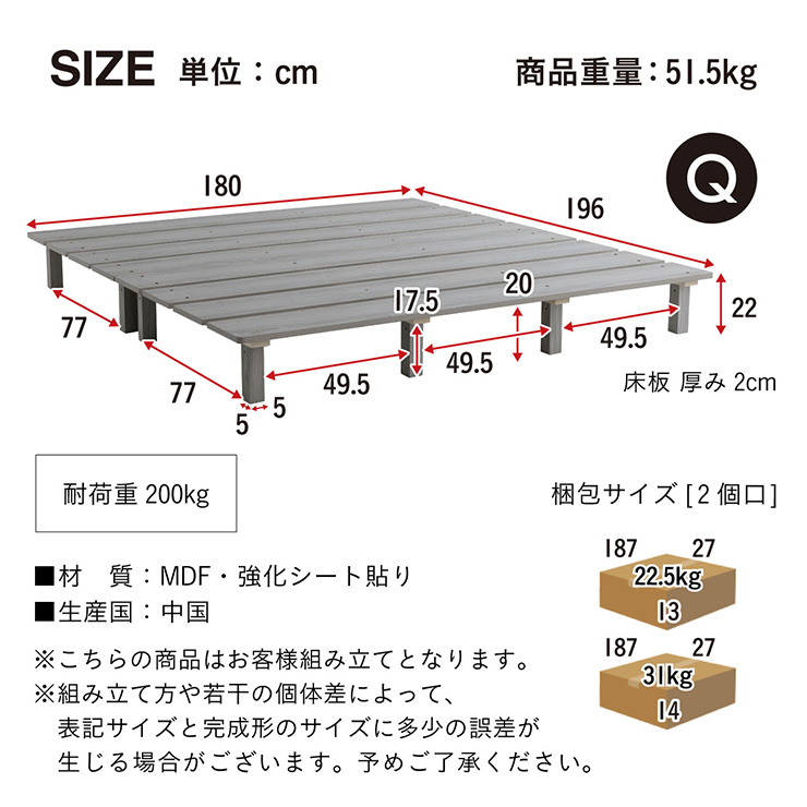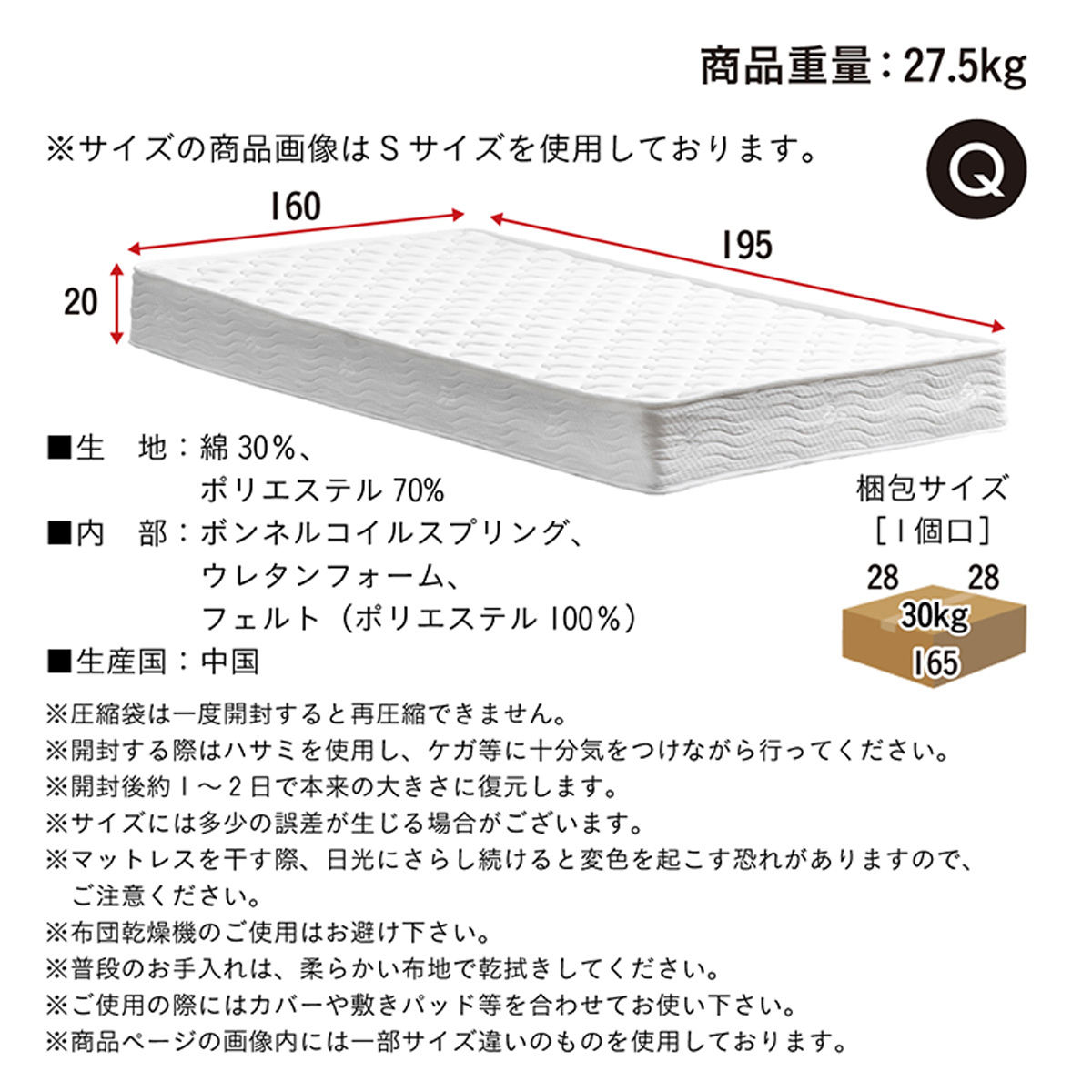 | サイズ | 【ベッド】 本体:約W180 x D196 x H22cm(重量:約51.5kg) 床板の厚み:約2cm 耐荷重:200kg 梱包サイズ:約187 x 27 x 13cm(重量:約22.5kg)・約187 x 27 x 14cm(重量:約31kg) 【マットレス】 本体:約W160 x D195 x H20cm(重量:約27.5kg) 梱包サイズ:約28 x 28 x 165cm(重量:約30kg) |