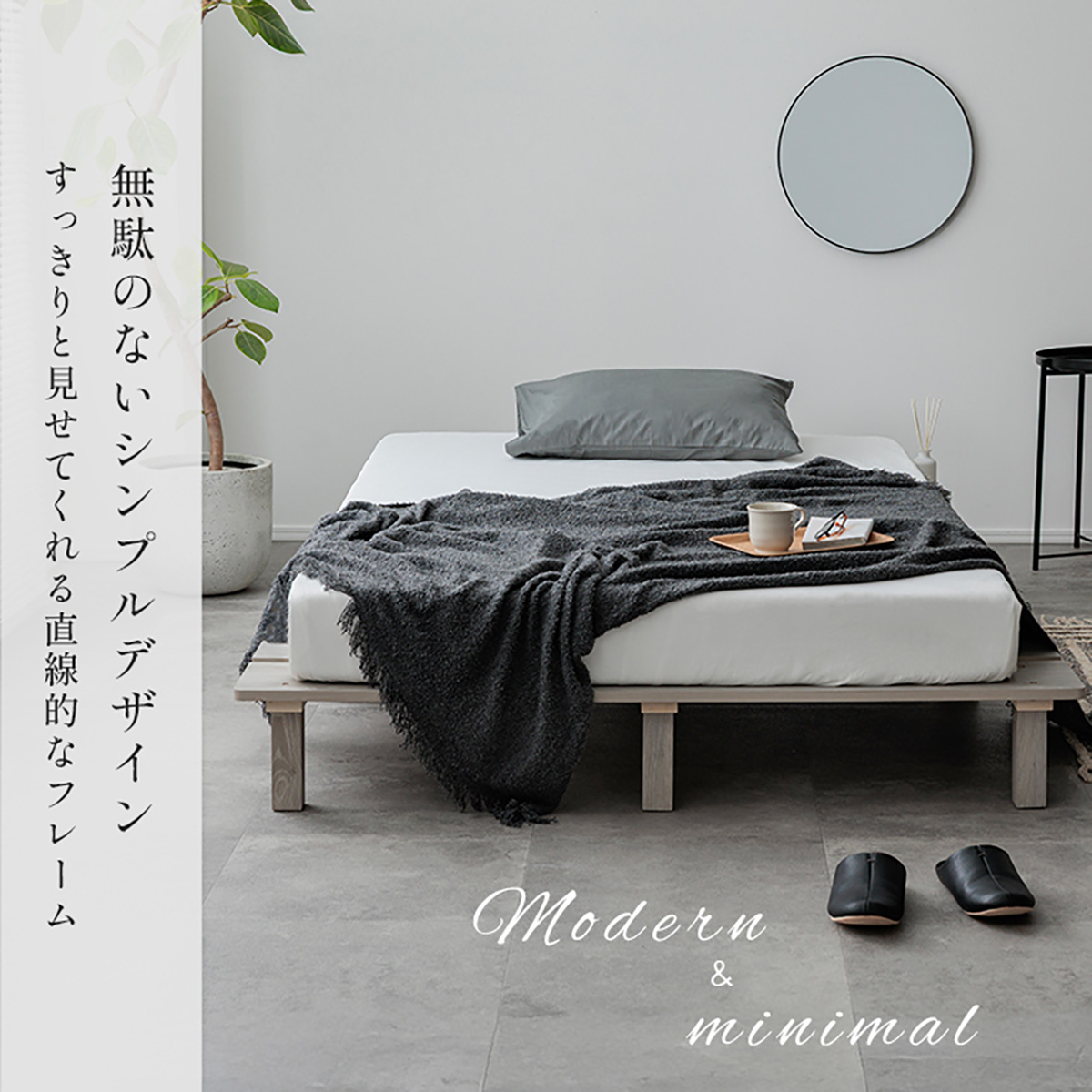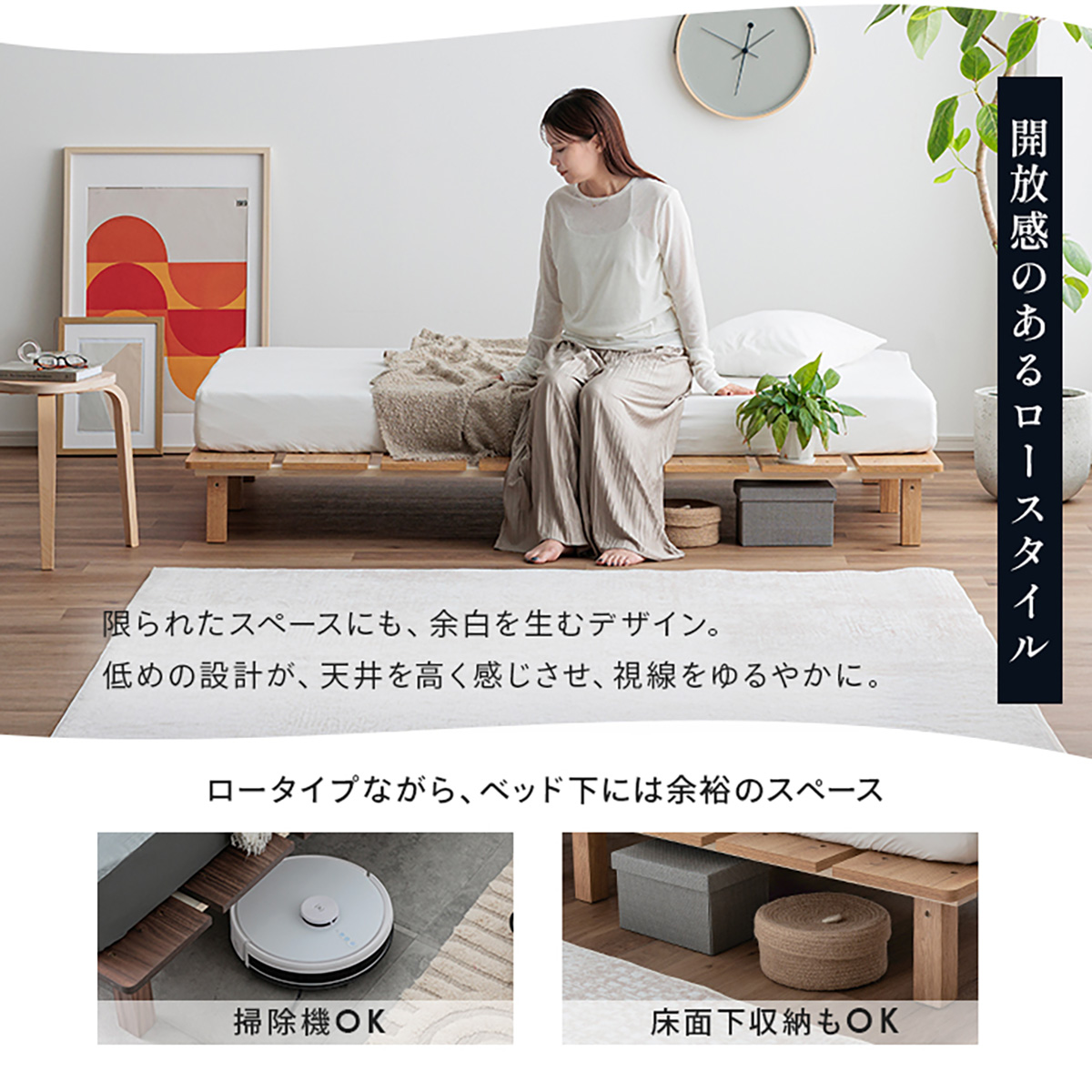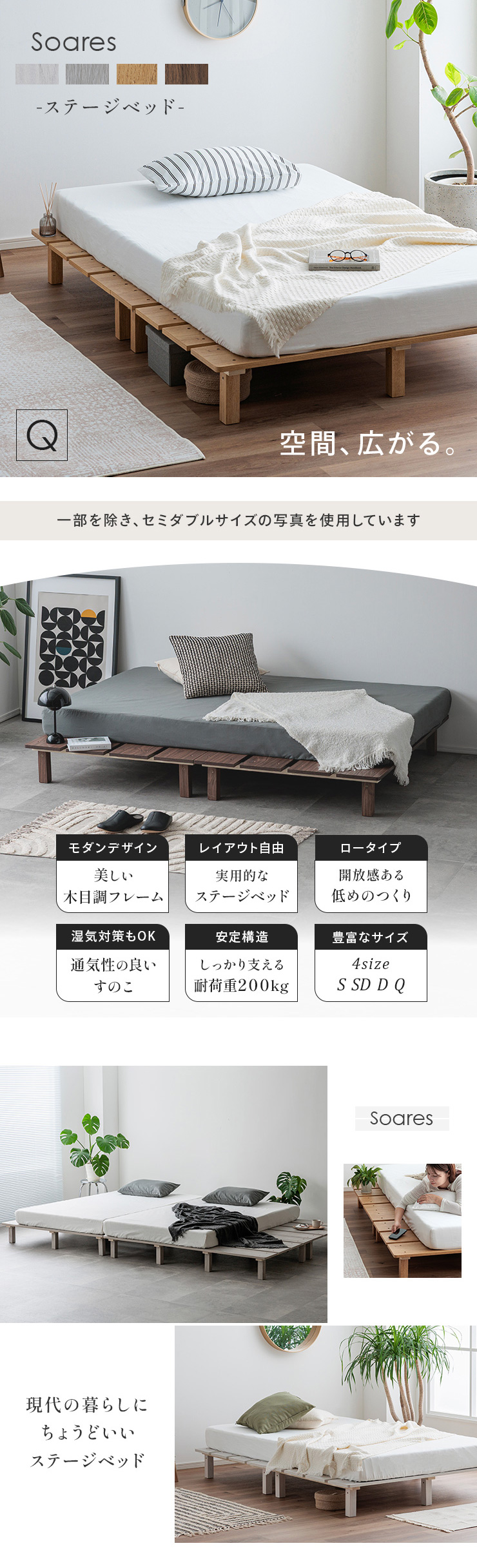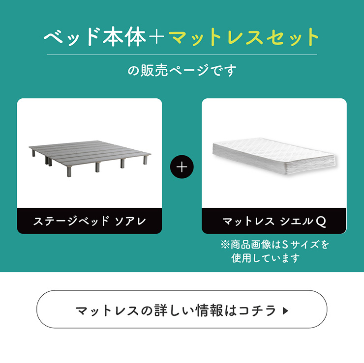 | ステージベッド Soares(ソアレ)+マットレス Ciel(シエル) 現代の暮らしにちょうどいいステージベッド ■美しい木目調 少しマットな質感と温かみある木目調が織りなす、洗礼デザイン ■無駄のないシンプルデザイン すっきりと見せてくれる直線的なフレーム ・床面の空きスペースは、スマホの充電やメガネや本などの小物置きに! ・ベッド下スペースがあるのでお掃除ロボットOK!床下収納にもお使いいただけます。 ■レイアウト自由自在 ヘッドレスだから、壁付けも中央配置もOKなフレキシブルベッド マットレスの置き方やレイアウトで様々なスタイルが可能です。 ■開放感のあるロースタイル 限られたスペースにも、余白を生むデザイン。低めの設計が、天井を高く感じさせ、視線を緩やかに。 ■通気性の良いすのこ 通気性の良いすのこ構造で、寝具も長持ち。清潔さと快適さを、兼ね備えます。 ■敷布団の使用もOK!耐荷重200kg、安定構想 頑丈なつくりで、安定性も確保。安心して使える強さを両立しました。 ■暮らしやすさを両立 ・面取り加工 ・脚部フェルト付き ※こちらの商品はお客様組み立てとなります。 ※組み立て方や若干の個体差によって、表記サイズと完成形のサイズに多少の誤差が生じる場合がございます。予めご了承ください。 ※マットレスの幅をぴったりに置きたい場合、1サイズ上げたサイズをご購入ください。 ※お掃除ロボットを使用する場合は、高さをご確認ください。 ※圧縮袋は一度開封すると再圧縮できません。 ※開封する際はハサミを使用し、ケガ等に十分気をつけながら行ってください。 ※開封後約1~2日で本来の大きさに復元します。 ※サイズには多少の誤差が生じる場合がございます。 ※マットレスを干す際、日光にさらし続けると変色を起こす恐れがありますので、ご注意ください。 ※布団乾燥機のご使用はお避け下さい。 ※普段のお手入れは、柔らかい布地で乾拭きしてください。 ※ご使用の際にはカバーや敷きバッド等を合わせてお使い下さい。 ※商品ページの画像内には一部サイズ違いのものを使用しております。 ※マットレスは3か月を目安に頭と足元側を回転して、入れ替えていただくことをおすすめします。また喚起をこまめに行うことで、より長くお使いいただけます。 ※当マットレスは片面仕様です。裏返してご使用はできません。 | |