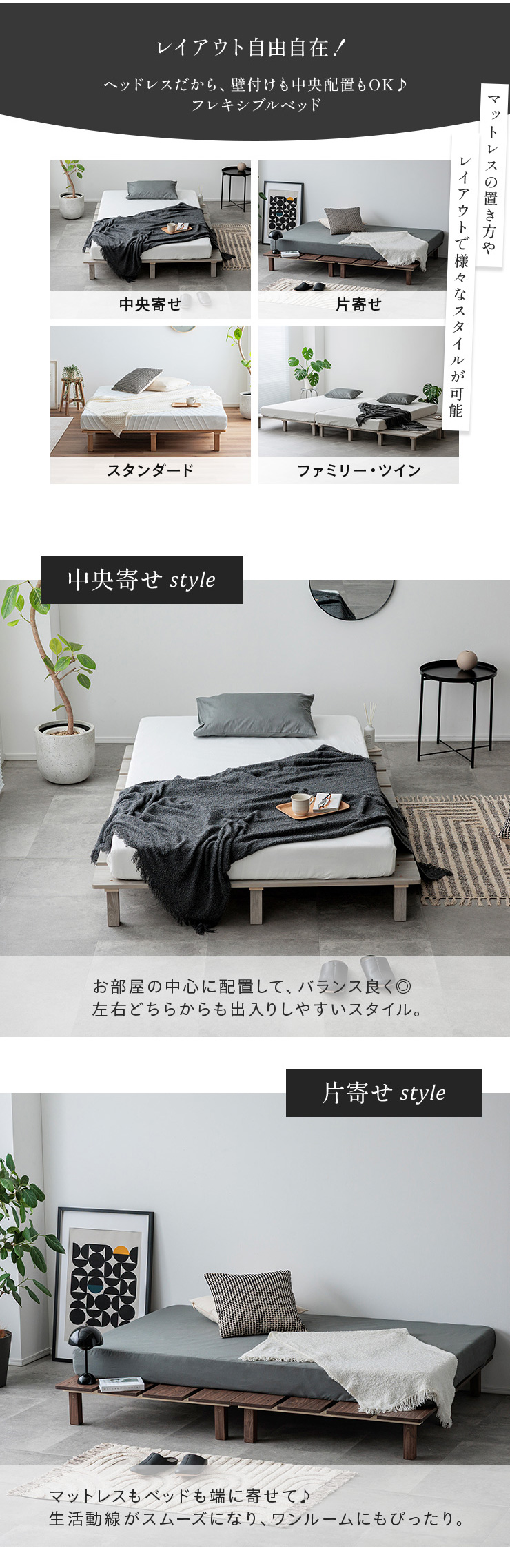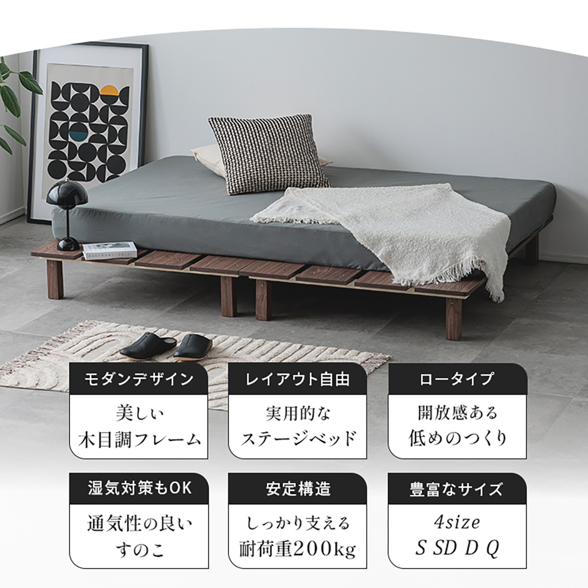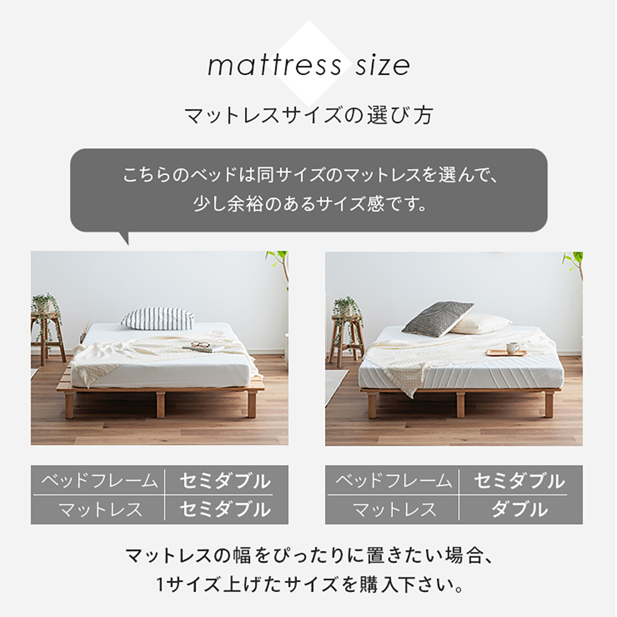 | ステージベッド Soares(ソアレ)+マットレス Ciel(シエル) 現代の暮らしにちょうどいいステージベッド ■美しい木目調 少しマットな質感と温かみある木目調が織りなす、洗礼デザイン ■無駄のないシンプルデザイン すっきりと見せてくれる直線的なフレーム ・床面の空きスペースは、スマホの充電やメガネや本などの小物置きに! ・ベッド下スペースがあるのでお掃除ロボットOK!床下収納にもお使いいただけます。 ■レイアウト自由自在 ヘッドレスだから、壁付けも中央配置もOKなフレキシブルベッド マットレスの置き方やレイアウトで様々なスタイルが可能です。 ■開放感のあるロースタイル 限られたスペースにも、余白を生むデザイン。低めの設計が、天井を高く感じさせ、視線を緩やかに。 ■通気性の良いすのこ 通気性の良いすのこ構造で、寝具も長持ち。清潔さと快適さを、兼ね備えます。 ■敷布団の使用もOK!耐荷重200kg、安定構想 頑丈なつくりで、安定性も確保。安心して使える強さを両立しました。 ■暮らしやすさを両立 ・面取り加工 ・脚部フェルト付き ※こちらの商品はお客様組み立てとなります。 ※組み立て方や若干の個体差によって、表記サイズと完成形のサイズに多少の誤差が生じる場合がございます。予めご了承ください。 ※マットレスの幅をぴったりに置きたい場合、1サイズ上げたサイズをご購入ください。 ※お掃除ロボットを使用する場合は、高さをご確認ください。 ※圧縮袋は一度開封すると再圧縮できません。 ※開封する際はハサミを使用し、ケガ等に十分気をつけながら行ってください。 ※開封後約1~2日で本来の大きさに復元します。 ※サイズには多少の誤差が生じる場合がございます。 ※マットレスを干す際、日光にさらし続けると変色を起こす恐れがありますので、ご注意ください。 ※布団乾燥機のご使用はお避け下さい。 ※普段のお手入れは、柔らかい布地で乾拭きしてください。 ※ご使用の際にはカバーや敷きバッド等を合わせてお使い下さい。 ※商品ページの画像内には一部サイズ違いのものを使用しております。 ※マットレスは3か月を目安に頭と足元側を回転して、入れ替えていただくことをおすすめします。また喚起をこまめに行うことで、より長くお使いいただけます。 ※当マットレスは片面仕様です。裏返してご使用はできません。 | |