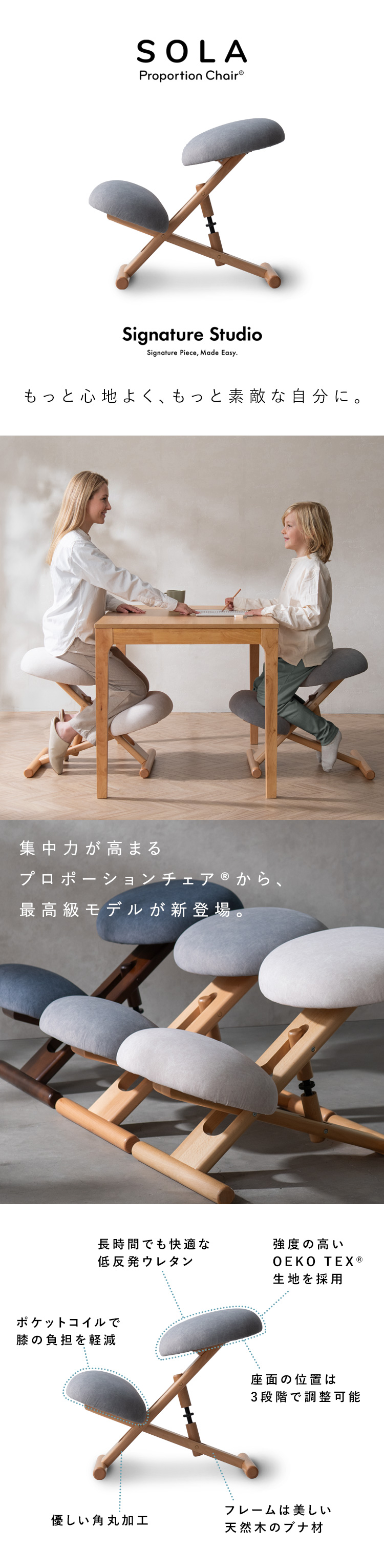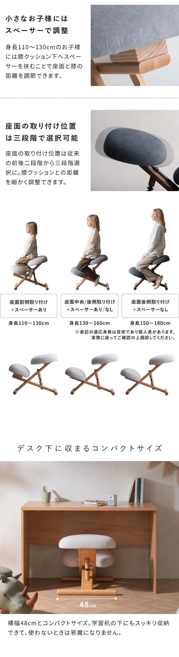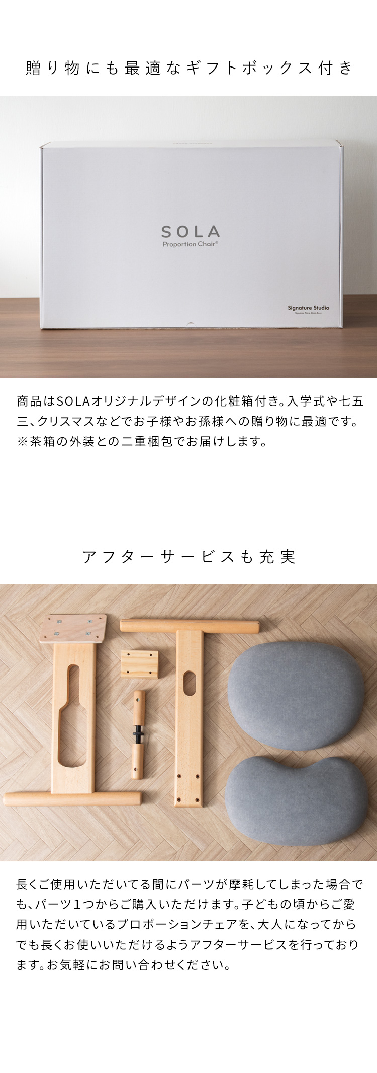 | プロポーションチェア(R) SOLA(ソラ) 座るだけで自然と背筋が伸び集中しやすい「プロモーションチェア」の上位モデルとして、空のような軽さと静けさを目指して生まれました。 子供から大人まで更なる心地いい体験を通して、素敵な自分への変化をサポートします。 ■座面クッション 低反発ウレタンを採用しており、優れた体圧分散性能により、身体への負担を軽減し長時間使用しやすくなっております。 低反発ウレタンの下は程よいクッション性のウレタンと耐久性に優れたチップウレタンを重ねた三層構造です。 ■膝クッション 膝クッションにポケットコイルを採用しており、ポケットコイルを耐久性に優れたチップウレタンで囲み、ウレタンで包み込んだ構造。 従来より体圧分散性能が高くなったため、膝への負担を和らげられるため、より長時間集中しやすくなっております。 ■ファブリック サラリとした心地いい生地は、OEKO TEX 100 standerd認定証の生地を採用。乳幼児向け製品にも使用できる安全性が確認されています。 ひっかき傷への強さや毛玉の出来にくさ、撥水性などを兼ねた生地で従来品より長らくご使用いただけます。 ■フレーム 節が少なく、温かみある風合いや美しい木目が特徴の天然木ブナ材を使用したフレーム。 なるべく角に丸みを付けて安全面にも配慮。木と同色のネジ隠しキャップで、よりお部屋に馴染みます。 ■斜め座面で背筋が伸びてキレイな姿勢 一般的なチェアは、前のめりになりがち。 プロモーションチェアなら、斜めの座面が立ち姿勢のように骨盤が立つので自然と背中がS字カーブを描き、理想的な姿勢を作り出せます。 ■正しい姿勢で集中力アップ&正しい視距離をキープ 姿勢が悪いと肺が圧迫され、呼吸が浅くなり脳の酸素が不足して集中力が低下しますが、正しい姿勢で座ることで、集中力がアップするといわれてます。 視距離は30~40cmが最適とされ、プロモーションチェアは正しい姿勢で座ることで視距離を保つ事ができます。 ■細かくカンタン無段階調節可能で、子どもから大人まで使えるチェア 身長や、デスクやテーブルの高さに合わせて座面の高さ調節が可能。後ろのネジを回すだけの簡単に調節することができます。 ・110~130cmのお子様には膝クッション下へのスペーサーを挟むことで座面と膝の距離を調節できます。 ・座面の取り付け位置は従来の前後二段階から三段階選択に。膝クッションとの距離を細かく調節できます。 ■デスク下に収まるコンパクトサイズ 学習机の下にもスッキリ収納出来て、使わないときは邪魔になりません。 ■贈り物にも最適なギフトボックス付き SOLAオリジナルデザインの化粧箱付き。入学や七五三、クリスマスなどでお子様やお孫様への贈り物に最適です。 ※茶箱の外装との二重梱包でお届けします。 ■アフターサービスも充実 パーツが摩擦してしまった場合でも、パーツ1つからご購入いただけます。 長くお使いいただけるようアフターサービスを行っておりますので、お気軽にお問い合わせください。 ※こちらの商品はお客様組み立てとなります(約20分) ※若干の個体差により、表記サイズと多少の差異が生じる場合がございます。 | |