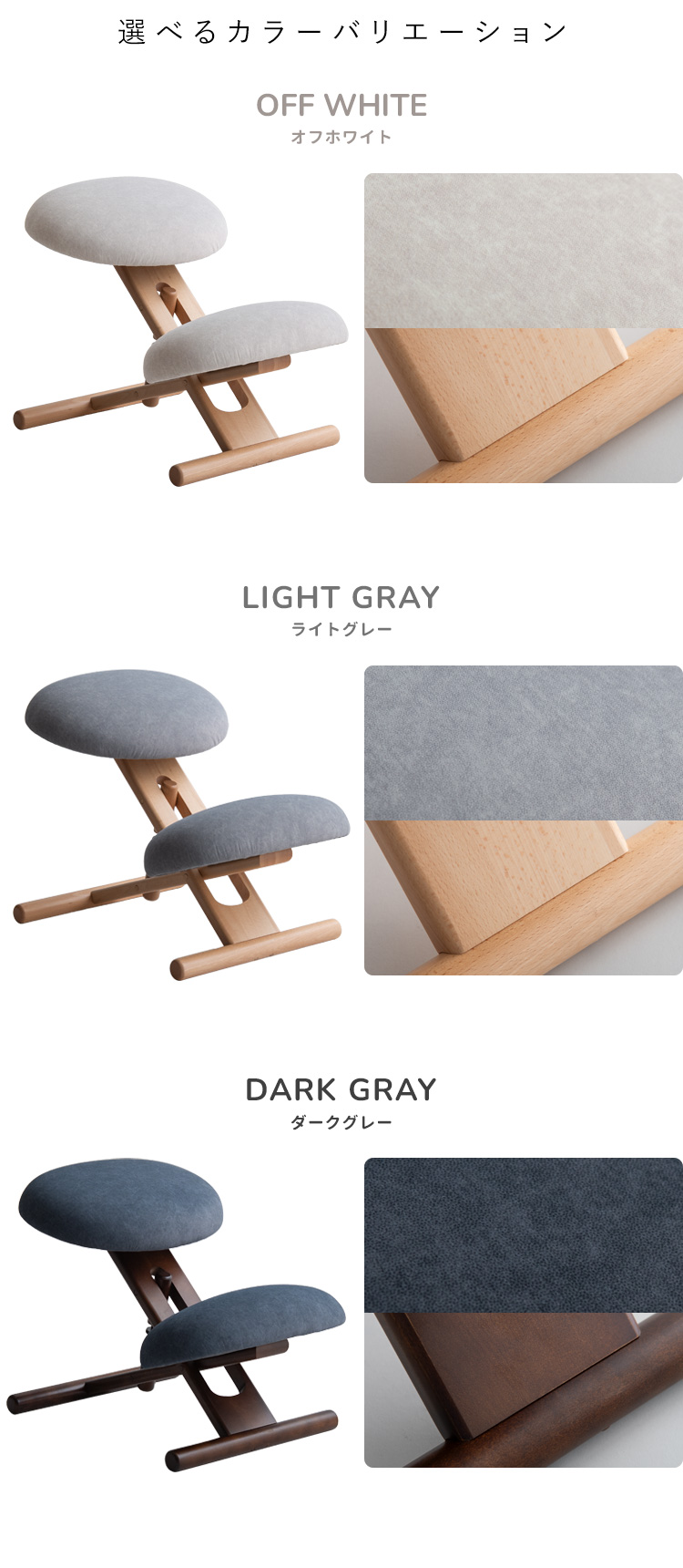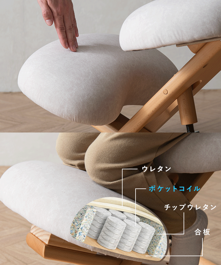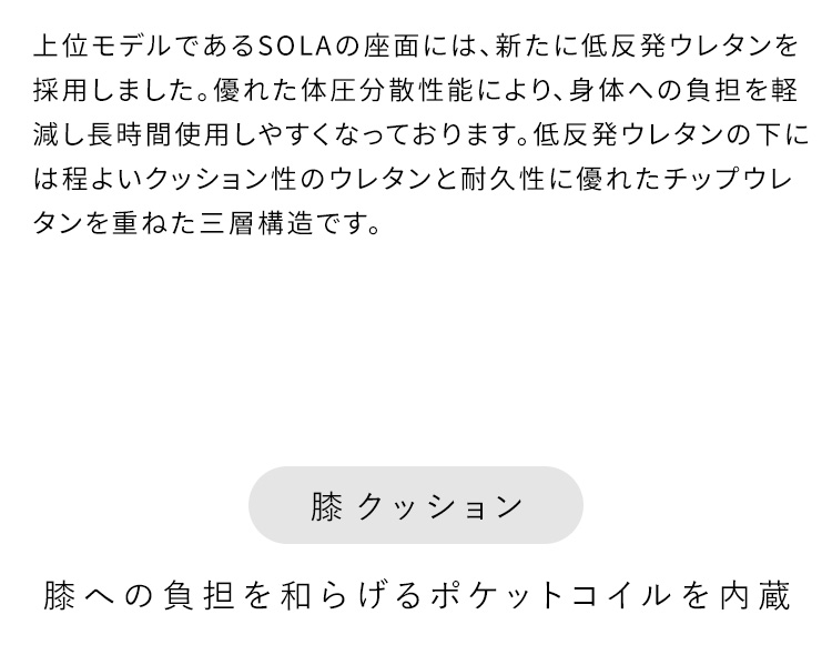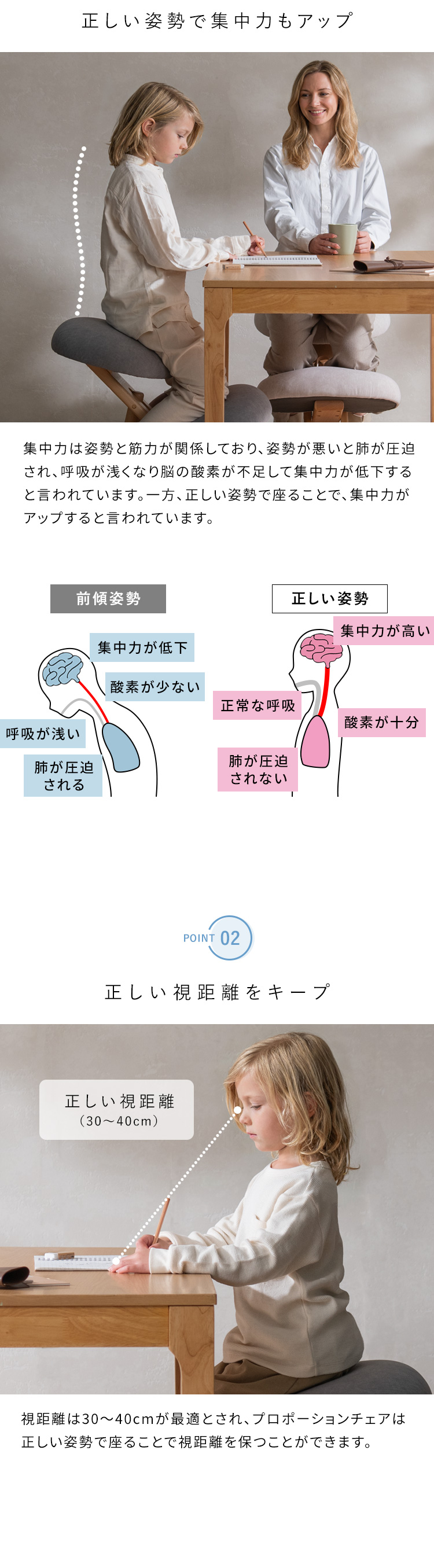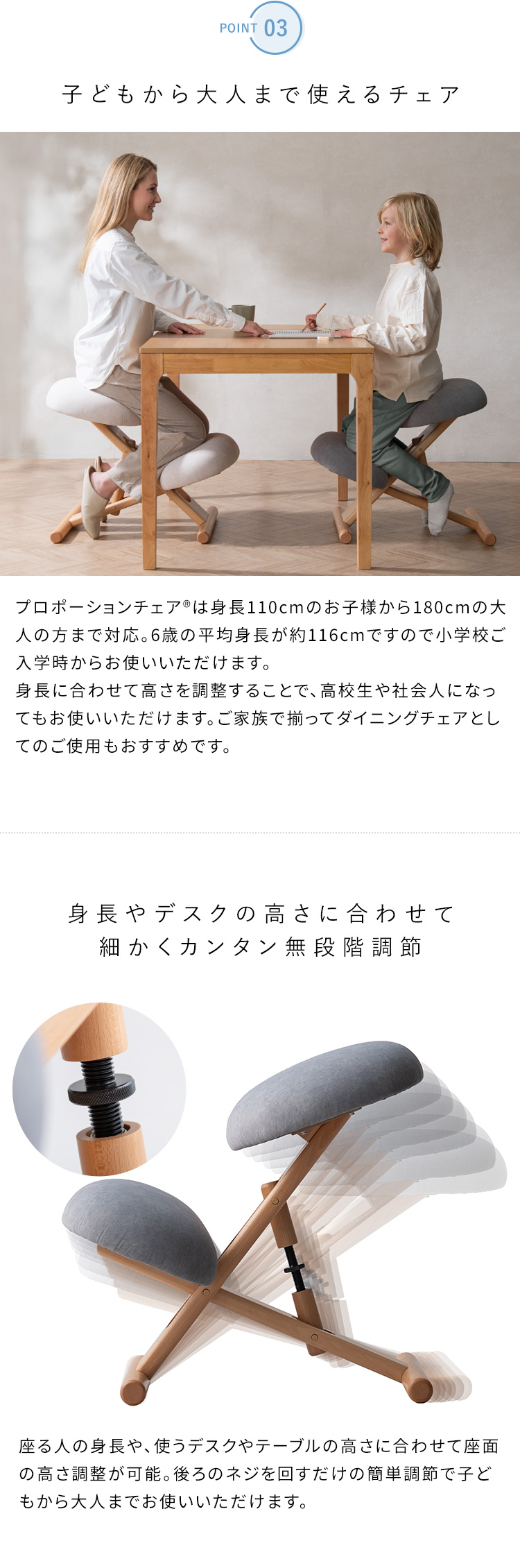 | プロポーションチェア(R) SOLA(ソラ) 座るだけで自然と背筋が伸び集中しやすい「プロモーションチェア」の上位モデルとして、空のような軽さと静けさを目指して生まれました。 子供から大人まで更なる心地いい体験を通して、素敵な自分への変化をサポートします。 ■座面クッション 低反発ウレタンを採用しており、優れた体圧分散性能により、身体への負担を軽減し長時間使用しやすくなっております。 低反発ウレタンの下は程よいクッション性のウレタンと耐久性に優れたチップウレタンを重ねた三層構造です。 ■膝クッション 膝クッションにポケットコイルを採用しており、ポケットコイルを耐久性に優れたチップウレタンで囲み、ウレタンで包み込んだ構造。 従来より体圧分散性能が高くなったため、膝への負担を和らげられるため、より長時間集中しやすくなっております。 ■ファブリック サラリとした心地いい生地は、OEKO TEX 100 standerd認定証の生地を採用。乳幼児向け製品にも使用できる安全性が確認されています。 ひっかき傷への強さや毛玉の出来にくさ、撥水性などを兼ねた生地で従来品より長らくご使用いただけます。 ■フレーム 節が少なく、温かみある風合いや美しい木目が特徴の天然木ブナ材を使用したフレーム。 なるべく角に丸みを付けて安全面にも配慮。木と同色のネジ隠しキャップで、よりお部屋に馴染みます。 ■斜め座面で背筋が伸びてキレイな姿勢 一般的なチェアは、前のめりになりがち。 プロモーションチェアなら、斜めの座面が立ち姿勢のように骨盤が立つので自然と背中がS字カーブを描き、理想的な姿勢を作り出せます。 ■正しい姿勢で集中力アップ&正しい視距離をキープ 姿勢が悪いと肺が圧迫され、呼吸が浅くなり脳の酸素が不足して集中力が低下しますが、正しい姿勢で座ることで、集中力がアップするといわれてます。 視距離は30~40cmが最適とされ、プロモーションチェアは正しい姿勢で座ることで視距離を保つ事ができます。 ■細かくカンタン無段階調節可能で、子どもから大人まで使えるチェア 身長や、デスクやテーブルの高さに合わせて座面の高さ調節が可能。後ろのネジを回すだけの簡単に調節することができます。 ・110~130cmのお子様には膝クッション下へのスペーサーを挟むことで座面と膝の距離を調節できます。 ・座面の取り付け位置は従来の前後二段階から三段階選択に。膝クッションとの距離を細かく調節できます。 ■デスク下に収まるコンパクトサイズ 学習机の下にもスッキリ収納出来て、使わないときは邪魔になりません。 ■贈り物にも最適なギフトボックス付き SOLAオリジナルデザインの化粧箱付き。入学や七五三、クリスマスなどでお子様やお孫様への贈り物に最適です。 ※茶箱の外装との二重梱包でお届けします。 ■アフターサービスも充実 パーツが摩擦してしまった場合でも、パーツ1つからご購入いただけます。 長くお使いいただけるようアフターサービスを行っておりますので、お気軽にお問い合わせください。 ※こちらの商品はお客様組み立てとなります(約20分) ※若干の個体差により、表記サイズと多少の差異が生じる場合がございます。 | |