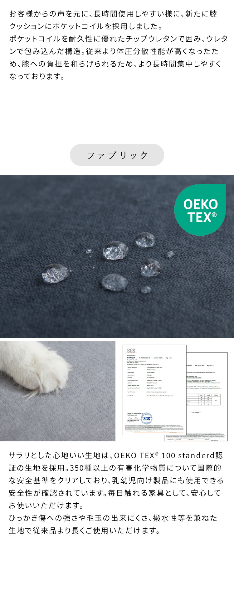 | 材質 | OEKO TEX(R)ポリエステル・ウレタン・ポケットコイル・合板・天然木(ラッカー塗装) |