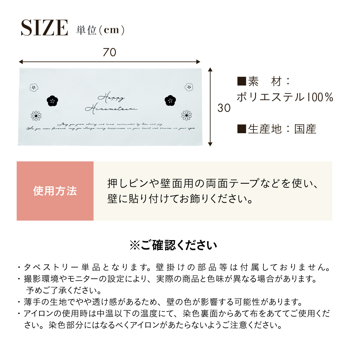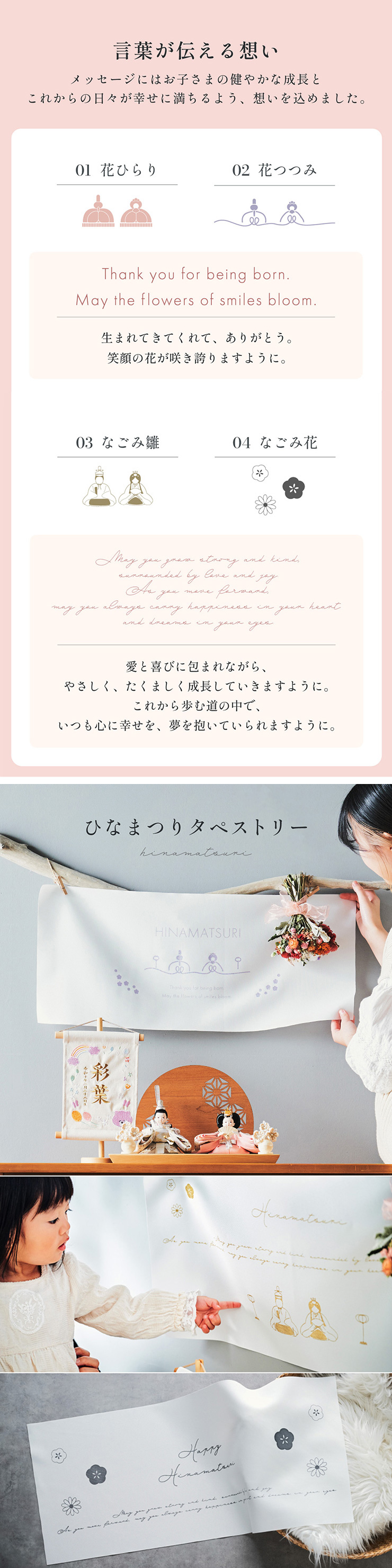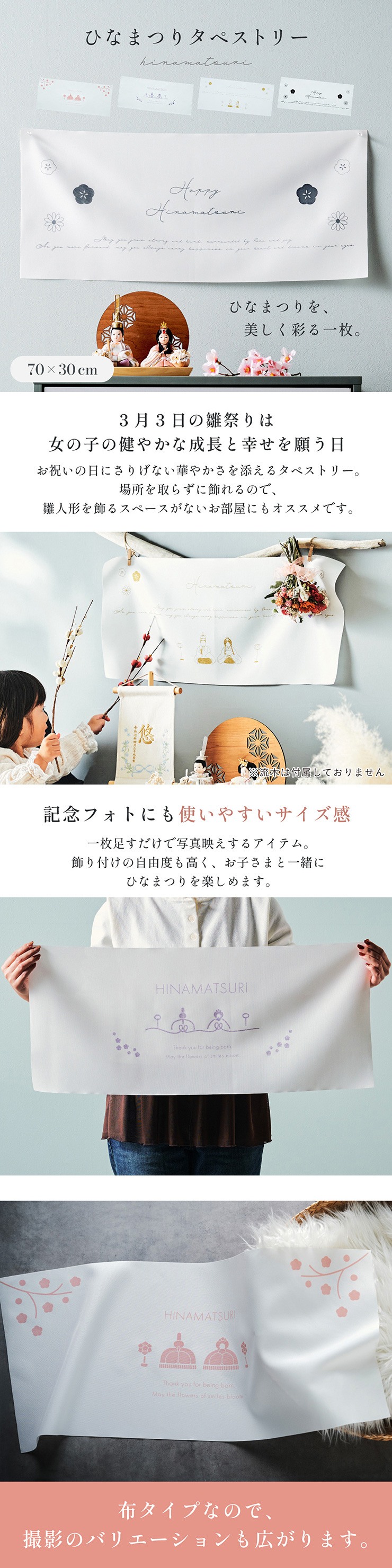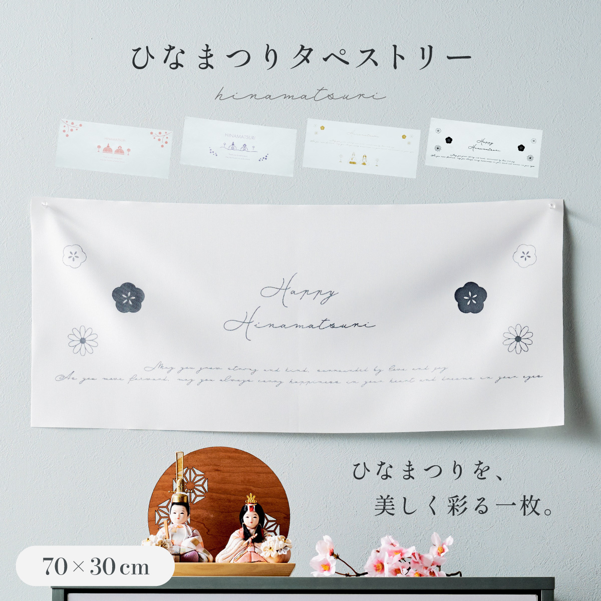 | ひなまつりタペストリー ひなまつりを美しく彩る一枚。 お祝いの日にさりげない華やかさを添えるタペストリー。 場所をとらずに飾れるので、雛人形を飾るスペースがないお部屋にもオススメです。 ■記念フォトにも使いやすいサイズ感 一枚足すだけでも写真映えするアイテム。 飾り付けの自由度も高く、お子さまと一緒にひなまつりを楽しめます。 ■布タイプなので、撮影のバリエーションも広がります。 ■花つつみとなごみ雛はラメタイプ ■言葉が伝える想い メッセージにはお子さまの健やかな成長とこれからの日々が幸せに満ちるよう、想いを込めました。 ※押しピンや壁面用の両面テープなどを使い、壁に貼り付けてお飾りください。 ※タペストリー単品となります。壁掛けの部品などは付属しておりません。 ※撮影環境やモニターの設定により、実際の商品と色味が異なる場合があります。予めご了承ください。 ※薄手の生地でやや透け感があるため、壁の色が影響する可能性があります。 ※アイロンの使用時は中温以下の温度にて、染色裏面からあて布をあててご使用ください。染色部分にはなるべくアイロンがあたらないようご注意ください。 | |