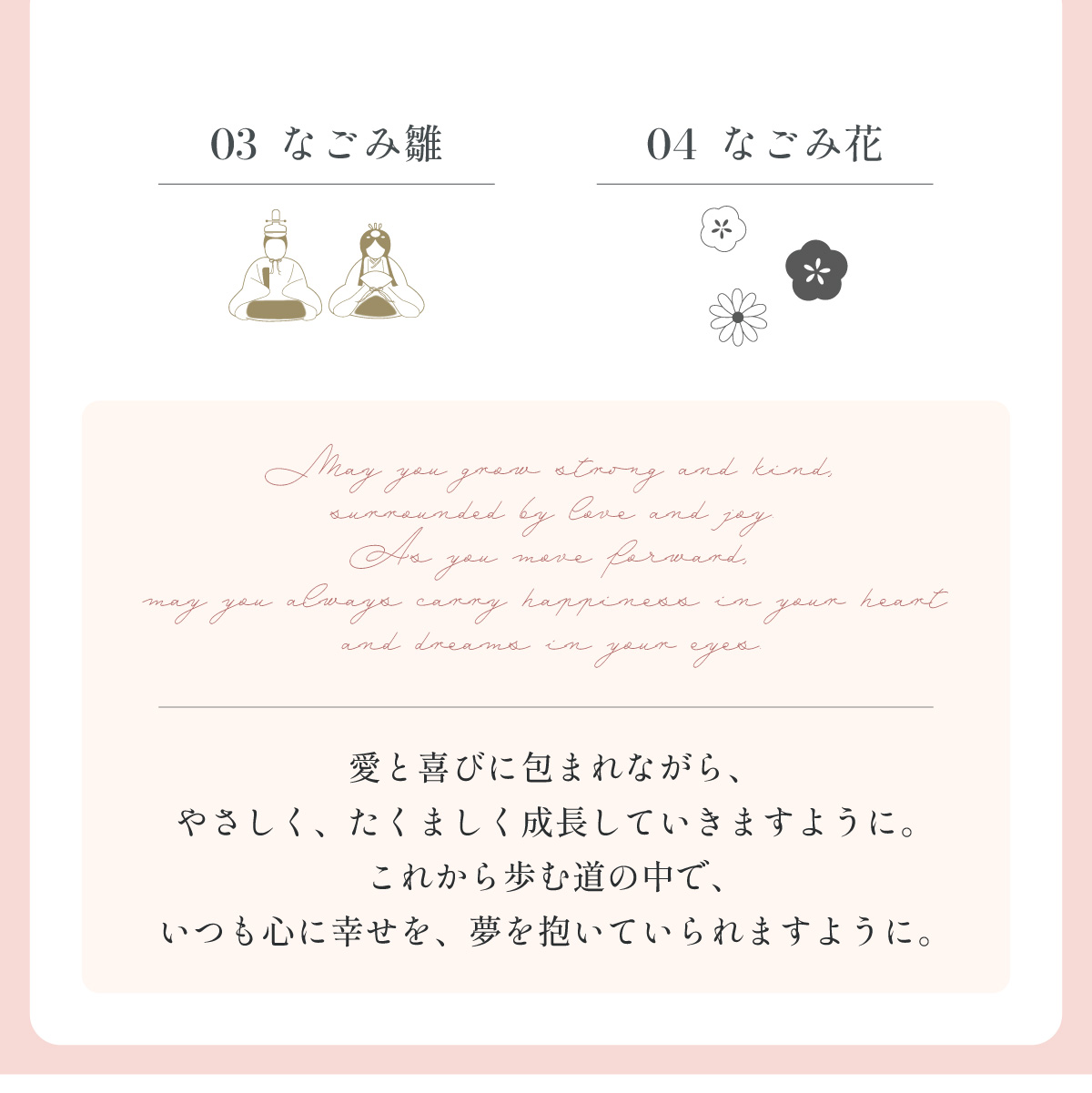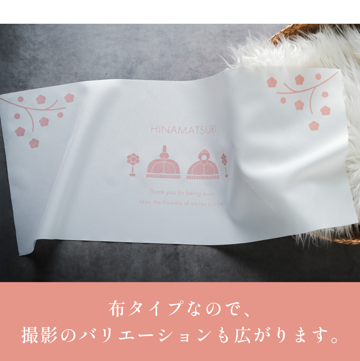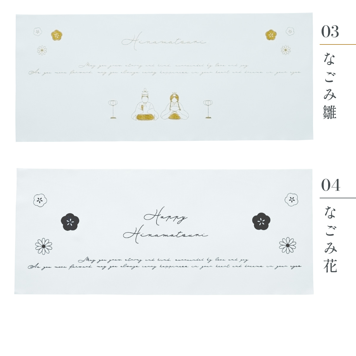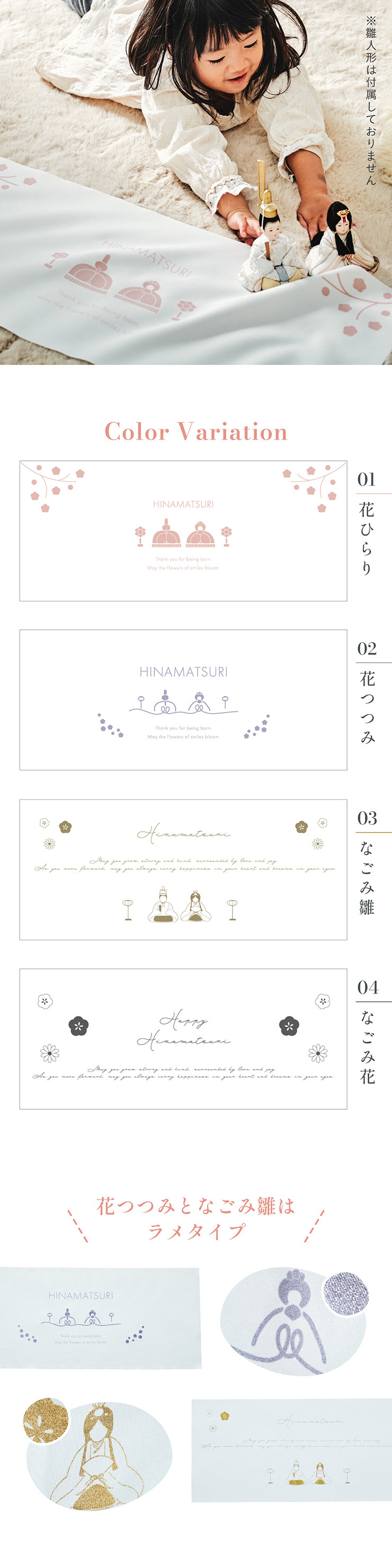 | ひなまつりタペストリー ひなまつりを美しく彩る一枚。 お祝いの日にさりげない華やかさを添えるタペストリー。 場所をとらずに飾れるので、雛人形を飾るスペースがないお部屋にもオススメです。 ■記念フォトにも使いやすいサイズ感 一枚足すだけでも写真映えするアイテム。 飾り付けの自由度も高く、お子さまと一緒にひなまつりを楽しめます。 ■布タイプなので、撮影のバリエーションも広がります。 ■花つつみとなごみ雛はラメタイプ ■言葉が伝える想い メッセージにはお子さまの健やかな成長とこれからの日々が幸せに満ちるよう、想いを込めました。 ※押しピンや壁面用の両面テープなどを使い、壁に貼り付けてお飾りください。 ※タペストリー単品となります。壁掛けの部品などは付属しておりません。 ※撮影環境やモニターの設定により、実際の商品と色味が異なる場合があります。予めご了承ください。 ※薄手の生地でやや透け感があるため、壁の色が影響する可能性があります。 ※アイロンの使用時は中温以下の温度にて、染色裏面からあて布をあててご使用ください。染色部分にはなるべくアイロンがあたらないようご注意ください。 | |