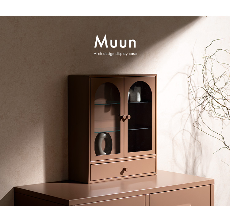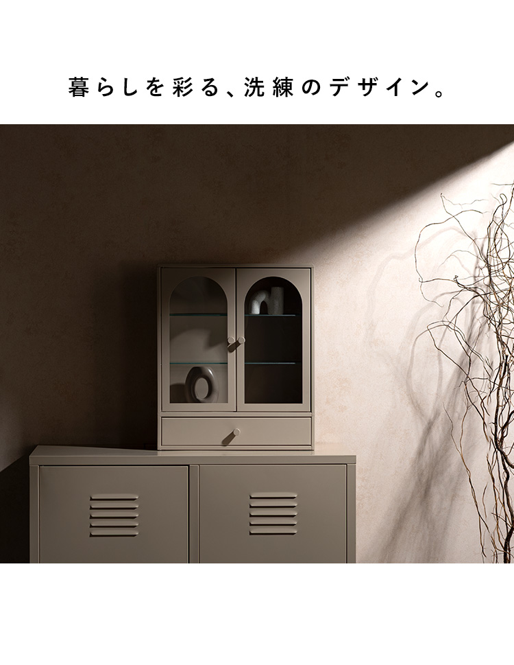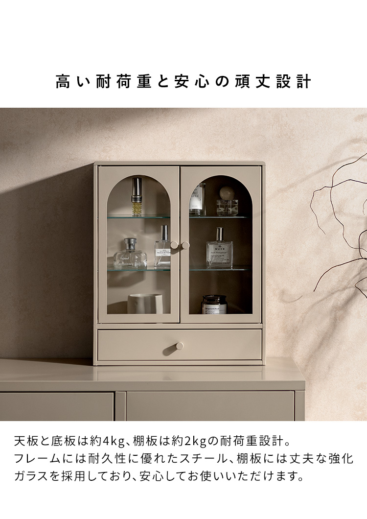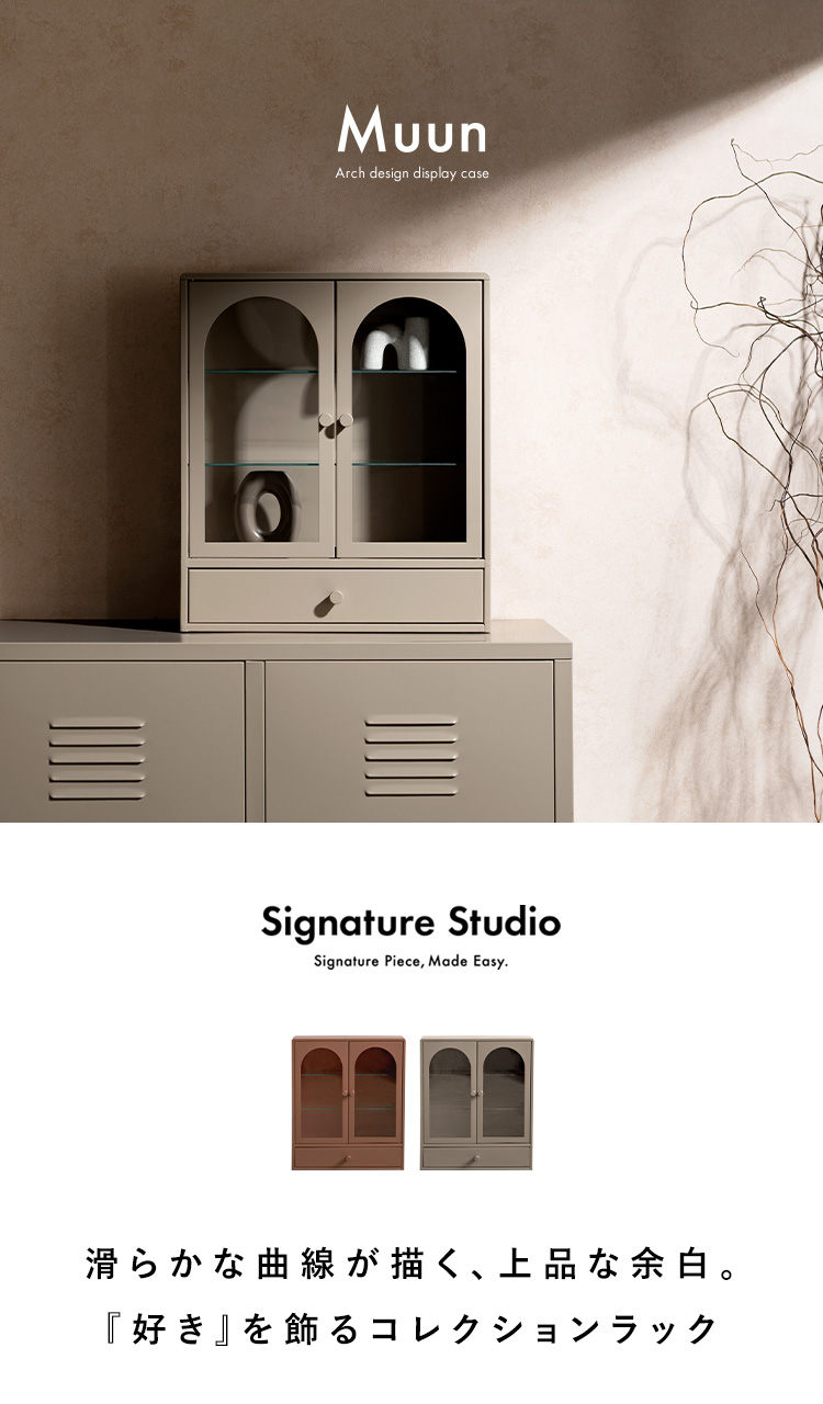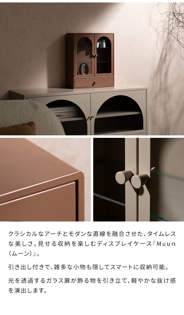 | ディスプレイケース Muun(ムーン) クラシカルなアーチとモダンな直線を融合させた、タイムレスな美しさ。見せる収納を楽しむディスプレイケース『Muun(ムーン)』。 引き出し付きで、雑多な小物も隠してスマートに収納可能。 光を透過するガラス扉が飾る物を引き立て、軽やかな抜け感を演出します。 ■クラシカルなアーチ扉 ディスプレイが映える、クリアなアーチ窓。クラシカルなアーチデザインが、空間に奥行と上品な存在感を演出します。 ■飾るものを引き立てるガラス棚板 傷に強く、丈夫でたわみにくい強化ガラスの棚板。視線を遮らずに光を取り込み、飾るものも形や色を美しく際立たせます。 ■落ち着きのあるマットスチール 指先に心地よさを感じる、さらりとマットな質感。光沢を抑えたスチール素材が、上品で洗練された印象を添えます。 ■小物収納に便利な引き出し ごちゃつきがちな小物をスマートに収納できる引き出し付き。生活感をさりげなく隠して、整った空間を保ちます。 ■高い耐荷重と安心の頑丈設計 天板は約4kg、可動棚は約2kgの耐荷重設計。 フレームには耐久性に優れたスチール、棚板には丈夫な強化ガラスを採用しており、安心してお使いいただけます。 ■水や汚れに強く、お手入れ簡単 水や汚れに強いスチール粉体塗装仕上げ。汚れてもサッと拭きとれて、お手入れ簡単です。 ■安定感を高めるすべり止め付き 底面に貼り付けるすべり止め付き。すべりやすい天板の上にも安心して設置いただけます。 ※こちらの商品はお客様組み立てとなります(約10分) ※若干の個体差により、表記サイズと多少の差異が生じる場合がございます。 | |