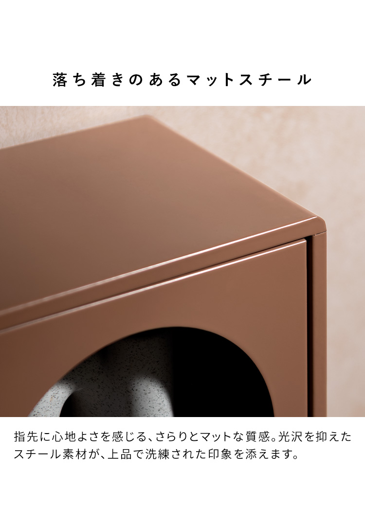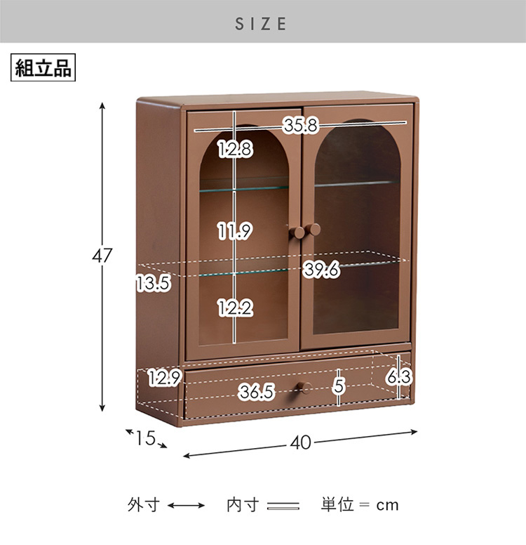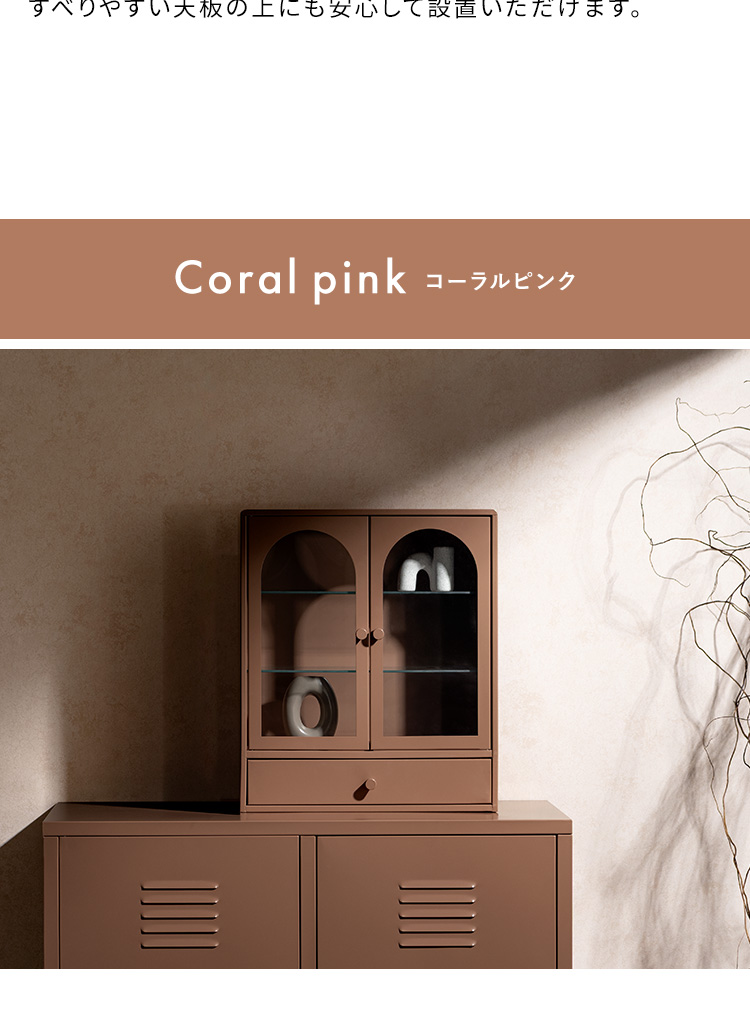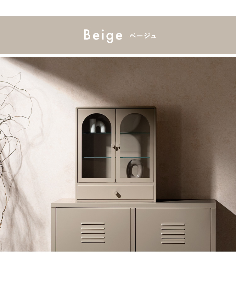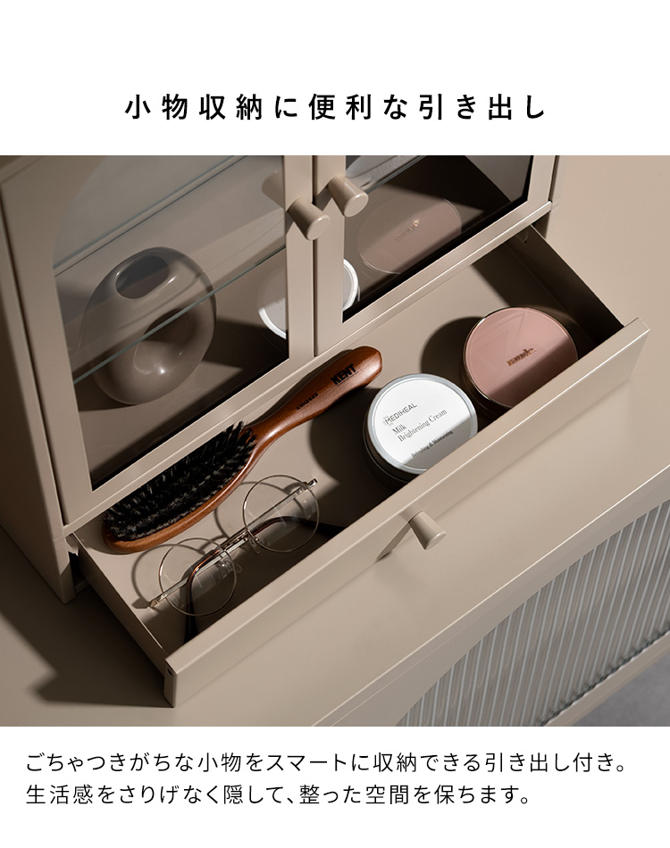 | ディスプレイケース Muun(ムーン) クラシカルなアーチとモダンな直線を融合させた、タイムレスな美しさ。見せる収納を楽しむディスプレイケース『Muun(ムーン)』。 引き出し付きで、雑多な小物も隠してスマートに収納可能。 光を透過するガラス扉が飾る物を引き立て、軽やかな抜け感を演出します。 ■クラシカルなアーチ扉 ディスプレイが映える、クリアなアーチ窓。クラシカルなアーチデザインが、空間に奥行と上品な存在感を演出します。 ■飾るものを引き立てるガラス棚板 傷に強く、丈夫でたわみにくい強化ガラスの棚板。視線を遮らずに光を取り込み、飾るものも形や色を美しく際立たせます。 ■落ち着きのあるマットスチール 指先に心地よさを感じる、さらりとマットな質感。光沢を抑えたスチール素材が、上品で洗練された印象を添えます。 ■小物収納に便利な引き出し ごちゃつきがちな小物をスマートに収納できる引き出し付き。生活感をさりげなく隠して、整った空間を保ちます。 ■高い耐荷重と安心の頑丈設計 天板は約4kg、可動棚は約2kgの耐荷重設計。 フレームには耐久性に優れたスチール、棚板には丈夫な強化ガラスを採用しており、安心してお使いいただけます。 ■水や汚れに強く、お手入れ簡単 水や汚れに強いスチール粉体塗装仕上げ。汚れてもサッと拭きとれて、お手入れ簡単です。 ■安定感を高めるすべり止め付き 底面に貼り付けるすべり止め付き。すべりやすい天板の上にも安心して設置いただけます。 ※こちらの商品はお客様組み立てとなります(約10分) ※若干の個体差により、表記サイズと多少の差異が生じる場合がございます。 | |