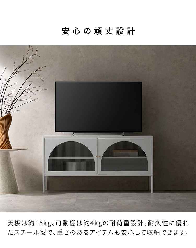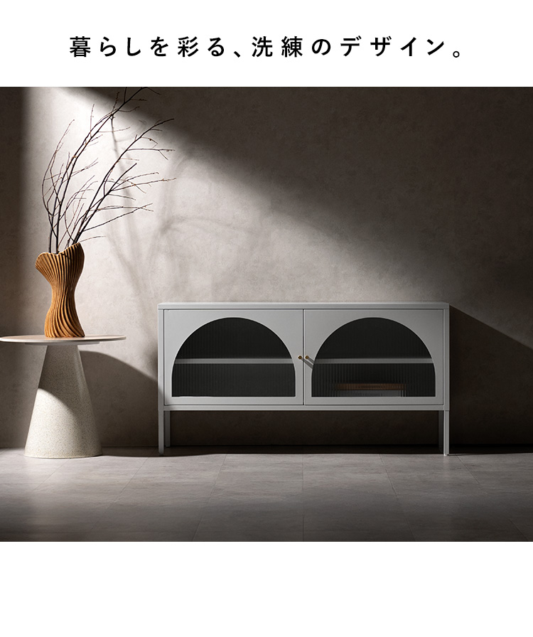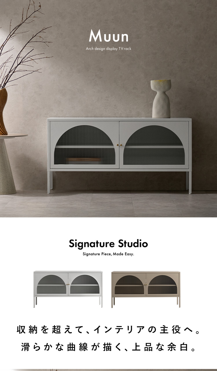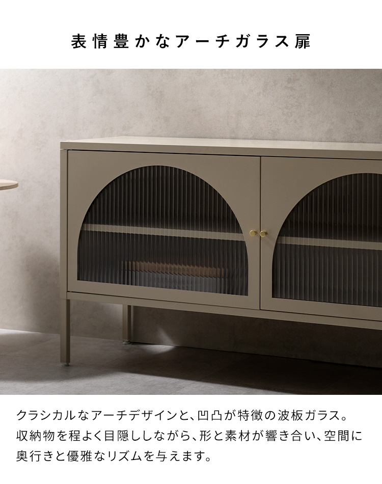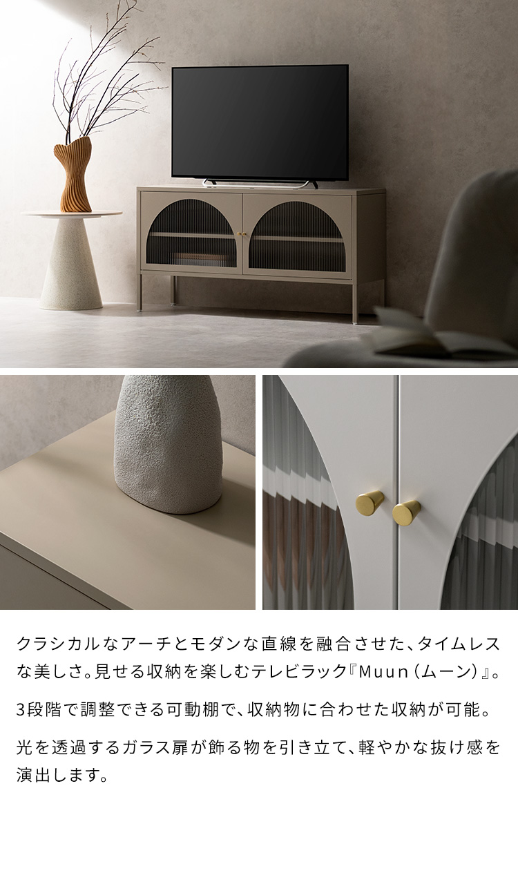 | テレビボード Muun(ムーン) クラシカルなアーチとモダンな直線を融合させた、タイムレスな美しさ。見せる収納を楽しむテレビラック『Muun(ムーン)』。 3段階で調整できる可動棚で、収納物に合わせた収納が可能。 光を透過するガラス扉が飾る物を引き立て、軽やかな抜け感を演出します。 ■表情豊かなアーチ扉 クラシカルなアーチデザインと、凸凹が特徴の波板ガラス。 収納物を程よく目隠ししながら、形と素材が響きあい、空間に奥行と優雅なリズムを与えます。 ■繊細に輝くゴールドの取っ手 繊細な艶をまとったゴールドの取っ手が、さりげないアクセントに。光の角度で表情を変え、上品な存在感を演出します。 ■落ち着きのあるマットスチール 指先に心地よさを感じる、さらりとマットな質感。光沢を抑えたスチール素材が、上品で洗練された印象を添えます。 ■3段階で調整できる可動棚 可動棚は3段階で高さ調整が可能。収納物のサイズに合わせて無駄なくスマートに収納できます。 ■すっきり配線できるコード穴付き 背面に設けたコード穴で、配線をすっきり目隠し。AV機器はもちろん、ルーターやゲーム機なども収納いただけます。 ■安心の頑丈設計 天板は約15kg、可動棚は約4kgの耐荷重設計。 耐久性に優れたスチール製で、重さのあるアイテムも安心して収納できます。 ■水や汚れに強く、お手入れ簡単 スチール部分へ粉体塗装を施し、水や汚れに強い仕上がりに。汚れてもサッと拭きとれて、お手入れ簡単です。 ■がたつきを抑えるアジャスター付き 脚先にはアジャスターを搭載。高さを微調整しながら、安定感を高めてご使用いただけます。 ※こちらの商品はお客様組み立てとなります(約90分) ※組み立てにはプラスドライバーが必要となります。 ※若干の個体差により、表記サイズと多少の差異が生じる場合がございます。 | |
