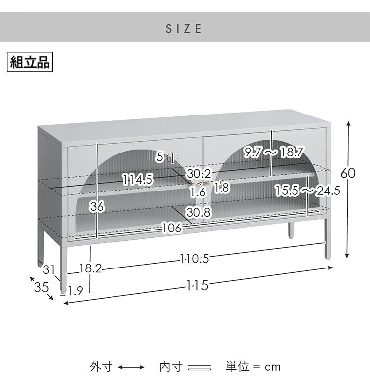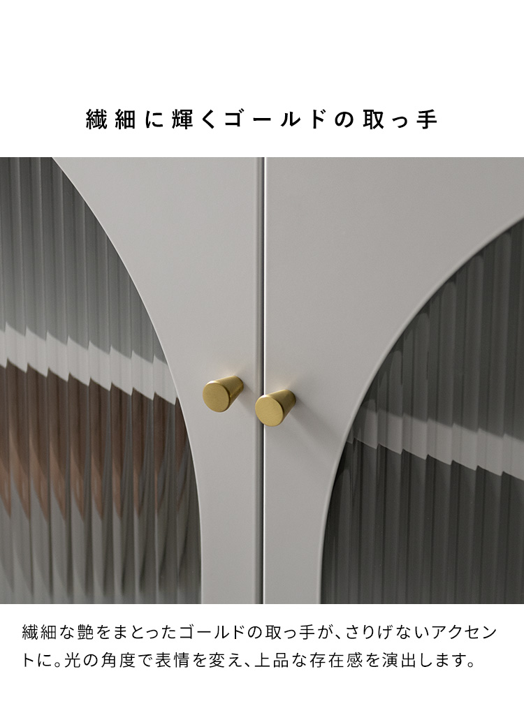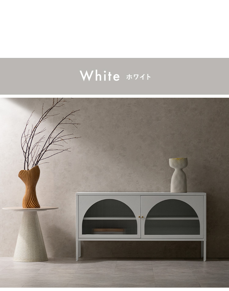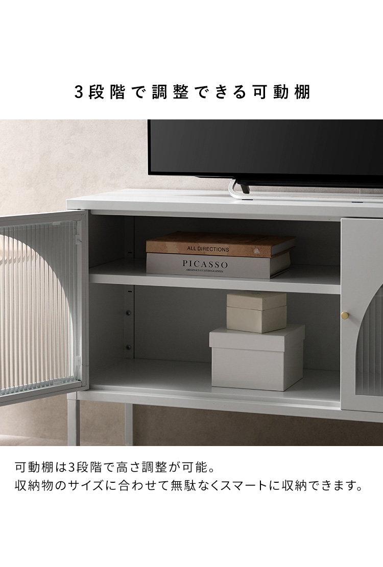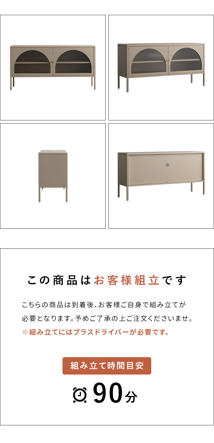 | テレビボード Muun(ムーン) クラシカルなアーチとモダンな直線を融合させた、タイムレスな美しさ。見せる収納を楽しむテレビラック『Muun(ムーン)』。 3段階で調整できる可動棚で、収納物に合わせた収納が可能。 光を透過するガラス扉が飾る物を引き立て、軽やかな抜け感を演出します。 ■表情豊かなアーチ扉 クラシカルなアーチデザインと、凸凹が特徴の波板ガラス。 収納物を程よく目隠ししながら、形と素材が響きあい、空間に奥行と優雅なリズムを与えます。 ■繊細に輝くゴールドの取っ手 繊細な艶をまとったゴールドの取っ手が、さりげないアクセントに。光の角度で表情を変え、上品な存在感を演出します。 ■落ち着きのあるマットスチール 指先に心地よさを感じる、さらりとマットな質感。光沢を抑えたスチール素材が、上品で洗練された印象を添えます。 ■3段階で調整できる可動棚 可動棚は3段階で高さ調整が可能。収納物のサイズに合わせて無駄なくスマートに収納できます。 ■すっきり配線できるコード穴付き 背面に設けたコード穴で、配線をすっきり目隠し。AV機器はもちろん、ルーターやゲーム機なども収納いただけます。 ■安心の頑丈設計 天板は約15kg、可動棚は約4kgの耐荷重設計。 耐久性に優れたスチール製で、重さのあるアイテムも安心して収納できます。 ■水や汚れに強く、お手入れ簡単 スチール部分へ粉体塗装を施し、水や汚れに強い仕上がりに。汚れてもサッと拭きとれて、お手入れ簡単です。 ■がたつきを抑えるアジャスター付き 脚先にはアジャスターを搭載。高さを微調整しながら、安定感を高めてご使用いただけます。 ※こちらの商品はお客様組み立てとなります(約90分) ※組み立てにはプラスドライバーが必要となります。 ※若干の個体差により、表記サイズと多少の差異が生じる場合がございます。 | |