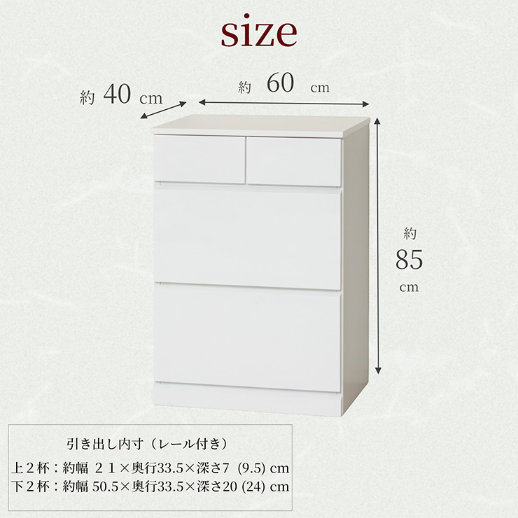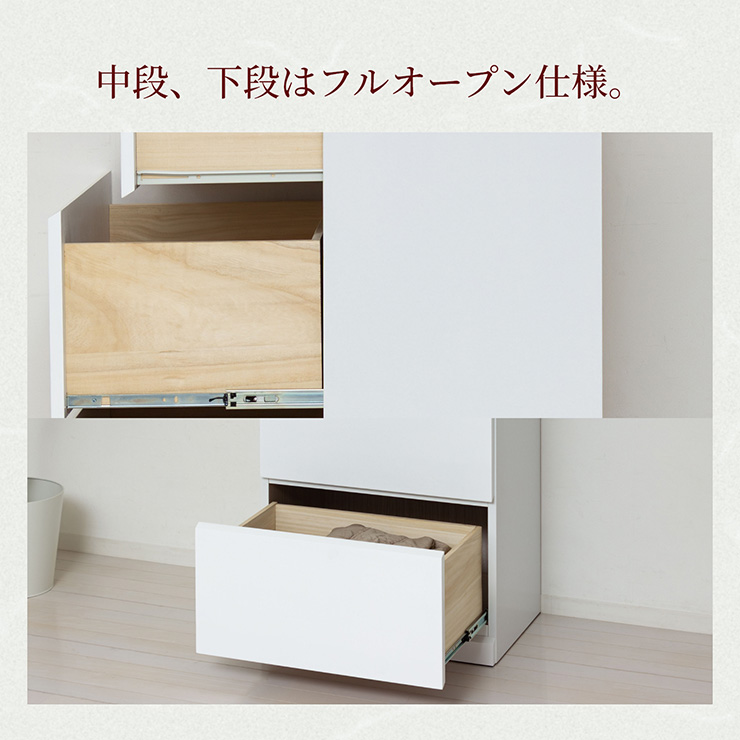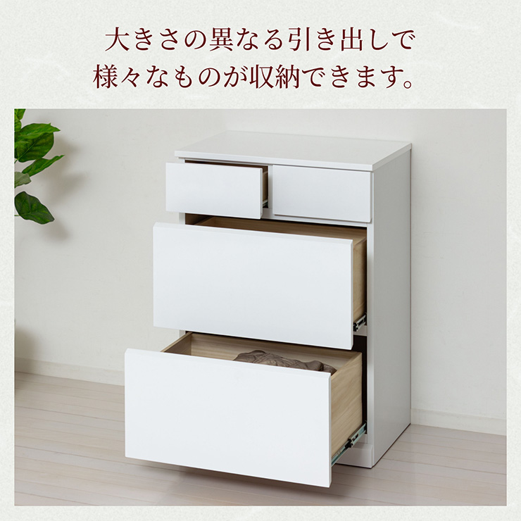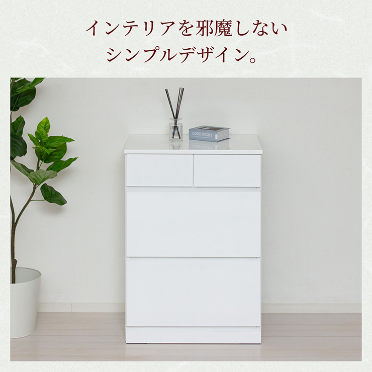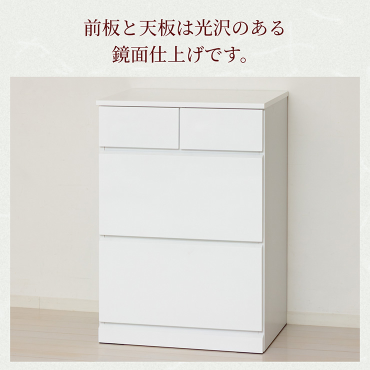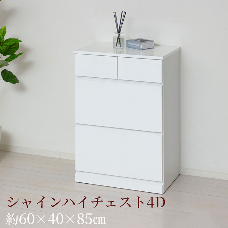 | シャイン ハイチェスト4D さわやかで清潔感のあるホワイト色、前板と天板は光沢のある鏡面仕上げです。 既存のインテリアの邪魔をしないシンプルデザイン、取っ手がなくスッキリした印象です。 ■深型タイプでかさばる衣装やセーターなどがたっぷり収納できます。 ■スライドレール付きで出し入れ楽々 ■中段、下段はフルオープン仕様 ■大きさの異なる引き出しで様々なものが収納できます。 ■箱から出してすぐ使える!完成品でお手元に届きます ※若干の個体差により、表記サイズと多少の差異が生じる場合がございます。 | |