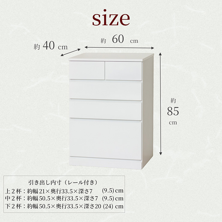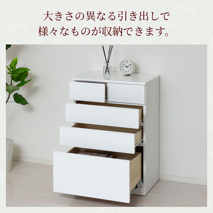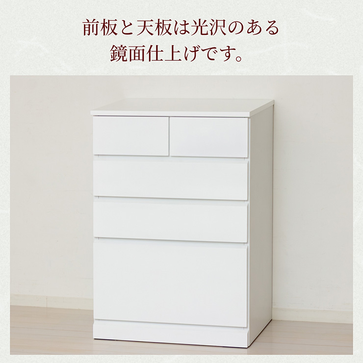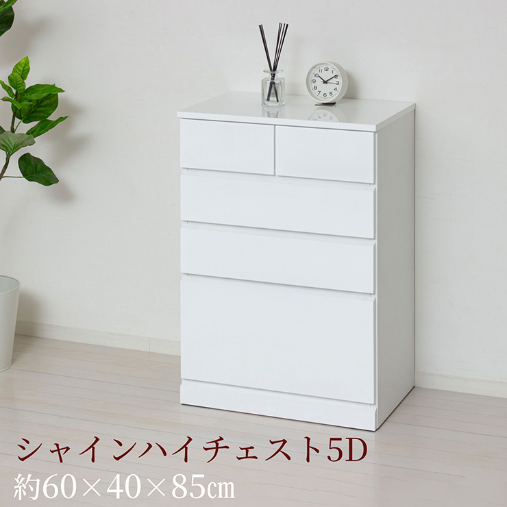 | シャイン ハイチェスト5D さわやかで清潔感のあるホワイト色、前板と天板は光沢のある鏡面仕上げです。 既存のインテリアの邪魔をしないシンプルデザイン、取っ手がなくスッキリした印象です。 ■深型タイプでかさばる衣装やセーターなどがたっぷり収納できます。 ■スライドレール付きで出し入れ楽々 ■下段はフルオープン仕様 ■大きさの異なる引き出しで様々なものが収納できます。 ■箱から出してすぐ使える!完成品でお手元に届きます ※若干の個体差により、表記サイズと多少の差異が生じる場合がございます。 | |