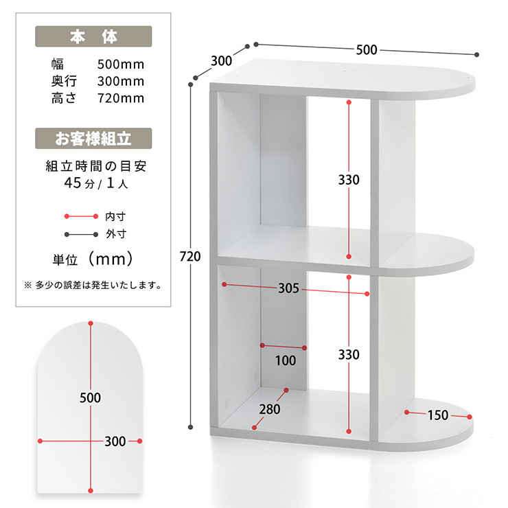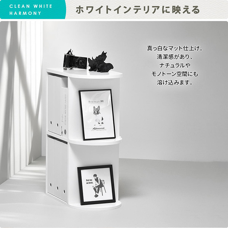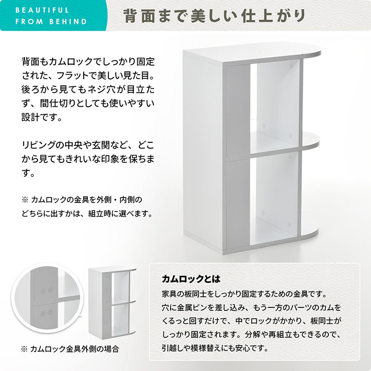 | 3段ラック BF DECO 置くだけで「かわいい」が完成するラック。半円を描くやさしいフォルムと、清潔感あふれる真っ白な仕上げ。 A4サイズも収まる実用性と、並べて飾れるデザイン性。収納とインテリア、どちらも楽しめる、やさしいホワイトラックです。 ■壁際を無駄にしないデザイン 背面はまっすぐ、片側は半円。コーナーや壁際にぴったり寄せられるから、スペースを無駄なく活用できます。 ■スリム設計 30cmのスリムな奥行で、リビングや玄関、寝室など狭い場所にも置きやすい。 ■A4収納にぴったり 収納部の高さは約33cm。一般的なA4サイズのファイルボックスや雑誌も収まり、使い勝手〇 ■小物を飾って見せる収納に 半円のステージ部分に観葉植物や雑貨を置けば、おしゃれなディスプレイに ■しっかり支える安心設計 1段当たり約15kgまで収納可能。かわいさと実用性を両立しています。 ■横置きでも使える自由なインテリア 横向けに置いても使いやすく、デスクの上やキッチンカウンターでもお使いいただけます。 ■抜け感を生むハーフバック構造 背面の片側だけに側板を設けたデザイン。半分はオープンだから、光を透かして明るく、軽やかな印象に。 圧迫感を感じにくく、壁際に置いても自然とお部屋になじみます。 左右どちらにも取付できるので、レイアウトに合わせて自由にアレンジ可能です。 ■背面まで美しい 背面もカムロックでしっかり固定された、フラットで美しい見た目。 後ろから見てもネジ穴が目立たず、間仕切りとしても使いやすい設計です。 ■左右どちらにも組立OK 側板は左右どちらにも取付可能。お部屋のレイアウトや動線に合わせて、光の入り方や壁際の見え方を自由にアレンジできます。 ■水に強くお手入れ簡単 表面は、水や傷に強いラッカー塗装仕上げ。うっかり飲み物をこぼしても、サッと拭くだけでキレイに。 汚れが染み込みにくいので、毎日のお手入れもラクラクです。 ※こちらの商品はお客様組み立てとなります(約45分) ※若干の個体差により、表記サイズと多少の差異が生じる場合がございます。 | |