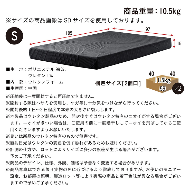 | サイズ | ベッド:約W203 x D104 x H164cm(65.5kg) マットレス:約W97 x D195 x H15cm(10.5kg) 梱包サイズ:約113.5 x 63 x 20cm(43kg)・約205 x 35 x 12.5cm(27kg)・約40 x 40 x 59cm(11.5kg)・約40 x 40 x 59cm(11.5kg) |