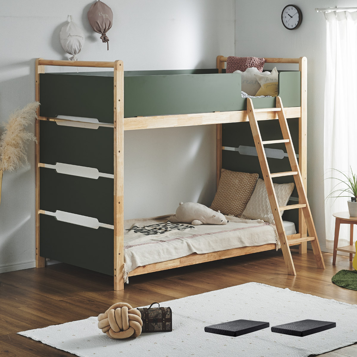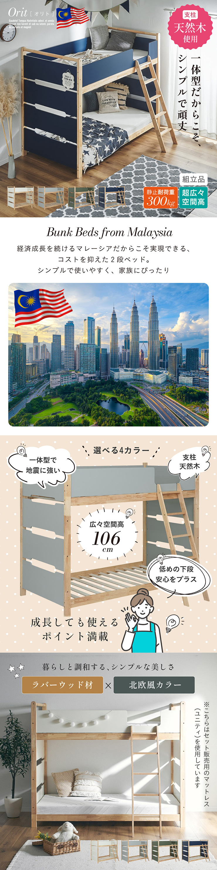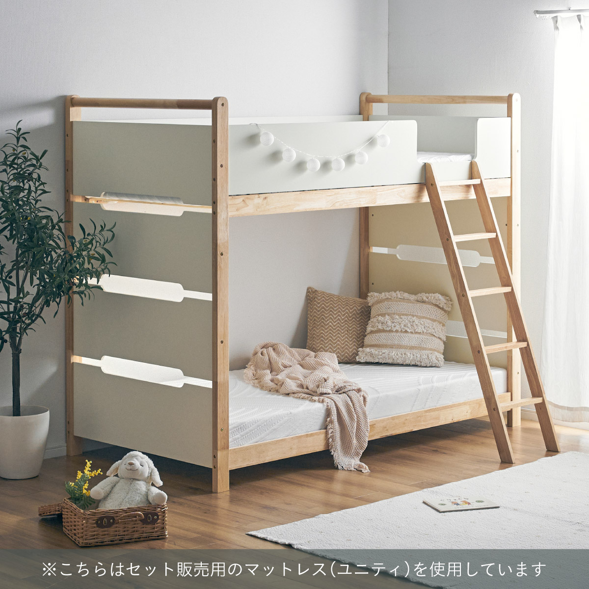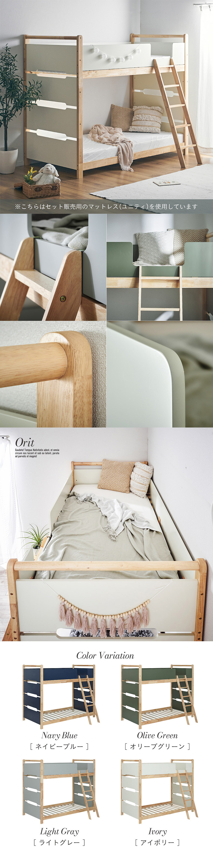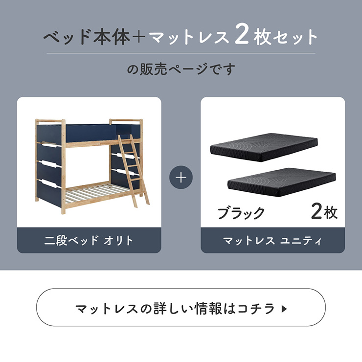 | 2段ベッド マットレスセット Bunk Bed Orit(オリト)+Unity(ユニティ)BKセット ベッド本体+マットレス(ブラック)2枚セットの販売ページです。 ■checkpoint ・選べる4カラー ・一体型で地震に強い ・支柱天然木 ・低めの下段、安心をプラス ■ラバーウッド材×ナチュラルカラー 暮らしと調和する、シンプルな美しさ ■Point 01.S字フックで広がるベッド空間 アイデア次第で自分だけの空間に ■Point 02.一体型構造で地震にも強い 頑丈なつくりが暮らしを守ります。 ※分割機能はございません。 ■Point 03.のびのび使える広々下段 低めの設計で下段空間をしっかり確保 ■Point 04.斜めはしごでラクラク 安定感ある斜め設計で、登り降りも安心 ■Point 05.天然木のぬくもりと耐久性 丈夫な天然木の柱で安定感アップ ■Point 06.高めのサイドフレームで安心 高さを十分にとり、お子さまも安心 ■Point 07.やさしい角丸設計 角を丸く仕上げているので、毎日安心 ■Point 08.安心の強度テスト合格 300kg静止耐荷重試験を公的機関でクリア。 毎日の仕様にも安心と上部をお届けします。 ※耐荷重検査は静止耐荷重です。ベッドの上で激しく動く、急激な力を加える、飛び跳ねるなど1点に集中して負荷をかける行為はお控えください。 ※本商品はお客様による組み立てが必要です。 ※こちらの商品はベッド本体+マットレス(ブラック)2枚セットの販売となります。 ※組み立て方や個体差により、表記サイズと完成サイズに誤差が生じる場合があります。 ※マットレスは厚さ15cm以上20cm未満の硬めタイプをご使用ください。 ※LVLポードは素材の特性上、キズや加工跡が見られる場合がありますが、強度や性能に影響はありません。見た目による返品・交換は承れません。 | |
