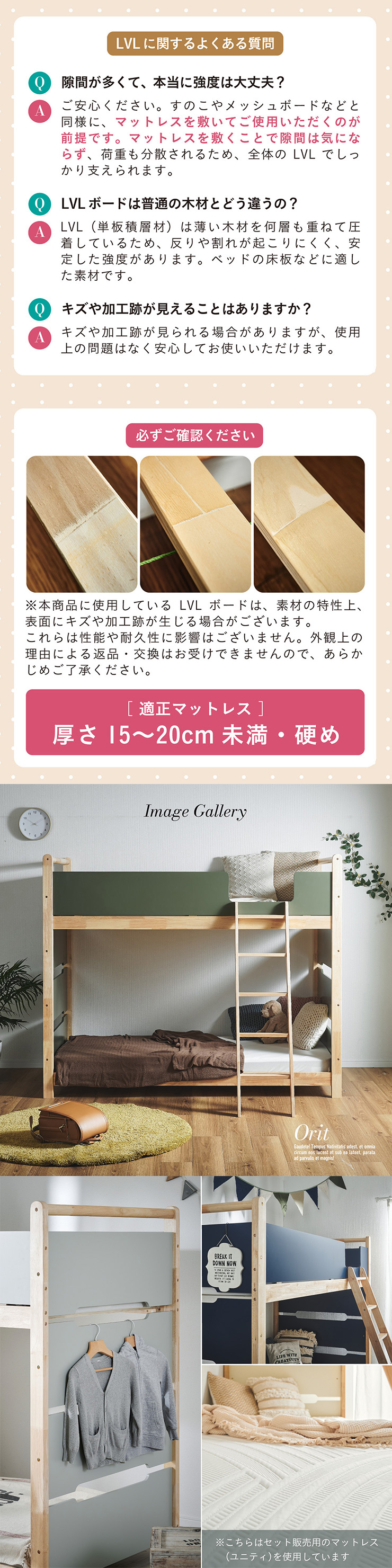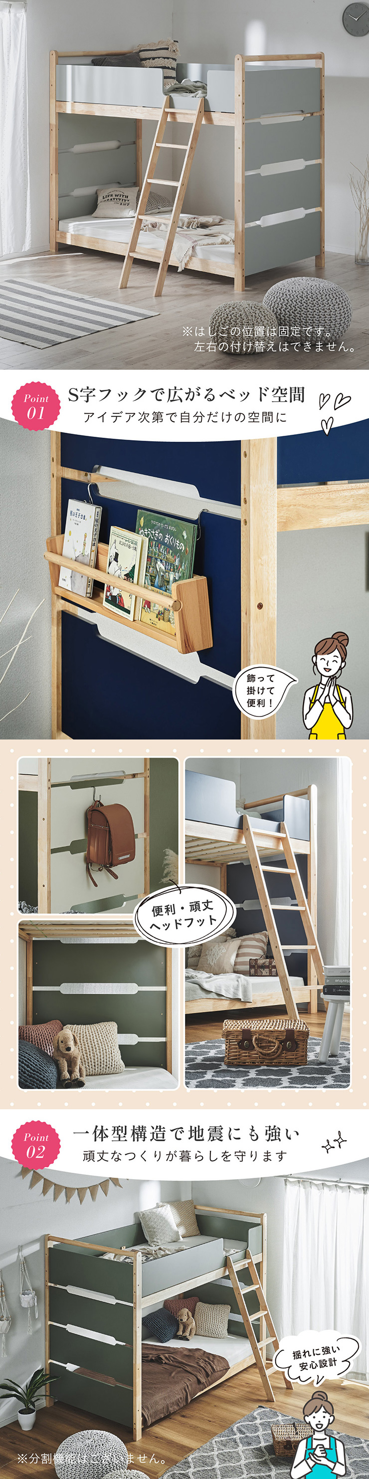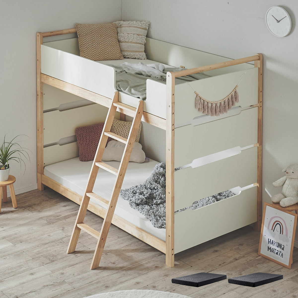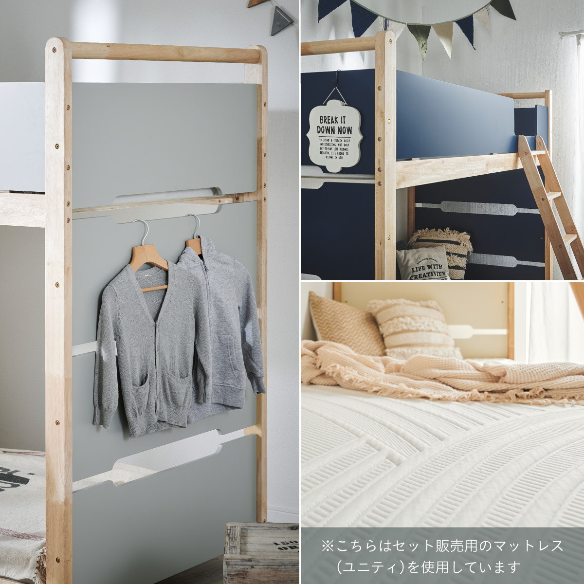 | 2段ベッド マットレスセット Bunk Bed Orit(オリト)+Unity(ユニティ)BKセット ベッド本体+マットレス(ブラック)2枚セットの販売ページです。 ■checkpoint ・選べる4カラー ・一体型で地震に強い ・支柱天然木 ・低めの下段、安心をプラス ■ラバーウッド材×ナチュラルカラー 暮らしと調和する、シンプルな美しさ ■Point 01.S字フックで広がるベッド空間 アイデア次第で自分だけの空間に ■Point 02.一体型構造で地震にも強い 頑丈なつくりが暮らしを守ります。 ※分割機能はございません。 ■Point 03.のびのび使える広々下段 低めの設計で下段空間をしっかり確保 ■Point 04.斜めはしごでラクラク 安定感ある斜め設計で、登り降りも安心 ■Point 05.天然木のぬくもりと耐久性 丈夫な天然木の柱で安定感アップ ■Point 06.高めのサイドフレームで安心 高さを十分にとり、お子さまも安心 ■Point 07.やさしい角丸設計 角を丸く仕上げているので、毎日安心 ■Point 08.安心の強度テスト合格 300kg静止耐荷重試験を公的機関でクリア。 毎日の仕様にも安心と上部をお届けします。 ※耐荷重検査は静止耐荷重です。ベッドの上で激しく動く、急激な力を加える、飛び跳ねるなど1点に集中して負荷をかける行為はお控えください。 ※本商品はお客様による組み立てが必要です。 ※こちらの商品はベッド本体+マットレス(ブラック)2枚セットの販売となります。 ※組み立て方や個体差により、表記サイズと完成サイズに誤差が生じる場合があります。 ※マットレスは厚さ15cm以上20cm未満の硬めタイプをご使用ください。 ※LVLポードは素材の特性上、キズや加工跡が見られる場合がありますが、強度や性能に影響はありません。見た目による返品・交換は承れません。 | |