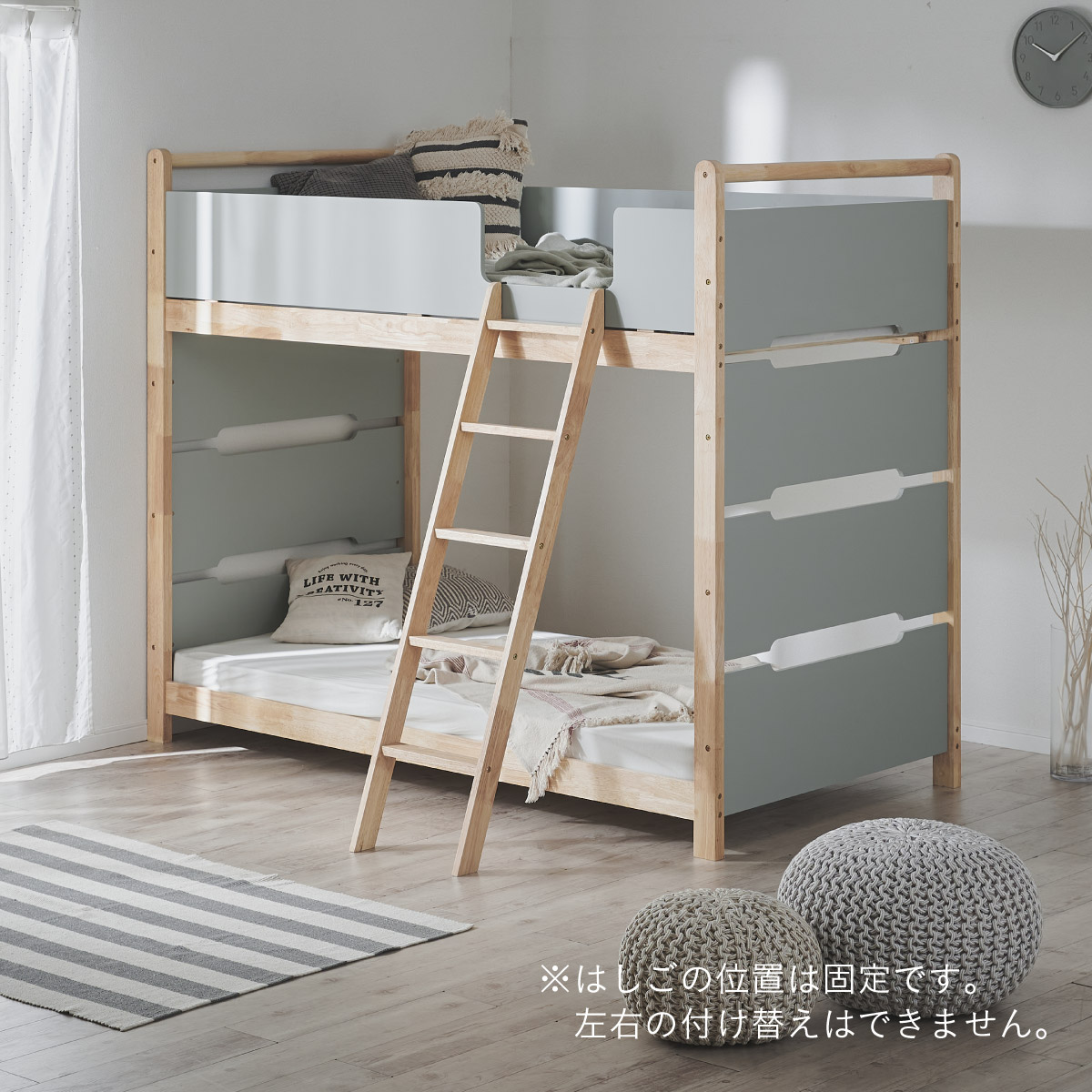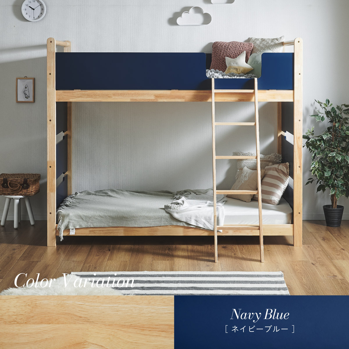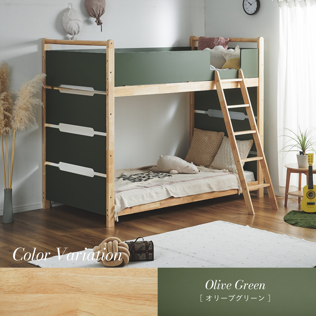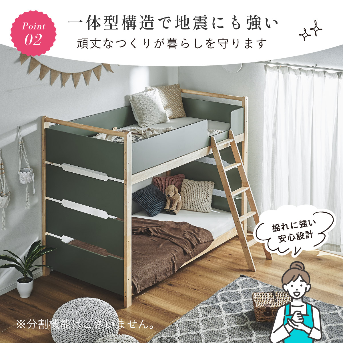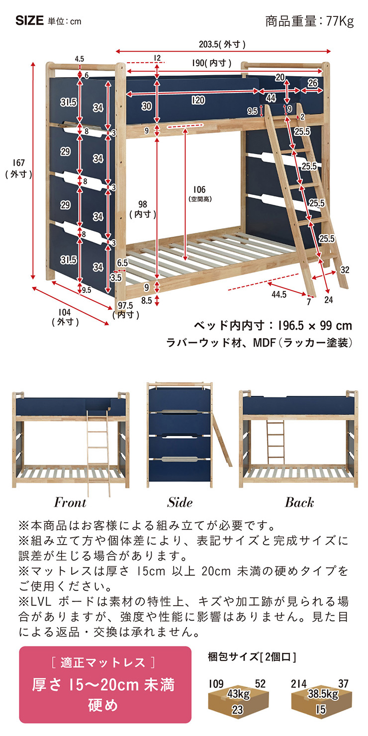 | 2段ベッド マットレスセット Bunk Bed Orit(オリト)+Unity(ユニティ)BKセット ベッド本体+マットレス(ブラック)2枚セットの販売ページです。 ■checkpoint ・選べる4カラー ・一体型で地震に強い ・支柱天然木 ・低めの下段、安心をプラス ■ラバーウッド材×ナチュラルカラー 暮らしと調和する、シンプルな美しさ ■Point 01.S字フックで広がるベッド空間 アイデア次第で自分だけの空間に ■Point 02.一体型構造で地震にも強い 頑丈なつくりが暮らしを守ります。 ※分割機能はございません。 ■Point 03.のびのび使える広々下段 低めの設計で下段空間をしっかり確保 ■Point 04.斜めはしごでラクラク 安定感ある斜め設計で、登り降りも安心 ■Point 05.天然木のぬくもりと耐久性 丈夫な天然木の柱で安定感アップ ■Point 06.高めのサイドフレームで安心 高さを十分にとり、お子さまも安心 ■Point 07.やさしい角丸設計 角を丸く仕上げているので、毎日安心 ■Point 08.安心の強度テスト合格 300kg静止耐荷重試験を公的機関でクリア。 毎日の仕様にも安心と上部をお届けします。 ※耐荷重検査は静止耐荷重です。ベッドの上で激しく動く、急激な力を加える、飛び跳ねるなど1点に集中して負荷をかける行為はお控えください。 ※本商品はお客様による組み立てが必要です。 ※こちらの商品はベッド本体+マットレス(ブラック)2枚セットの販売となります。 ※組み立て方や個体差により、表記サイズと完成サイズに誤差が生じる場合があります。 ※マットレスは厚さ15cm以上20cm未満の硬めタイプをご使用ください。 ※LVLポードは素材の特性上、キズや加工跡が見られる場合がありますが、強度や性能に影響はありません。見た目による返品・交換は承れません。 | |