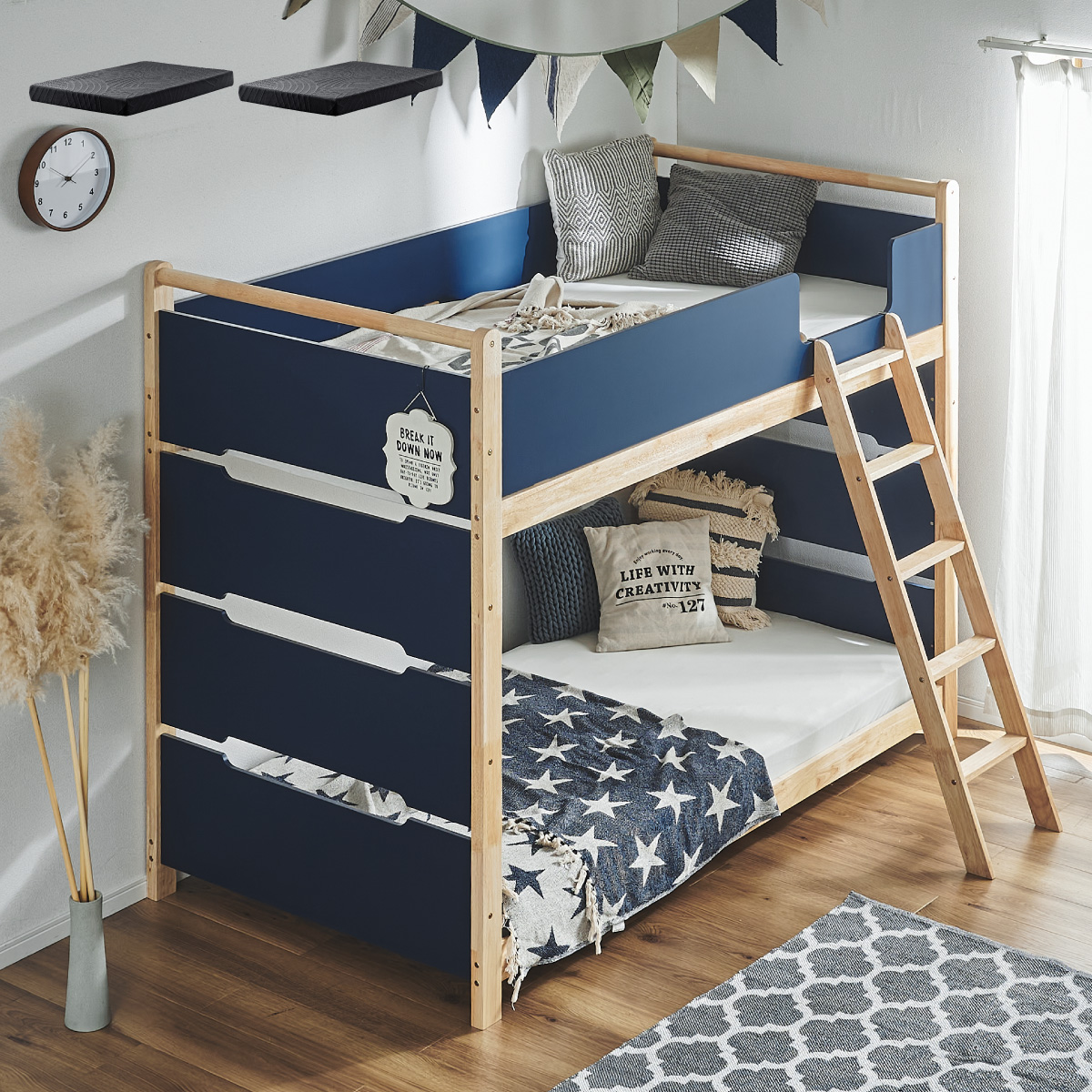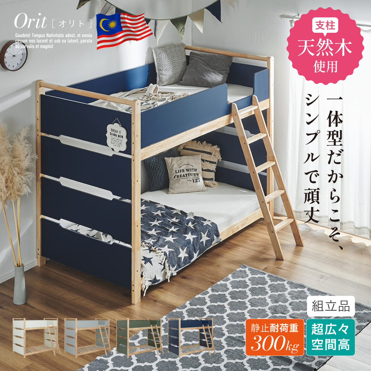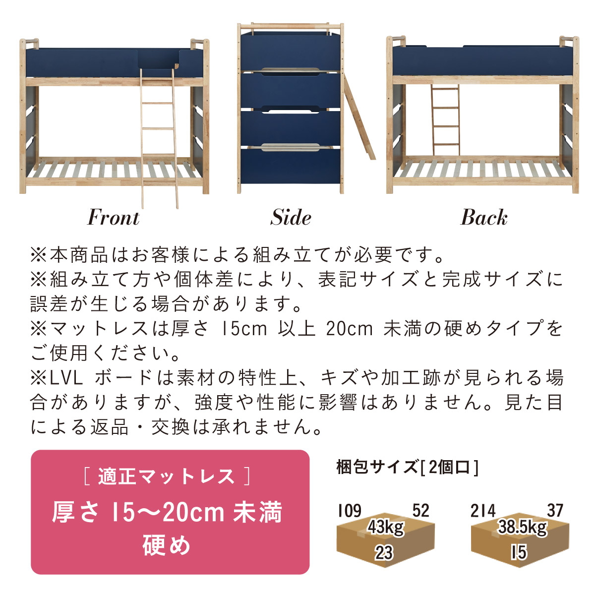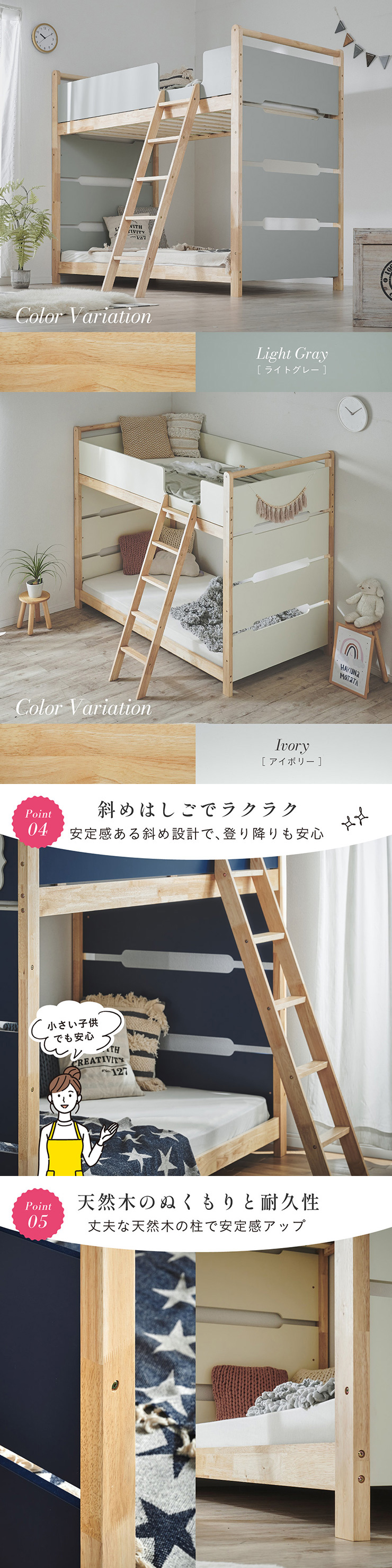 | 2段ベッド マットレスセット Bunk Bed Orit(オリト)+Unity(ユニティ)BKセット ベッド本体+マットレス(ブラック)2枚セットの販売ページです。 ■checkpoint ・選べる4カラー ・一体型で地震に強い ・支柱天然木 ・低めの下段、安心をプラス ■ラバーウッド材×ナチュラルカラー 暮らしと調和する、シンプルな美しさ ■Point 01.S字フックで広がるベッド空間 アイデア次第で自分だけの空間に ■Point 02.一体型構造で地震にも強い 頑丈なつくりが暮らしを守ります。 ※分割機能はございません。 ■Point 03.のびのび使える広々下段 低めの設計で下段空間をしっかり確保 ■Point 04.斜めはしごでラクラク 安定感ある斜め設計で、登り降りも安心 ■Point 05.天然木のぬくもりと耐久性 丈夫な天然木の柱で安定感アップ ■Point 06.高めのサイドフレームで安心 高さを十分にとり、お子さまも安心 ■Point 07.やさしい角丸設計 角を丸く仕上げているので、毎日安心 ■Point 08.安心の強度テスト合格 300kg静止耐荷重試験を公的機関でクリア。 毎日の仕様にも安心と上部をお届けします。 ※耐荷重検査は静止耐荷重です。ベッドの上で激しく動く、急激な力を加える、飛び跳ねるなど1点に集中して負荷をかける行為はお控えください。 ※本商品はお客様による組み立てが必要です。 ※こちらの商品はベッド本体+マットレス(ブラック)2枚セットの販売となります。 ※組み立て方や個体差により、表記サイズと完成サイズに誤差が生じる場合があります。 ※マットレスは厚さ15cm以上20cm未満の硬めタイプをご使用ください。 ※LVLポードは素材の特性上、キズや加工跡が見られる場合がありますが、強度や性能に影響はありません。見た目による返品・交換は承れません。 | |
