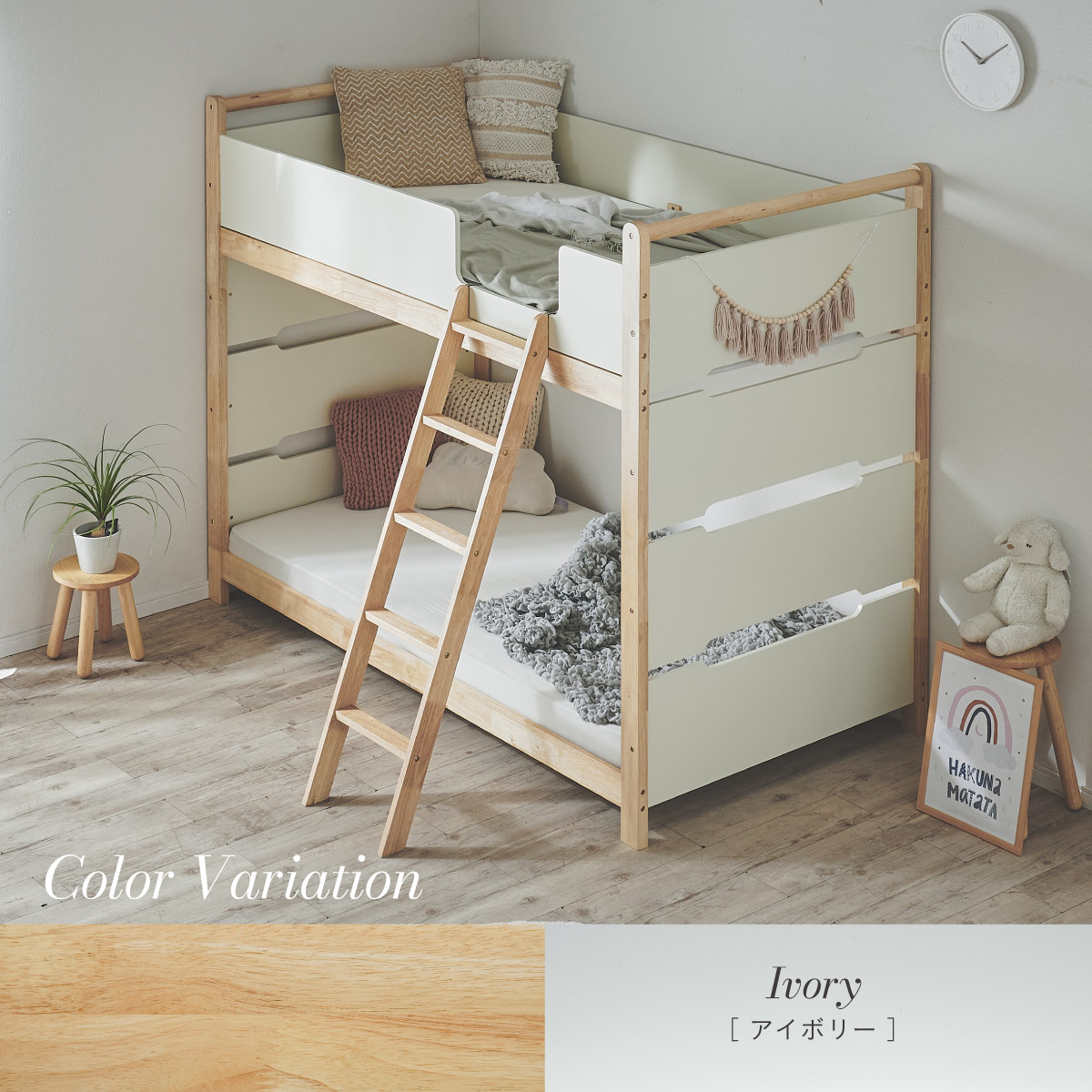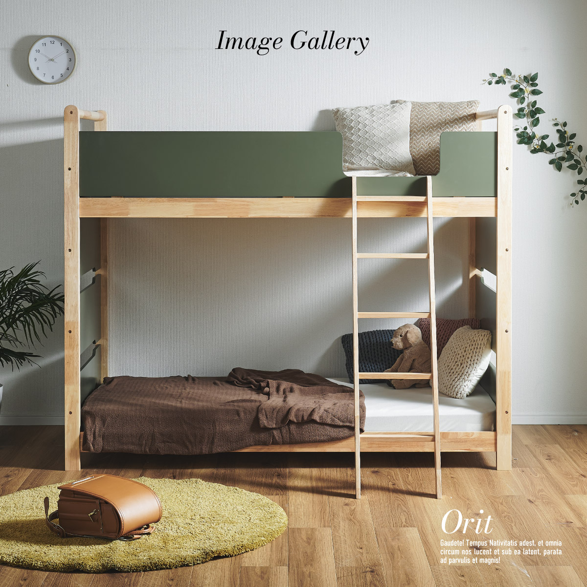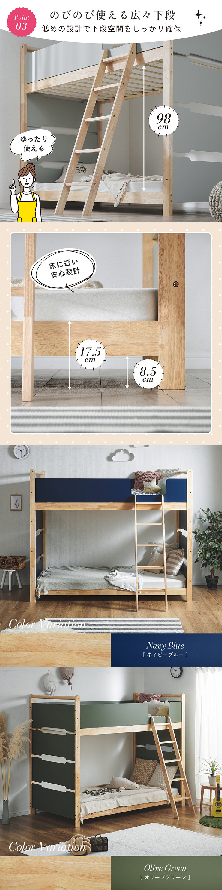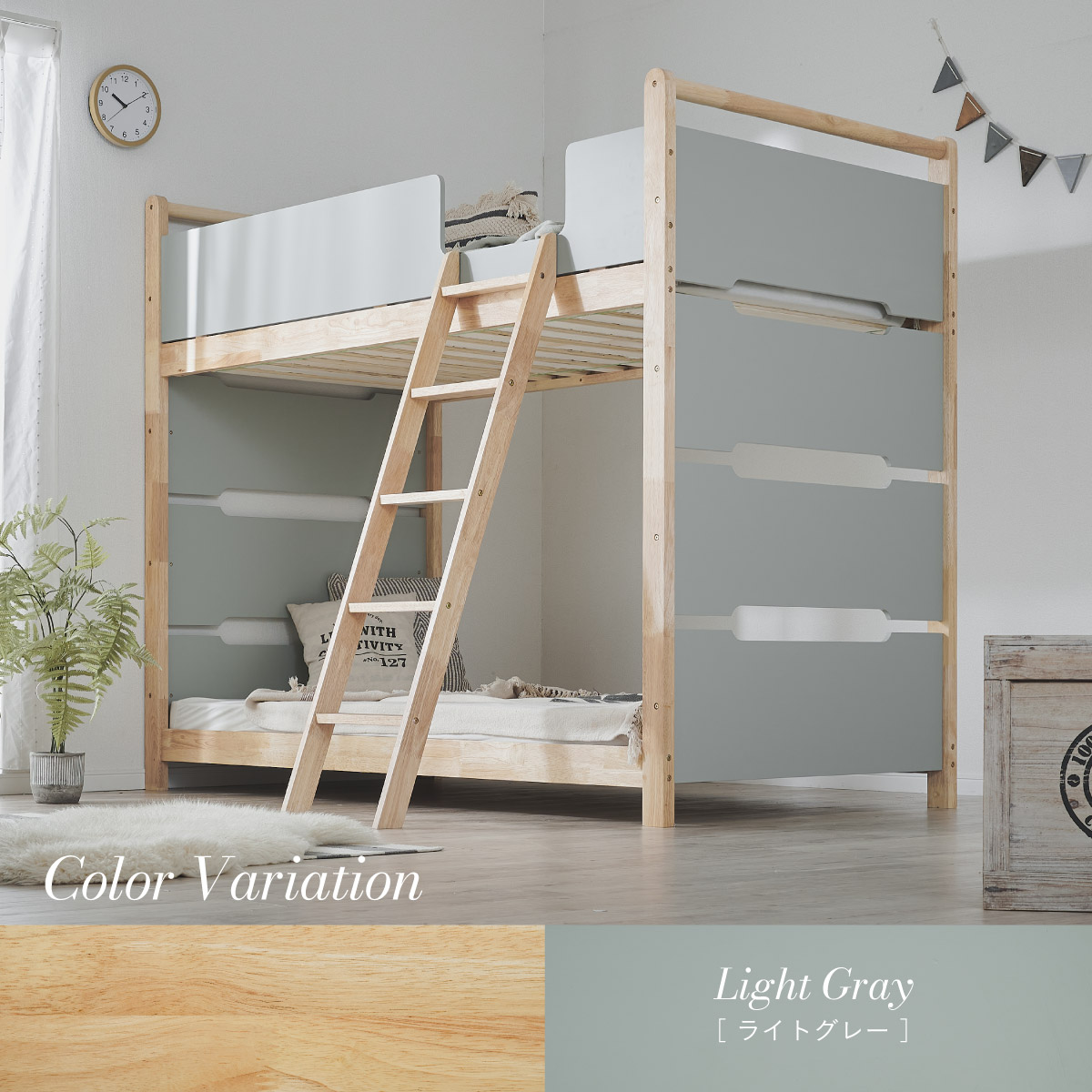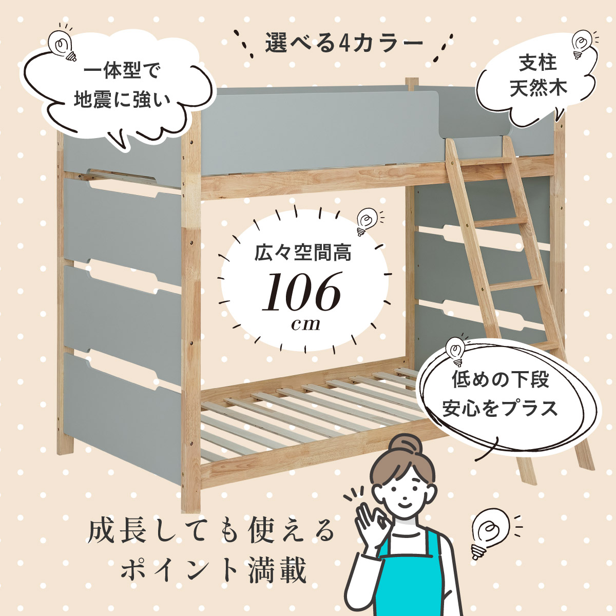 | 2段ベッド マットレスセット Bunk Bed Orit(オリト)+Unity(ユニティ)BKセット ベッド本体+マットレス(ブラック)2枚セットの販売ページです。 ■checkpoint ・選べる4カラー ・一体型で地震に強い ・支柱天然木 ・低めの下段、安心をプラス ■ラバーウッド材×ナチュラルカラー 暮らしと調和する、シンプルな美しさ ■Point 01.S字フックで広がるベッド空間 アイデア次第で自分だけの空間に ■Point 02.一体型構造で地震にも強い 頑丈なつくりが暮らしを守ります。 ※分割機能はございません。 ■Point 03.のびのび使える広々下段 低めの設計で下段空間をしっかり確保 ■Point 04.斜めはしごでラクラク 安定感ある斜め設計で、登り降りも安心 ■Point 05.天然木のぬくもりと耐久性 丈夫な天然木の柱で安定感アップ ■Point 06.高めのサイドフレームで安心 高さを十分にとり、お子さまも安心 ■Point 07.やさしい角丸設計 角を丸く仕上げているので、毎日安心 ■Point 08.安心の強度テスト合格 300kg静止耐荷重試験を公的機関でクリア。 毎日の仕様にも安心と上部をお届けします。 ※耐荷重検査は静止耐荷重です。ベッドの上で激しく動く、急激な力を加える、飛び跳ねるなど1点に集中して負荷をかける行為はお控えください。 ※本商品はお客様による組み立てが必要です。 ※こちらの商品はベッド本体+マットレス(ブラック)2枚セットの販売となります。 ※組み立て方や個体差により、表記サイズと完成サイズに誤差が生じる場合があります。 ※マットレスは厚さ15cm以上20cm未満の硬めタイプをご使用ください。 ※LVLポードは素材の特性上、キズや加工跡が見られる場合がありますが、強度や性能に影響はありません。見た目による返品・交換は承れません。 | |