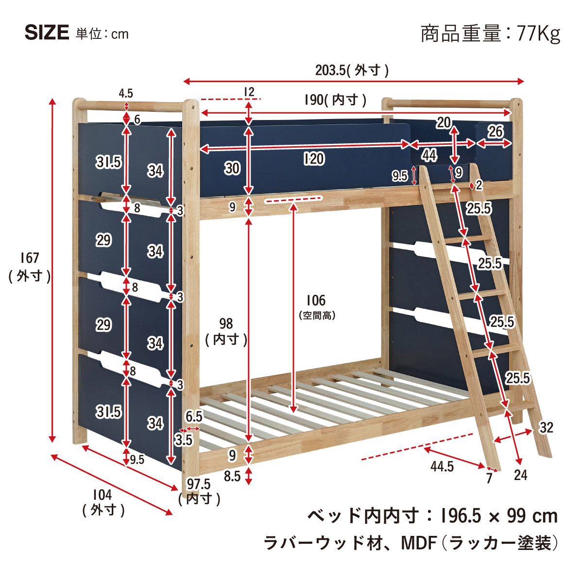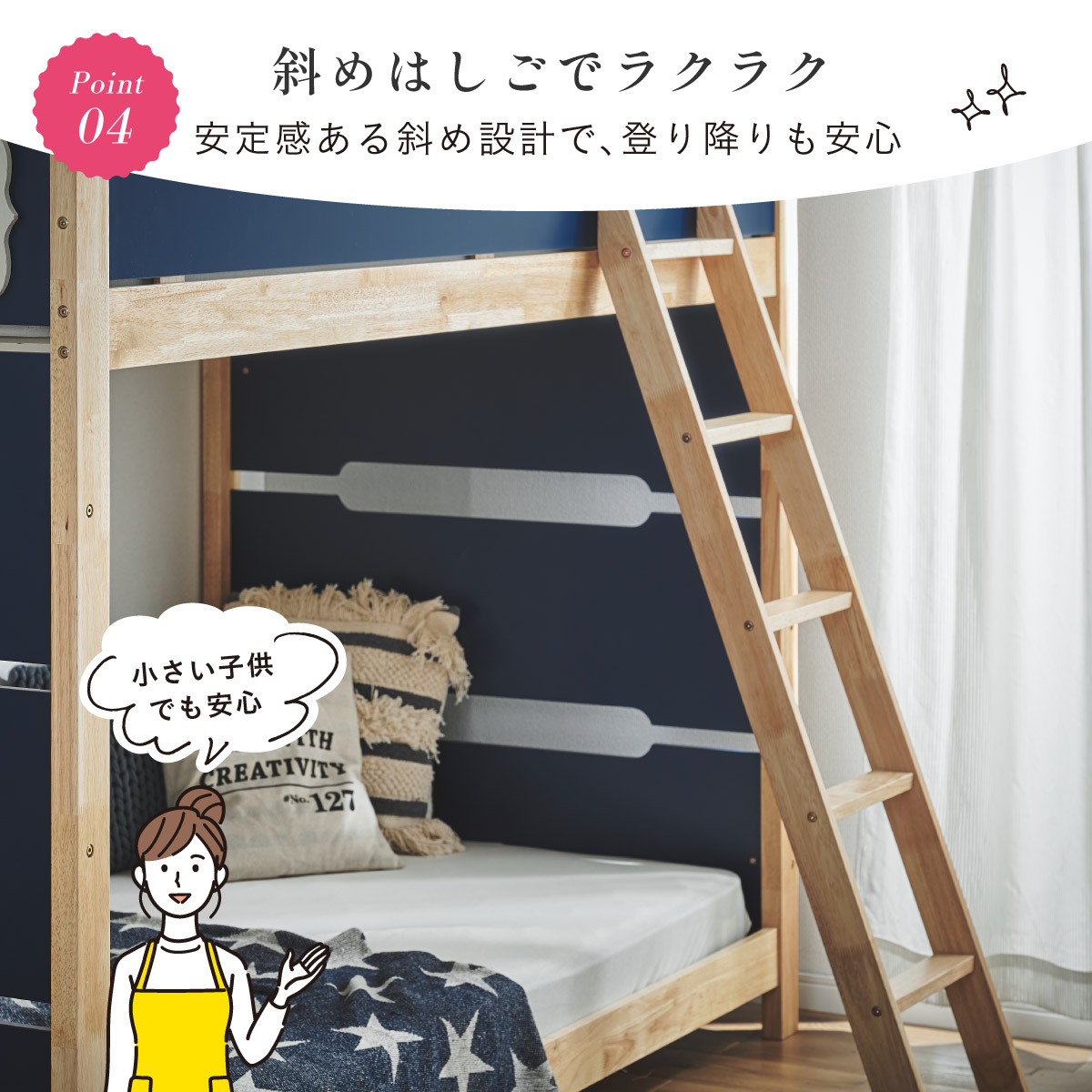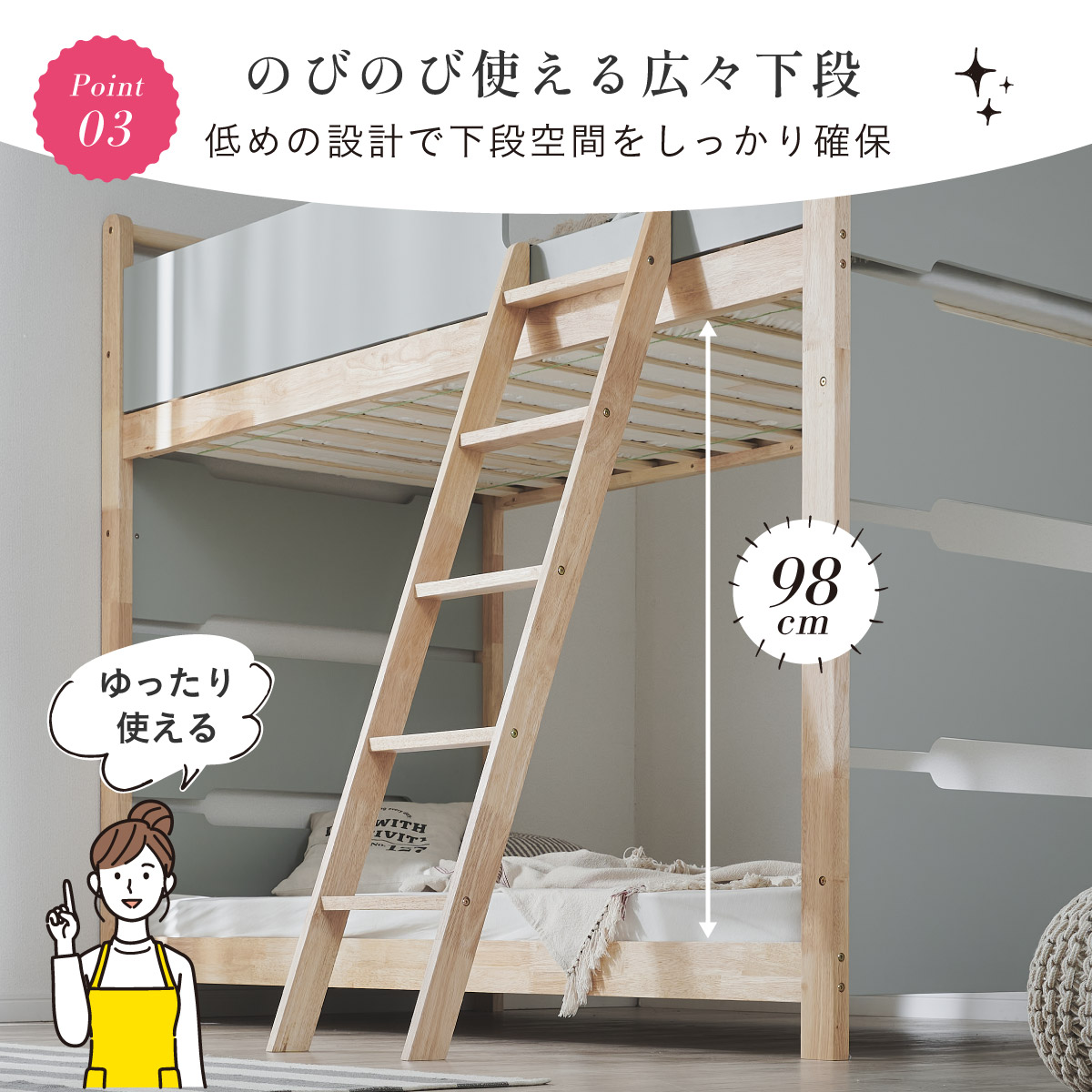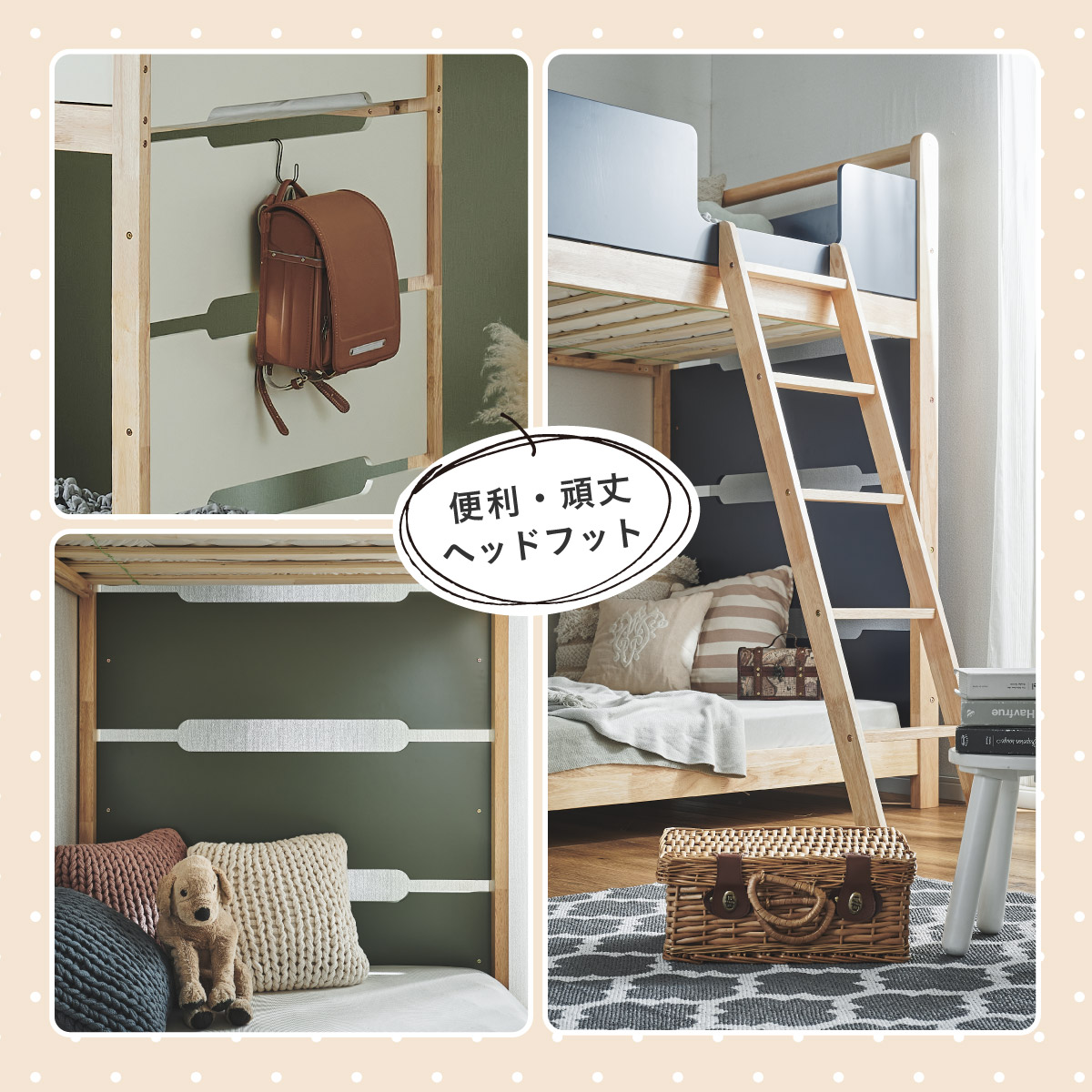 | 2段ベッド マットレスセット Bunk Bed Orit(オリト)+Unity(ユニティ)BKセット ベッド本体+マットレス(ブラック)2枚セットの販売ページです。 ■checkpoint ・選べる4カラー ・一体型で地震に強い ・支柱天然木 ・低めの下段、安心をプラス ■ラバーウッド材×ナチュラルカラー 暮らしと調和する、シンプルな美しさ ■Point 01.S字フックで広がるベッド空間 アイデア次第で自分だけの空間に ■Point 02.一体型構造で地震にも強い 頑丈なつくりが暮らしを守ります。 ※分割機能はございません。 ■Point 03.のびのび使える広々下段 低めの設計で下段空間をしっかり確保 ■Point 04.斜めはしごでラクラク 安定感ある斜め設計で、登り降りも安心 ■Point 05.天然木のぬくもりと耐久性 丈夫な天然木の柱で安定感アップ ■Point 06.高めのサイドフレームで安心 高さを十分にとり、お子さまも安心 ■Point 07.やさしい角丸設計 角を丸く仕上げているので、毎日安心 ■Point 08.安心の強度テスト合格 300kg静止耐荷重試験を公的機関でクリア。 毎日の仕様にも安心と上部をお届けします。 ※耐荷重検査は静止耐荷重です。ベッドの上で激しく動く、急激な力を加える、飛び跳ねるなど1点に集中して負荷をかける行為はお控えください。 ※本商品はお客様による組み立てが必要です。 ※こちらの商品はベッド本体+マットレス(ブラック)2枚セットの販売となります。 ※組み立て方や個体差により、表記サイズと完成サイズに誤差が生じる場合があります。 ※マットレスは厚さ15cm以上20cm未満の硬めタイプをご使用ください。 ※LVLポードは素材の特性上、キズや加工跡が見られる場合がありますが、強度や性能に影響はありません。見た目による返品・交換は承れません。 | |
