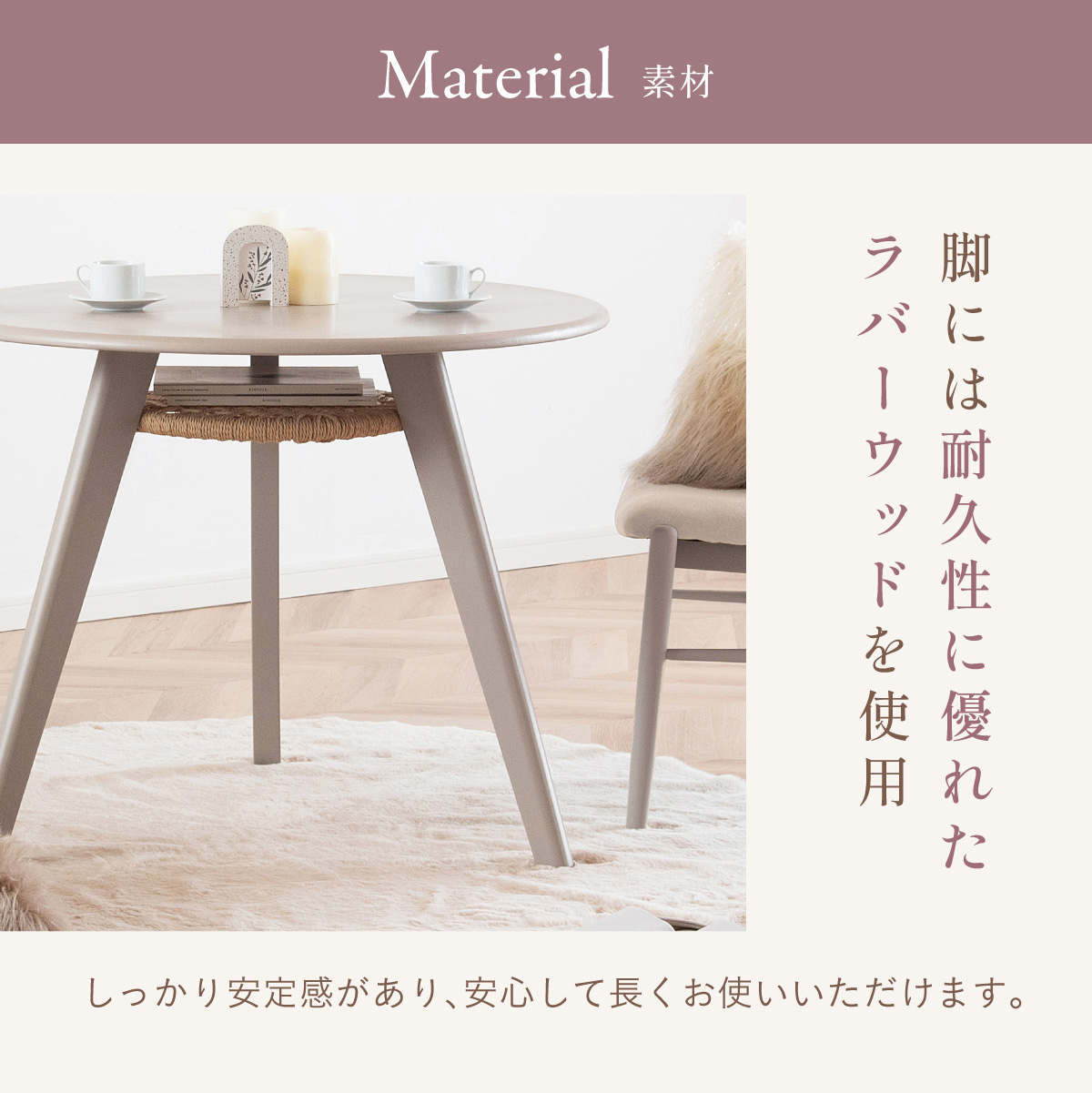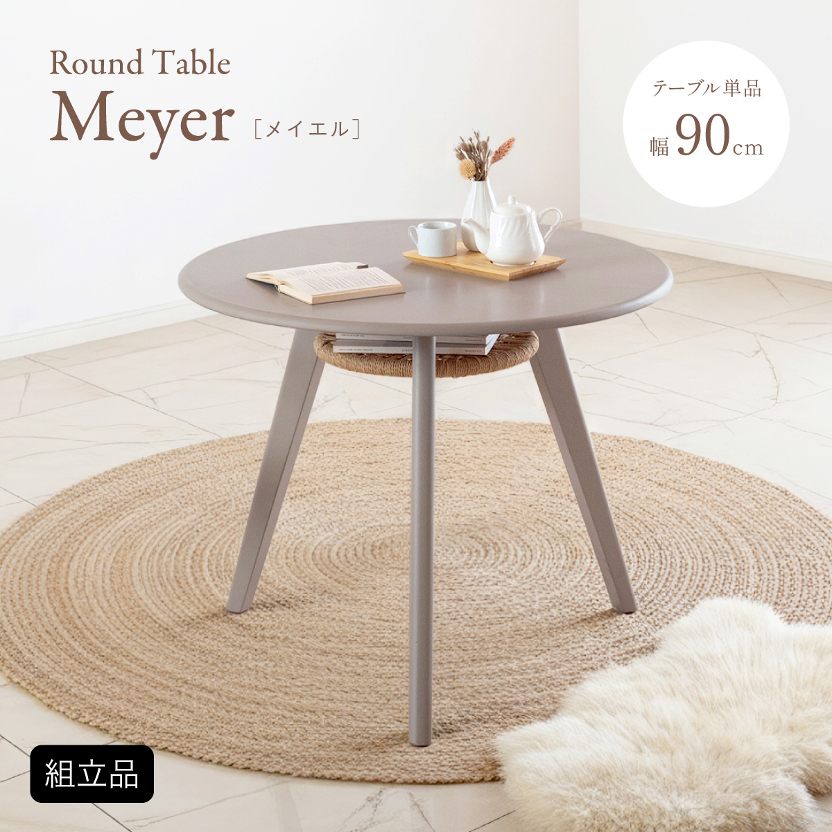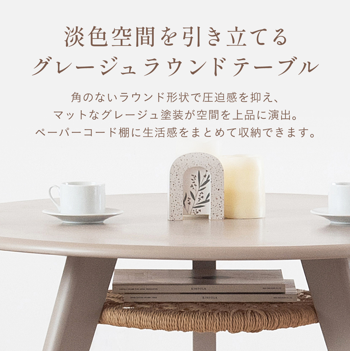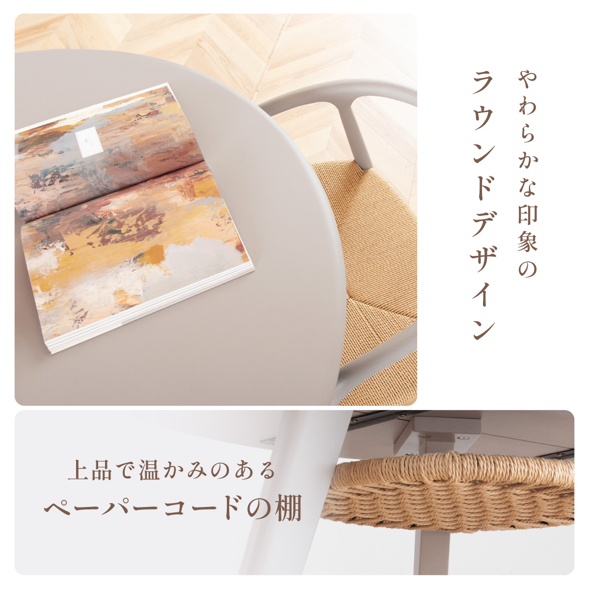 | Round Table Meyer(メイエル) 淡色空間を引き立てるグレージュラウンドテーブル 角のないラウンド形状で圧迫感を抑え、マットなグレージュ塗装が空間を上品に演出。 ペーパーコード棚に生活感をまとめて収納できます。 ■脚には耐久性に優れたラバーウッドを使用 ■木目が見えにくい塗装仕上げ ■汚れに強いウレタン塗装 ■職人が編む[ペーパーコード] 軽やかな印象を与えるペーパーコード棚は、自然素材ならではのやさしさと耐久性を両立。通気性が良く、長く使ってもへたりにくいのが特徴です。 ■detail ・チェアを合わせやすい設計 ・脚が内側に入ったデザインなので棚があってもゆとりのある足元 ・安心の角丸加工 ・金属製反り止め ・アジャスター付き ※こちらの商品はお客様組み立てとなります。 ※組立方や若干の個体差により、表記サイズと完成形サイズに多少の誤差が生じる場合があります。予めご了承下さい。 ※こちらは、テーブル単品の販売ページとなります。チェア等は付属しておりません。 ※熱いものを置くときは、直接置かないように注意してください。 ※防水ではございませんので、濡れた場合は放置せずすぐに拭き取ってください。 | |