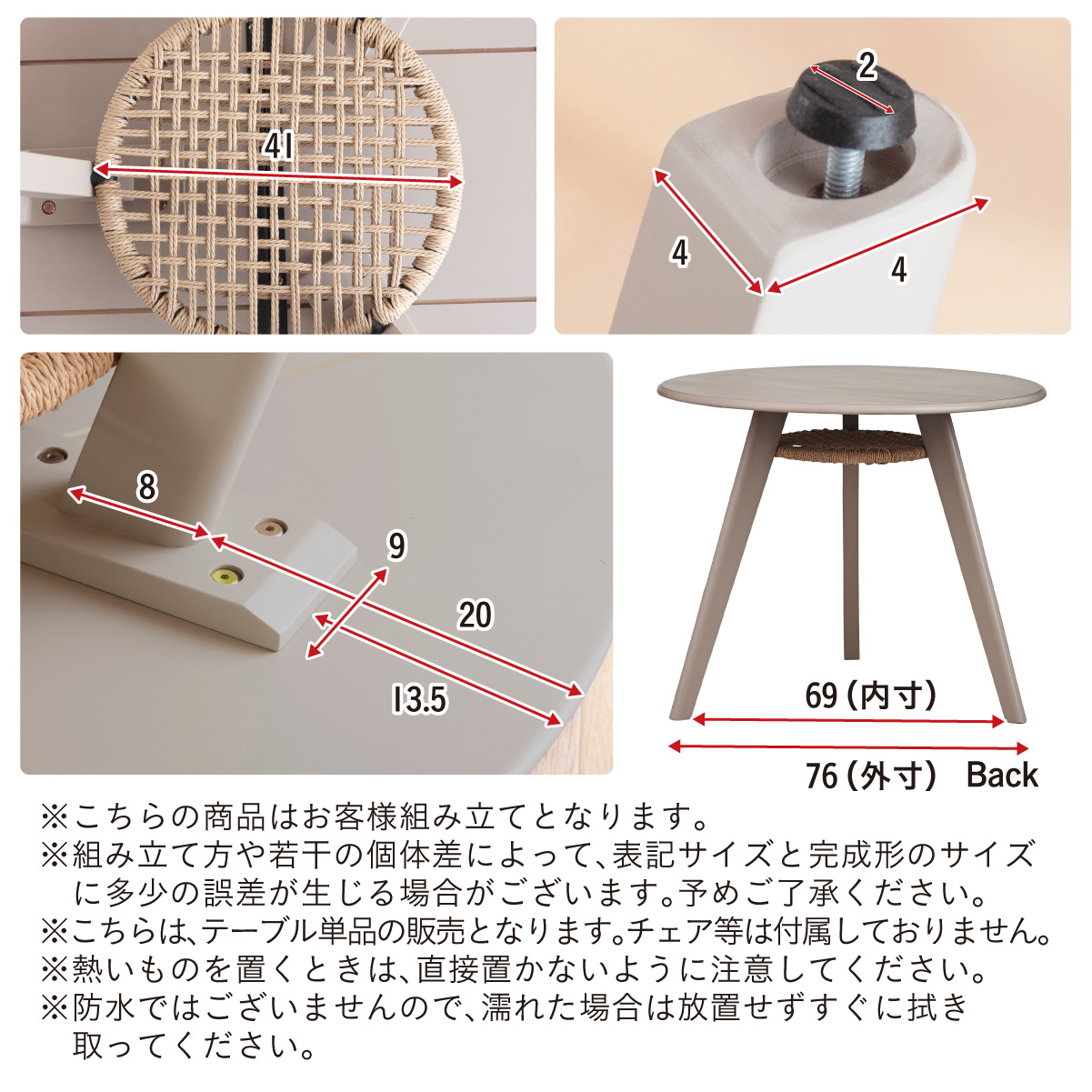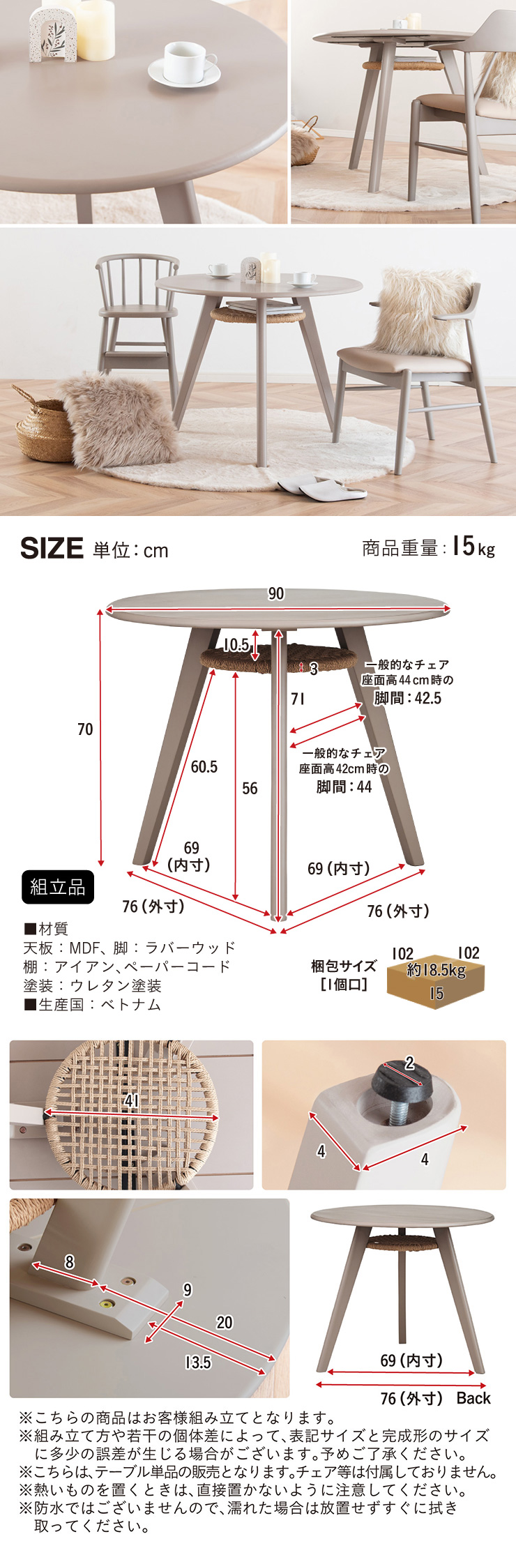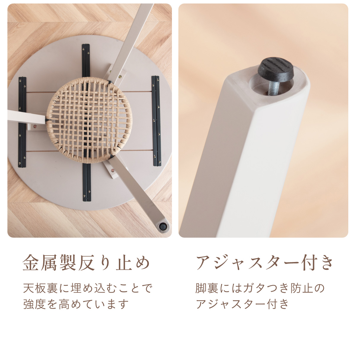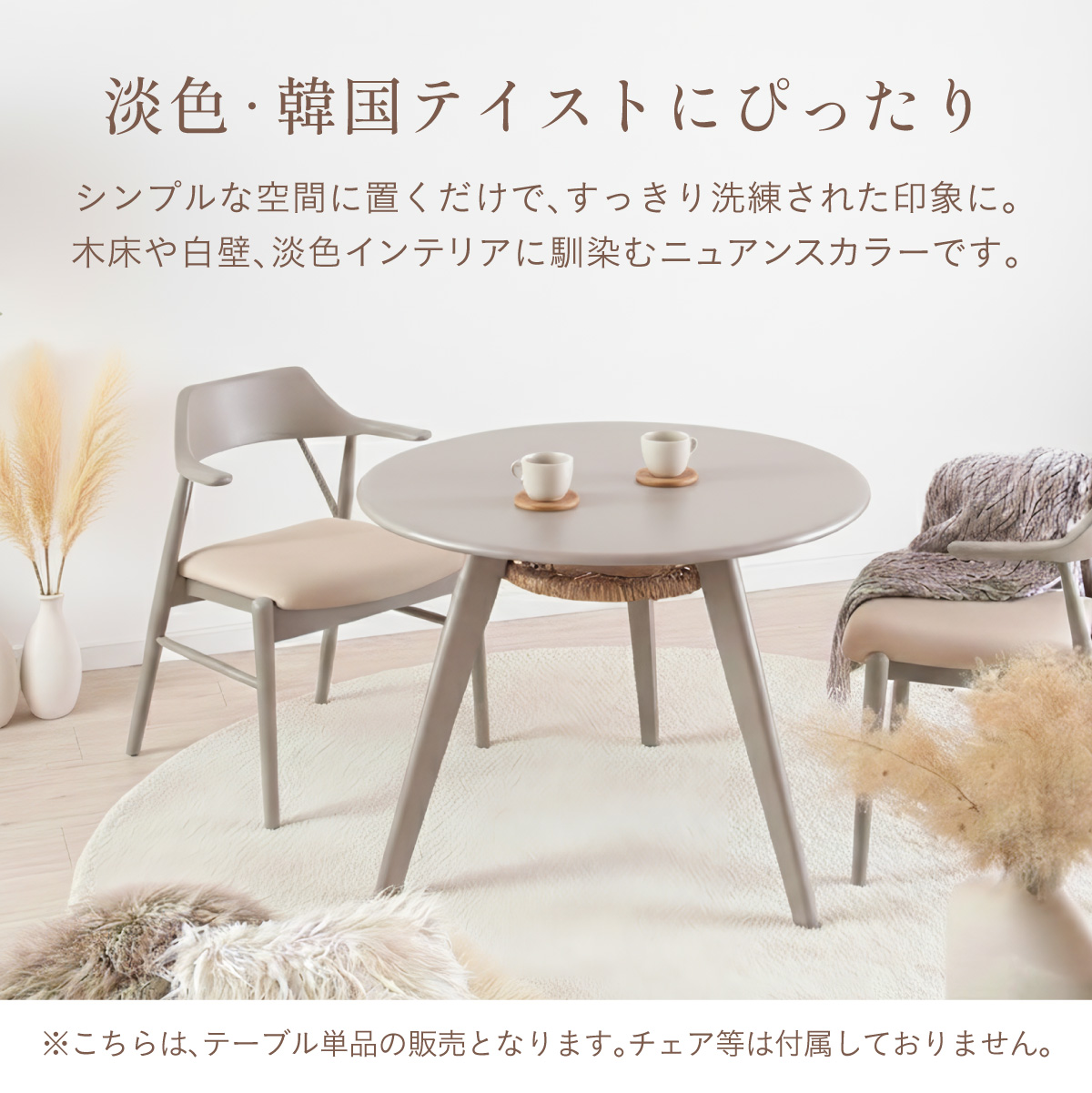 | Round Table Meyer(メイエル) 淡色空間を引き立てるグレージュラウンドテーブル 角のないラウンド形状で圧迫感を抑え、マットなグレージュ塗装が空間を上品に演出。 ペーパーコード棚に生活感をまとめて収納できます。 ■脚には耐久性に優れたラバーウッドを使用 ■木目が見えにくい塗装仕上げ ■汚れに強いウレタン塗装 ■職人が編む[ペーパーコード] 軽やかな印象を与えるペーパーコード棚は、自然素材ならではのやさしさと耐久性を両立。通気性が良く、長く使ってもへたりにくいのが特徴です。 ■detail ・チェアを合わせやすい設計 ・脚が内側に入ったデザインなので棚があってもゆとりのある足元 ・安心の角丸加工 ・金属製反り止め ・アジャスター付き ※こちらの商品はお客様組み立てとなります。 ※組立方や若干の個体差により、表記サイズと完成形サイズに多少の誤差が生じる場合があります。予めご了承下さい。 ※こちらは、テーブル単品の販売ページとなります。チェア等は付属しておりません。 ※熱いものを置くときは、直接置かないように注意してください。 ※防水ではございませんので、濡れた場合は放置せずすぐに拭き取ってください。 | |