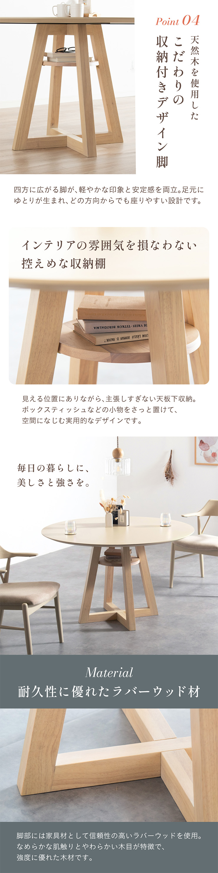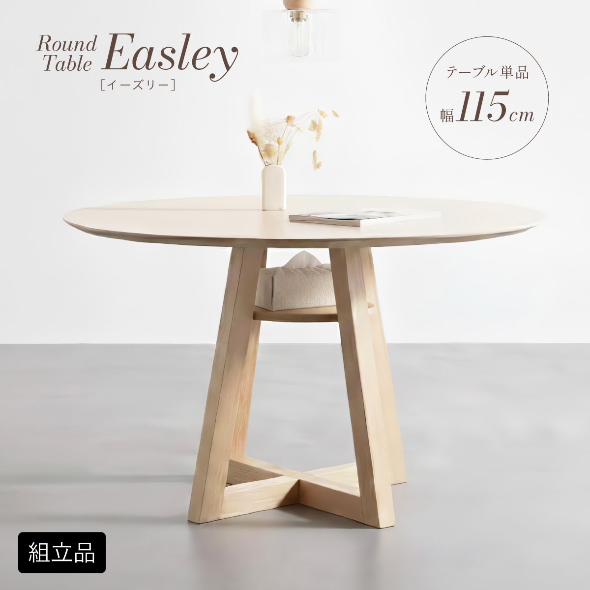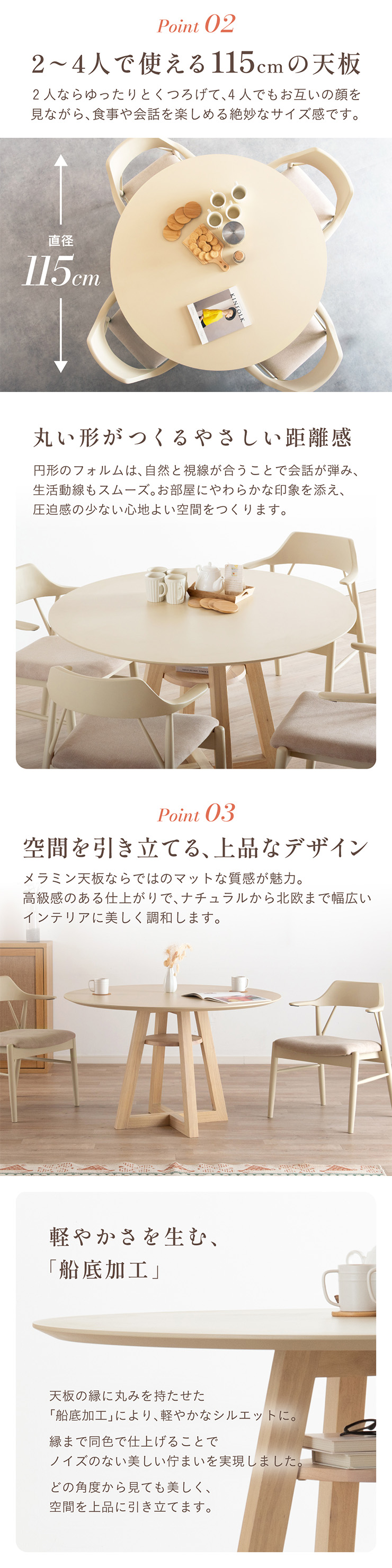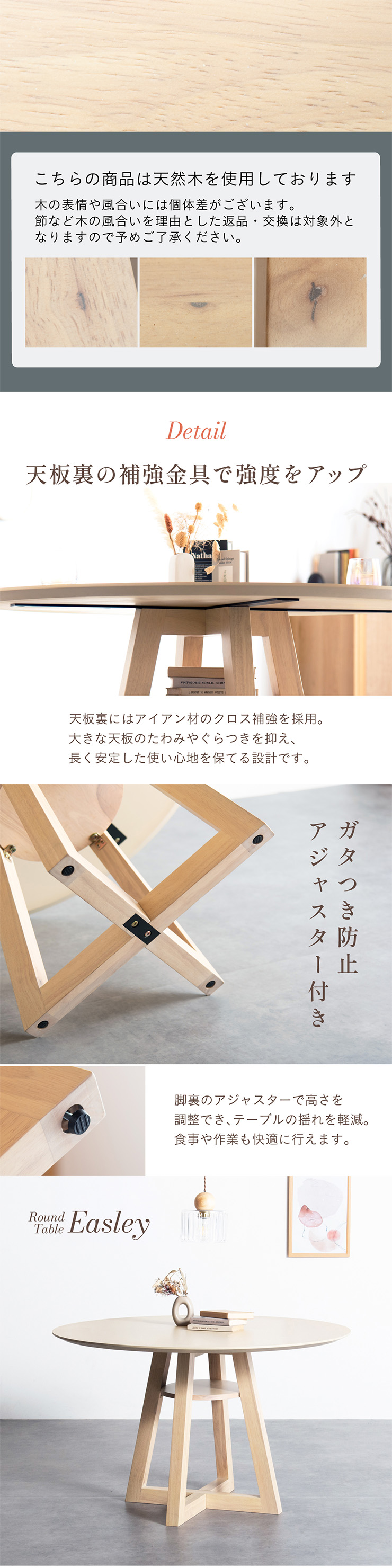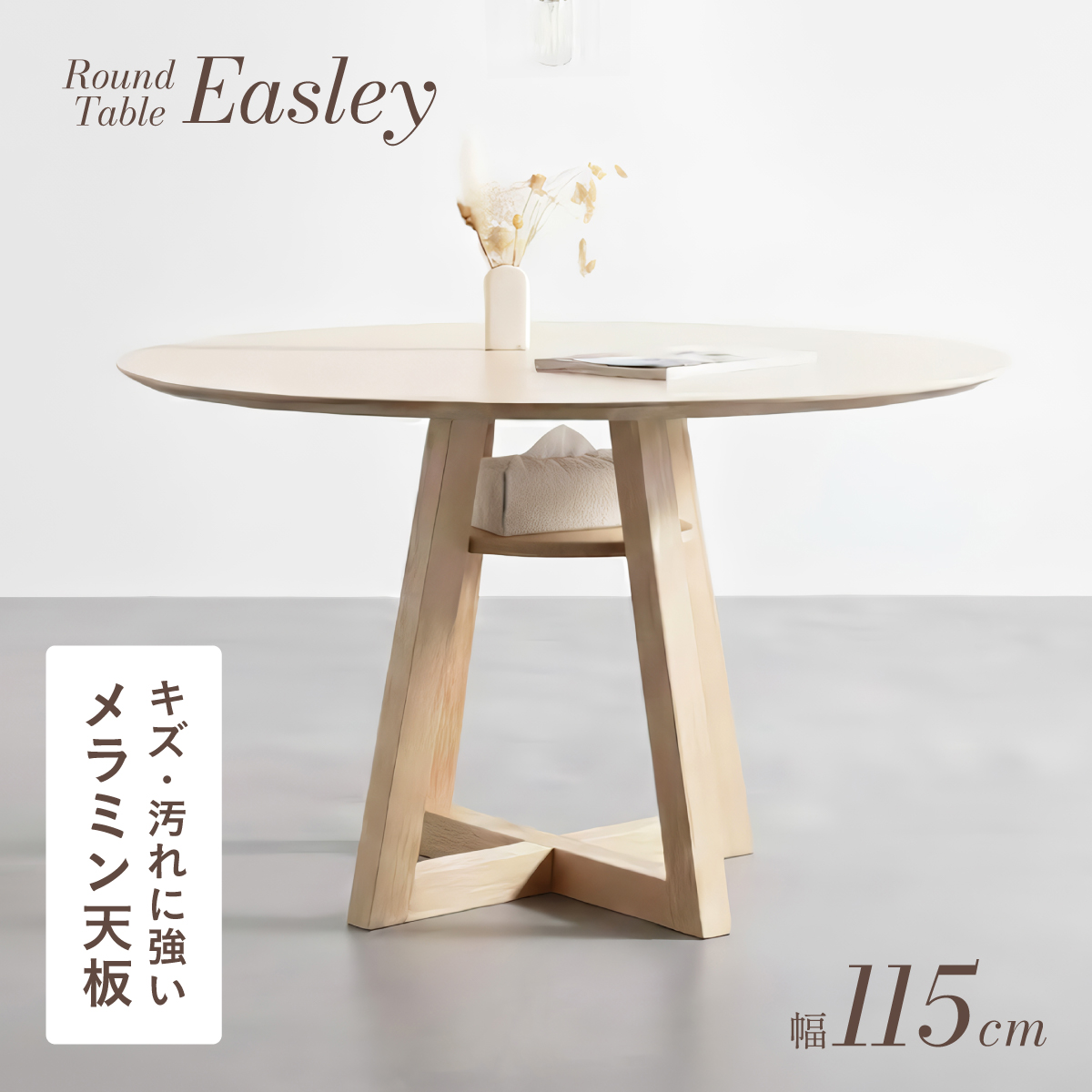 | Round Table Easley(イーズリー) 美しさと強さを兼ね備えたメラミンラウンドテーブル ■傷・汚れに強いメラミン天板 熱や水分、傷や汚れに強く、お手入れ簡単。食べこぼし飲みこぼしにも強いため、お子さまのいるご家庭でも安心です。毎日使っても、美しさが続きます。 ■function/機能 ・耐熱性:熱による変色や変形が起こりにくく、食事シーンでも安心してお使いいただけます。 ・耐摩擦性:擦れや傷に強い表面仕様で、使用頻度が高くても美しい状態を保ちます。 ・耐水性:水分が染み込みにくく、飲み物をこぼしてもサッと拭くだけでお手入れできます。 ・耐汚染性:汚れが付きにくく落としやすいため、清潔な状態を長くキープできます。 ■2~4人で使える115cmの天板 2人ならゆったりとくつろげて、4人でもお互いの顔を見ながら、食事や会話を楽しめる絶妙なサイズ感です。 ■丸い形が作るやさしい距離間 円形のフォルムは、自然と視線が合うことで会話が弾み、生活動線もスムーズ。お部屋にやわらかな印象を添え、圧迫感の少ない心地よい空間をつくります。 ■空間を引き立てる、上品なデザイン メラミン天板ならではのマットな質感が魅力。高級感のある仕上がりで、ナチュラルから北欧まで幅広いインテリアに美しく調和します。 ■軽やかさを生む、「船底加工」 天板の縁に丸みを持たせた「船底加工」により、軽やかなシルエットに。縁まで同色で仕上げることでノイズのない美しい佇まいを実現しました。 どの角度から見ても美しく、空間を上品に引き立てます。 ■天然木を使用したこだわりの収納付きデザイン脚 四方に広がる脚が、軽やかな印象と安定感を両立。足元にゆとりが生まれ、どの方向からでも座りやすい設計です。 ■インテリアの雰囲気を損なわない控えめな収納棚 見える位置にありながら、主張しすぎない天板下収納。ボックスティッシュなどの小物をサッと置けて、空間になじむ実用的なデザインです。 ■Material 耐久性に優れたラバーウッド材 脚部には家具材として信頼性の高いラバーウッドを使用。なめらかな肌触りとやわらかい木目が特徴で、強度に優れた木材です。 ■detail ・天板裏の補強金具で強度をアップ 天板裏にはクロス状の補強材と金具をしっかり固定。大きな天板のたわみやぐらつきを抑え、長く安定した使い心地を保てる設計です。 ・ガタつき防止 アジャスター付き 足裏のアジャスターで高さを調整でき、テーブルの揺れを軽減。食事や作業も快適に行えます。 ※こちらの商品はお客様組み立てとなります。 ※組立方や若干の個体差により、表記サイズと完成形サイズに多少の誤差が生じる場合があります。予めご了承下さい。 ※こちらは、テーブル単品の販売ページとなります。チェア等は付属しておりません。 ※こちらの商品は天然木を使用しております。木の表情や風合いには個体差がございます。節など木の風合いを理由とした返品・交換は対象外となりますのでご了承ください。 ※直火のご使用はお控えください。 ※刃物のご使用はお控えください。 | |