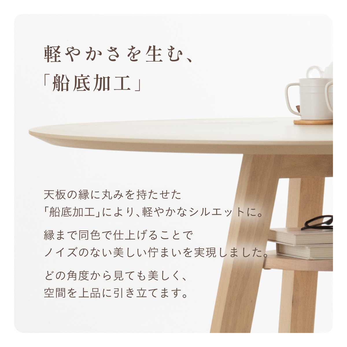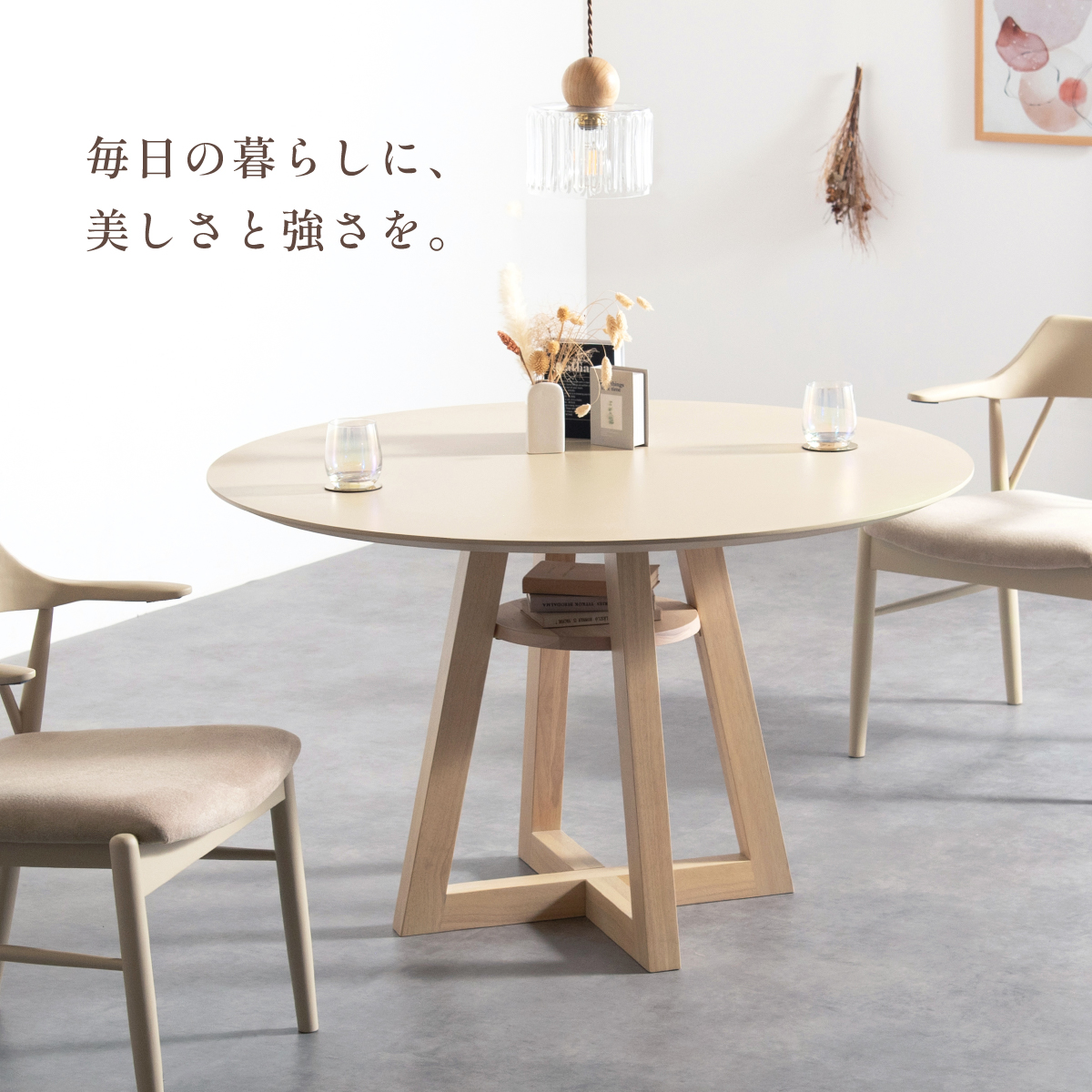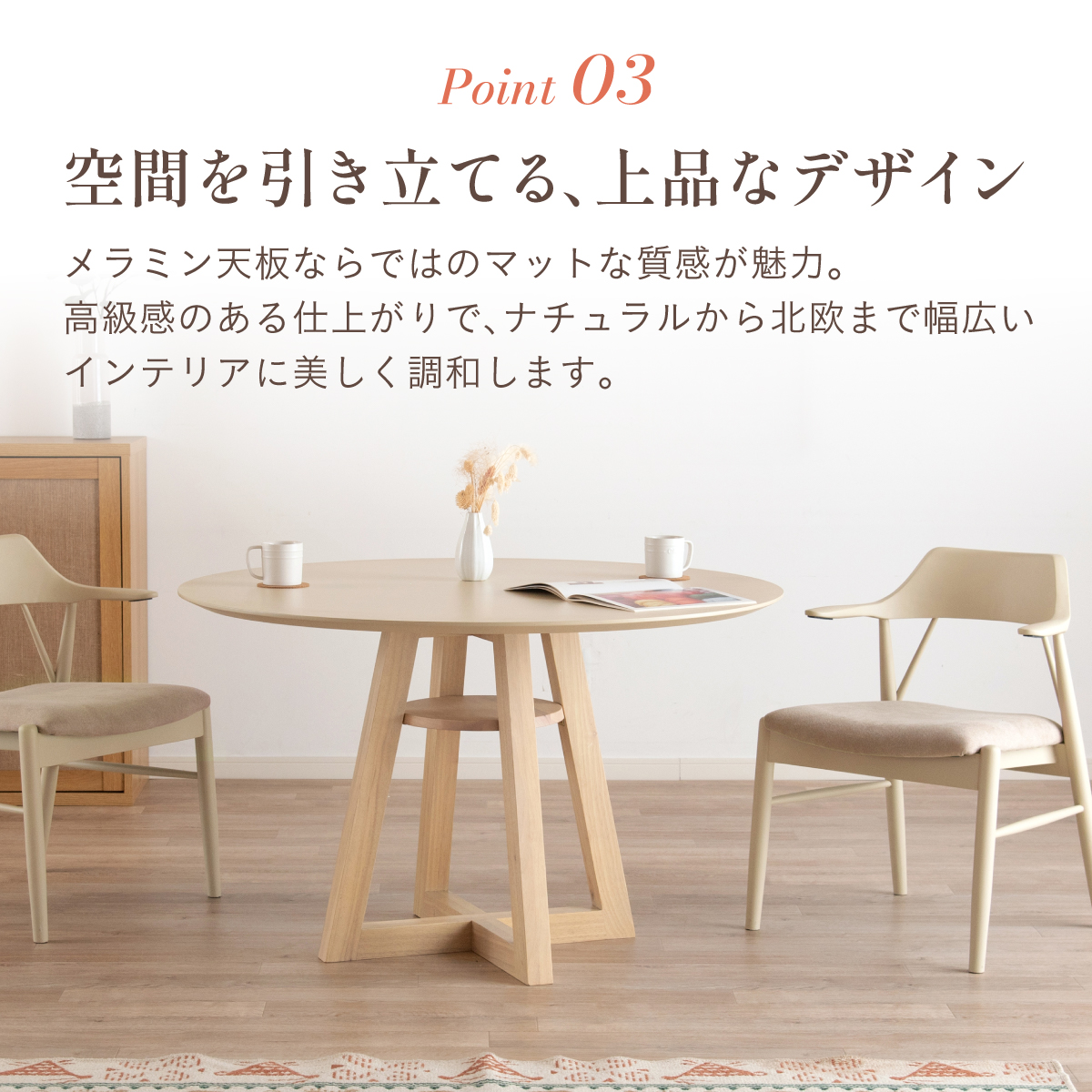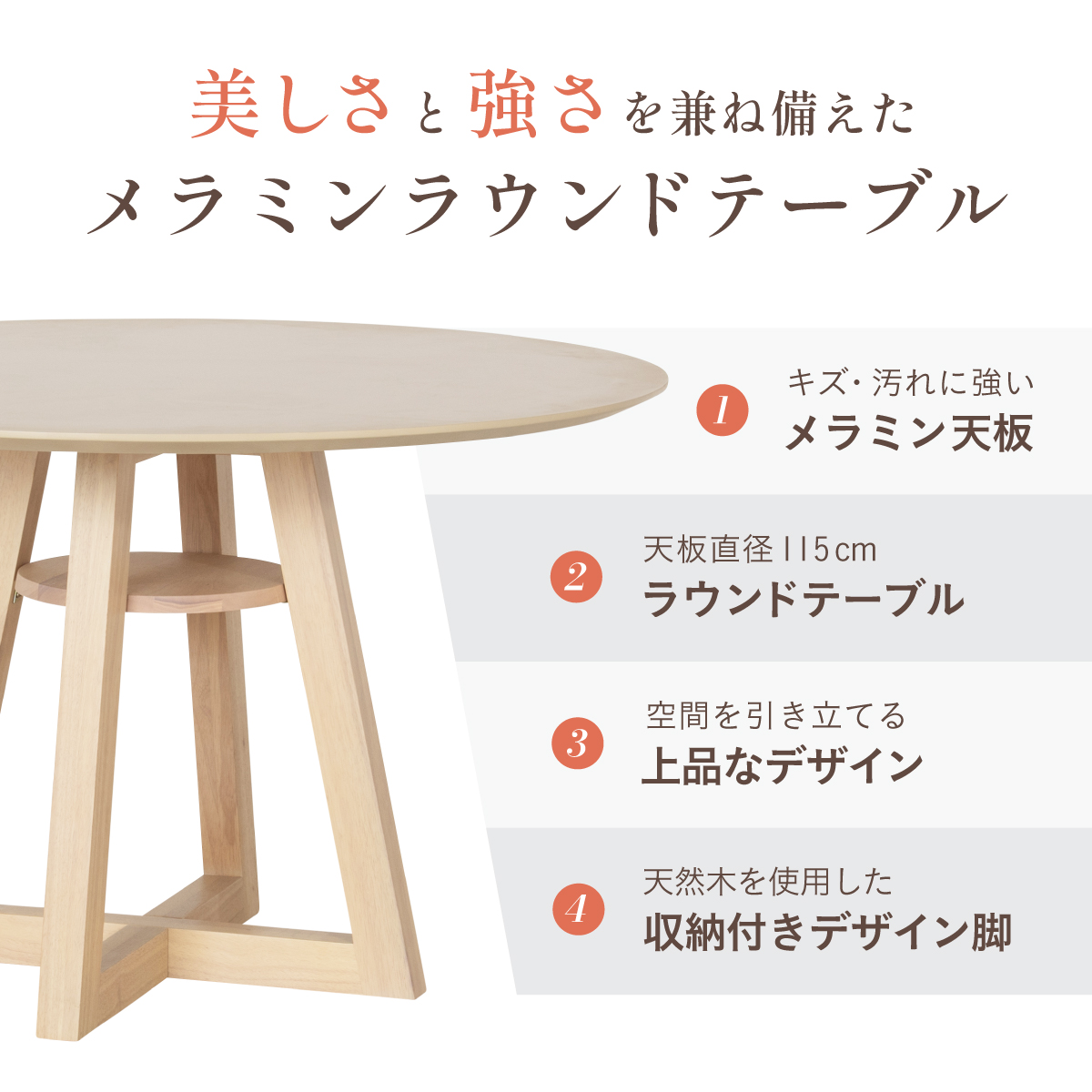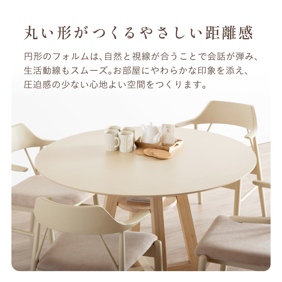 | Round Table Easley(イーズリー) 美しさと強さを兼ね備えたメラミンラウンドテーブル ■傷・汚れに強いメラミン天板 熱や水分、傷や汚れに強く、お手入れ簡単。食べこぼし飲みこぼしにも強いため、お子さまのいるご家庭でも安心です。毎日使っても、美しさが続きます。 ■function/機能 ・耐熱性:熱による変色や変形が起こりにくく、食事シーンでも安心してお使いいただけます。 ・耐摩擦性:擦れや傷に強い表面仕様で、使用頻度が高くても美しい状態を保ちます。 ・耐水性:水分が染み込みにくく、飲み物をこぼしてもサッと拭くだけでお手入れできます。 ・耐汚染性:汚れが付きにくく落としやすいため、清潔な状態を長くキープできます。 ■2~4人で使える115cmの天板 2人ならゆったりとくつろげて、4人でもお互いの顔を見ながら、食事や会話を楽しめる絶妙なサイズ感です。 ■丸い形が作るやさしい距離間 円形のフォルムは、自然と視線が合うことで会話が弾み、生活動線もスムーズ。お部屋にやわらかな印象を添え、圧迫感の少ない心地よい空間をつくります。 ■空間を引き立てる、上品なデザイン メラミン天板ならではのマットな質感が魅力。高級感のある仕上がりで、ナチュラルから北欧まで幅広いインテリアに美しく調和します。 ■軽やかさを生む、「船底加工」 天板の縁に丸みを持たせた「船底加工」により、軽やかなシルエットに。縁まで同色で仕上げることでノイズのない美しい佇まいを実現しました。 どの角度から見ても美しく、空間を上品に引き立てます。 ■天然木を使用したこだわりの収納付きデザイン脚 四方に広がる脚が、軽やかな印象と安定感を両立。足元にゆとりが生まれ、どの方向からでも座りやすい設計です。 ■インテリアの雰囲気を損なわない控えめな収納棚 見える位置にありながら、主張しすぎない天板下収納。ボックスティッシュなどの小物をサッと置けて、空間になじむ実用的なデザインです。 ■Material 耐久性に優れたラバーウッド材 脚部には家具材として信頼性の高いラバーウッドを使用。なめらかな肌触りとやわらかい木目が特徴で、強度に優れた木材です。 ■detail ・天板裏の補強金具で強度をアップ 天板裏にはクロス状の補強材と金具をしっかり固定。大きな天板のたわみやぐらつきを抑え、長く安定した使い心地を保てる設計です。 ・ガタつき防止 アジャスター付き 足裏のアジャスターで高さを調整でき、テーブルの揺れを軽減。食事や作業も快適に行えます。 ※こちらの商品はお客様組み立てとなります。 ※組立方や若干の個体差により、表記サイズと完成形サイズに多少の誤差が生じる場合があります。予めご了承下さい。 ※こちらは、テーブル単品の販売ページとなります。チェア等は付属しておりません。 ※こちらの商品は天然木を使用しております。木の表情や風合いには個体差がございます。節など木の風合いを理由とした返品・交換は対象外となりますのでご了承ください。 ※直火のご使用はお控えください。 ※刃物のご使用はお控えください。 | |