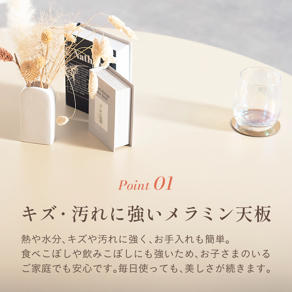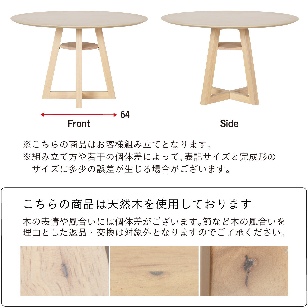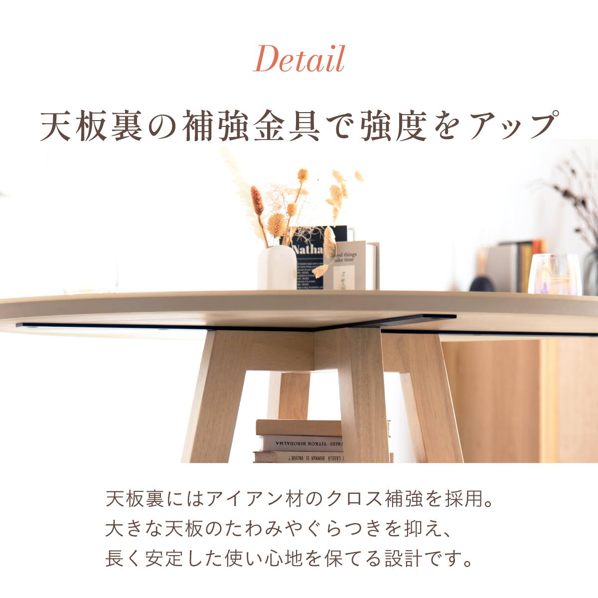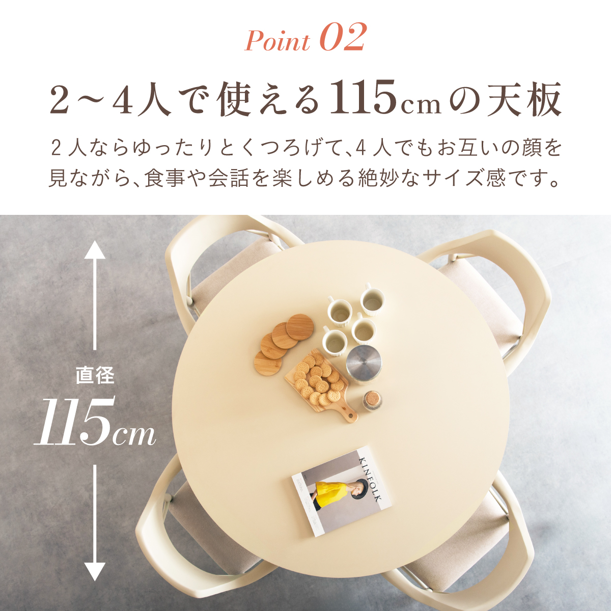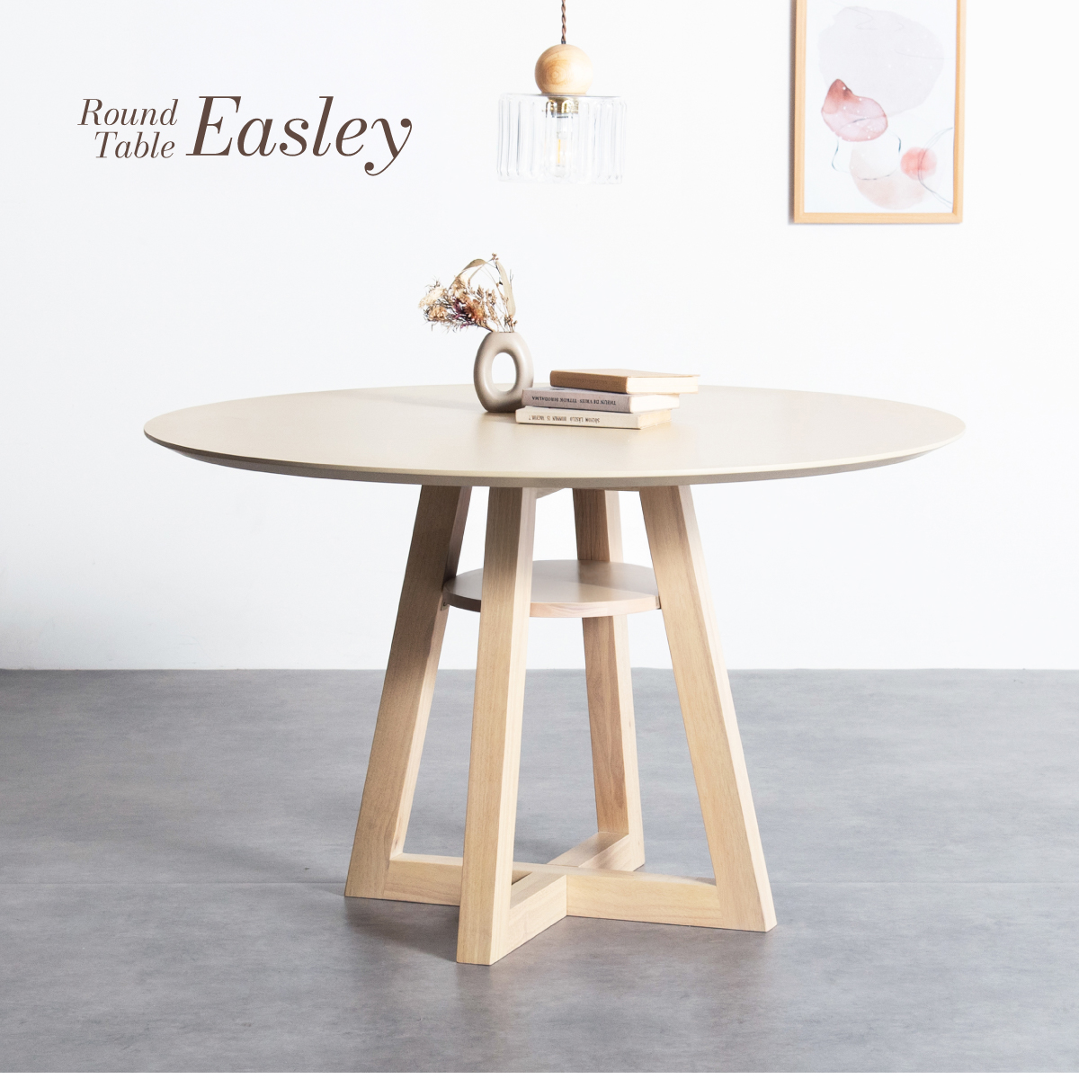 | Round Table Easley(イーズリー) 美しさと強さを兼ね備えたメラミンラウンドテーブル ■傷・汚れに強いメラミン天板 熱や水分、傷や汚れに強く、お手入れ簡単。食べこぼし飲みこぼしにも強いため、お子さまのいるご家庭でも安心です。毎日使っても、美しさが続きます。 ■function/機能 ・耐熱性:熱による変色や変形が起こりにくく、食事シーンでも安心してお使いいただけます。 ・耐摩擦性:擦れや傷に強い表面仕様で、使用頻度が高くても美しい状態を保ちます。 ・耐水性:水分が染み込みにくく、飲み物をこぼしてもサッと拭くだけでお手入れできます。 ・耐汚染性:汚れが付きにくく落としやすいため、清潔な状態を長くキープできます。 ■2~4人で使える115cmの天板 2人ならゆったりとくつろげて、4人でもお互いの顔を見ながら、食事や会話を楽しめる絶妙なサイズ感です。 ■丸い形が作るやさしい距離間 円形のフォルムは、自然と視線が合うことで会話が弾み、生活動線もスムーズ。お部屋にやわらかな印象を添え、圧迫感の少ない心地よい空間をつくります。 ■空間を引き立てる、上品なデザイン メラミン天板ならではのマットな質感が魅力。高級感のある仕上がりで、ナチュラルから北欧まで幅広いインテリアに美しく調和します。 ■軽やかさを生む、「船底加工」 天板の縁に丸みを持たせた「船底加工」により、軽やかなシルエットに。縁まで同色で仕上げることでノイズのない美しい佇まいを実現しました。 どの角度から見ても美しく、空間を上品に引き立てます。 ■天然木を使用したこだわりの収納付きデザイン脚 四方に広がる脚が、軽やかな印象と安定感を両立。足元にゆとりが生まれ、どの方向からでも座りやすい設計です。 ■インテリアの雰囲気を損なわない控えめな収納棚 見える位置にありながら、主張しすぎない天板下収納。ボックスティッシュなどの小物をサッと置けて、空間になじむ実用的なデザインです。 ■Material 耐久性に優れたラバーウッド材 脚部には家具材として信頼性の高いラバーウッドを使用。なめらかな肌触りとやわらかい木目が特徴で、強度に優れた木材です。 ■detail ・天板裏の補強金具で強度をアップ 天板裏にはクロス状の補強材と金具をしっかり固定。大きな天板のたわみやぐらつきを抑え、長く安定した使い心地を保てる設計です。 ・ガタつき防止 アジャスター付き 足裏のアジャスターで高さを調整でき、テーブルの揺れを軽減。食事や作業も快適に行えます。 ※こちらの商品はお客様組み立てとなります。 ※組立方や若干の個体差により、表記サイズと完成形サイズに多少の誤差が生じる場合があります。予めご了承下さい。 ※こちらは、テーブル単品の販売ページとなります。チェア等は付属しておりません。 ※こちらの商品は天然木を使用しております。木の表情や風合いには個体差がございます。節など木の風合いを理由とした返品・交換は対象外となりますのでご了承ください。 ※直火のご使用はお控えください。 ※刃物のご使用はお控えください。 | |