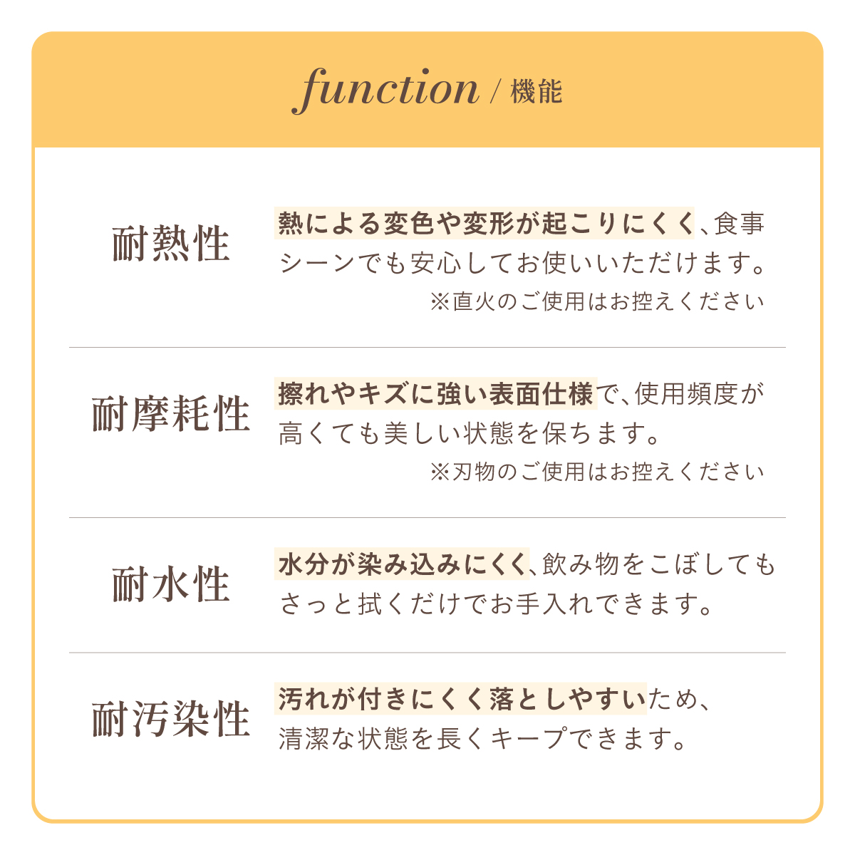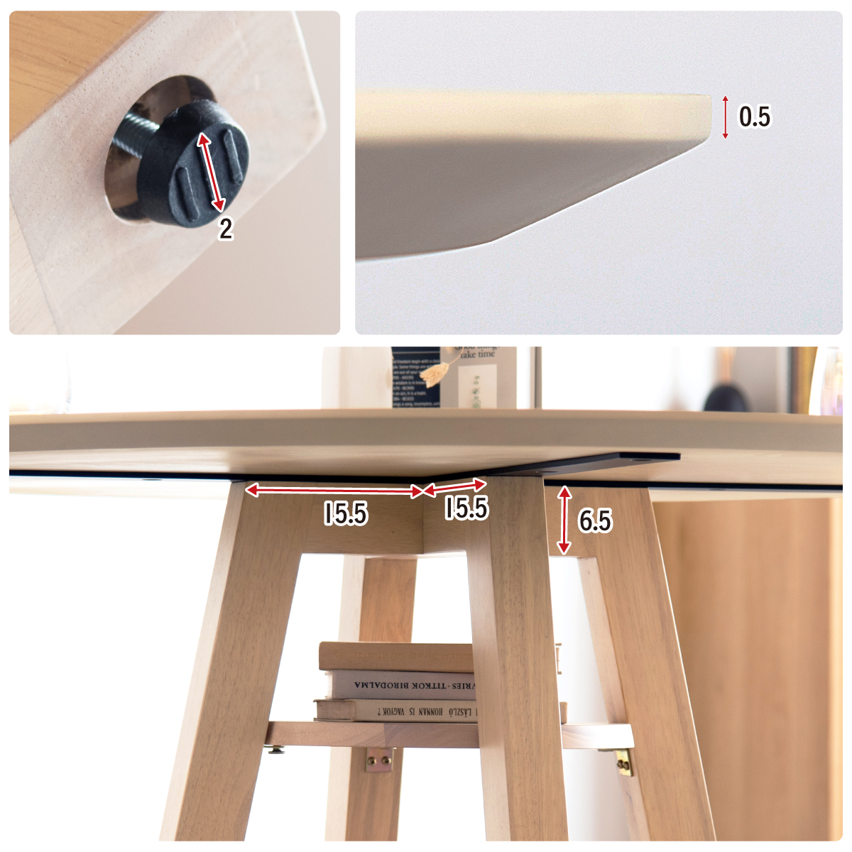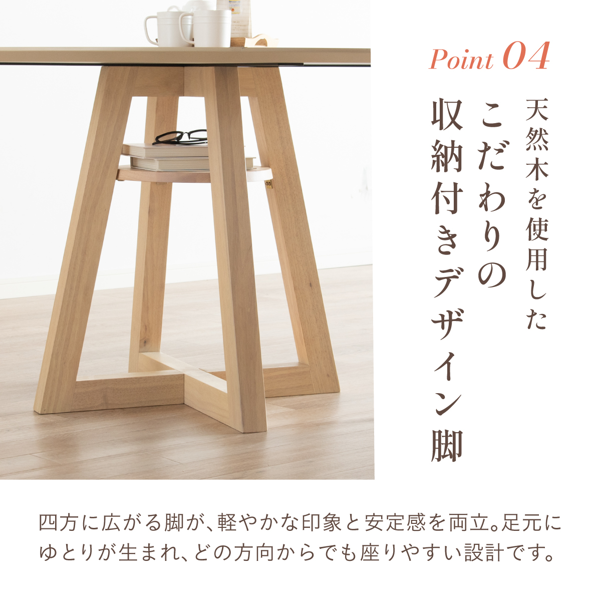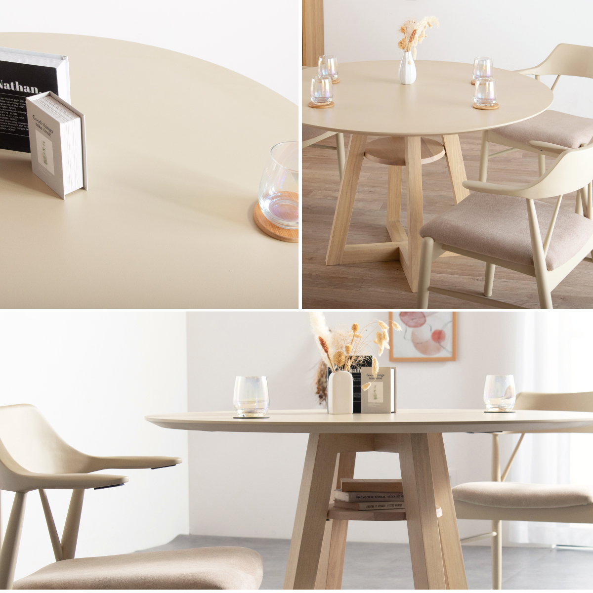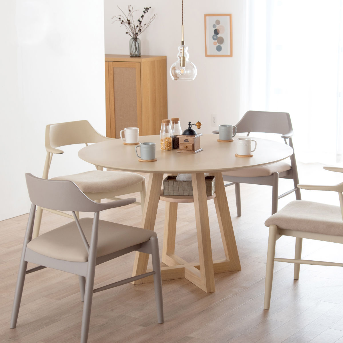 | Round Table Easley(イーズリー) 美しさと強さを兼ね備えたメラミンラウンドテーブル ■傷・汚れに強いメラミン天板 熱や水分、傷や汚れに強く、お手入れ簡単。食べこぼし飲みこぼしにも強いため、お子さまのいるご家庭でも安心です。毎日使っても、美しさが続きます。 ■function/機能 ・耐熱性:熱による変色や変形が起こりにくく、食事シーンでも安心してお使いいただけます。 ・耐摩擦性:擦れや傷に強い表面仕様で、使用頻度が高くても美しい状態を保ちます。 ・耐水性:水分が染み込みにくく、飲み物をこぼしてもサッと拭くだけでお手入れできます。 ・耐汚染性:汚れが付きにくく落としやすいため、清潔な状態を長くキープできます。 ■2~4人で使える115cmの天板 2人ならゆったりとくつろげて、4人でもお互いの顔を見ながら、食事や会話を楽しめる絶妙なサイズ感です。 ■丸い形が作るやさしい距離間 円形のフォルムは、自然と視線が合うことで会話が弾み、生活動線もスムーズ。お部屋にやわらかな印象を添え、圧迫感の少ない心地よい空間をつくります。 ■空間を引き立てる、上品なデザイン メラミン天板ならではのマットな質感が魅力。高級感のある仕上がりで、ナチュラルから北欧まで幅広いインテリアに美しく調和します。 ■軽やかさを生む、「船底加工」 天板の縁に丸みを持たせた「船底加工」により、軽やかなシルエットに。縁まで同色で仕上げることでノイズのない美しい佇まいを実現しました。 どの角度から見ても美しく、空間を上品に引き立てます。 ■天然木を使用したこだわりの収納付きデザイン脚 四方に広がる脚が、軽やかな印象と安定感を両立。足元にゆとりが生まれ、どの方向からでも座りやすい設計です。 ■インテリアの雰囲気を損なわない控えめな収納棚 見える位置にありながら、主張しすぎない天板下収納。ボックスティッシュなどの小物をサッと置けて、空間になじむ実用的なデザインです。 ■Material 耐久性に優れたラバーウッド材 脚部には家具材として信頼性の高いラバーウッドを使用。なめらかな肌触りとやわらかい木目が特徴で、強度に優れた木材です。 ■detail ・天板裏の補強金具で強度をアップ 天板裏にはクロス状の補強材と金具をしっかり固定。大きな天板のたわみやぐらつきを抑え、長く安定した使い心地を保てる設計です。 ・ガタつき防止 アジャスター付き 足裏のアジャスターで高さを調整でき、テーブルの揺れを軽減。食事や作業も快適に行えます。 ※こちらの商品はお客様組み立てとなります。 ※組立方や若干の個体差により、表記サイズと完成形サイズに多少の誤差が生じる場合があります。予めご了承下さい。 ※こちらは、テーブル単品の販売ページとなります。チェア等は付属しておりません。 ※こちらの商品は天然木を使用しております。木の表情や風合いには個体差がございます。節など木の風合いを理由とした返品・交換は対象外となりますのでご了承ください。 ※直火のご使用はお控えください。 ※刃物のご使用はお控えください。 | |