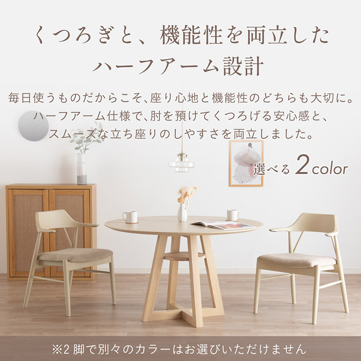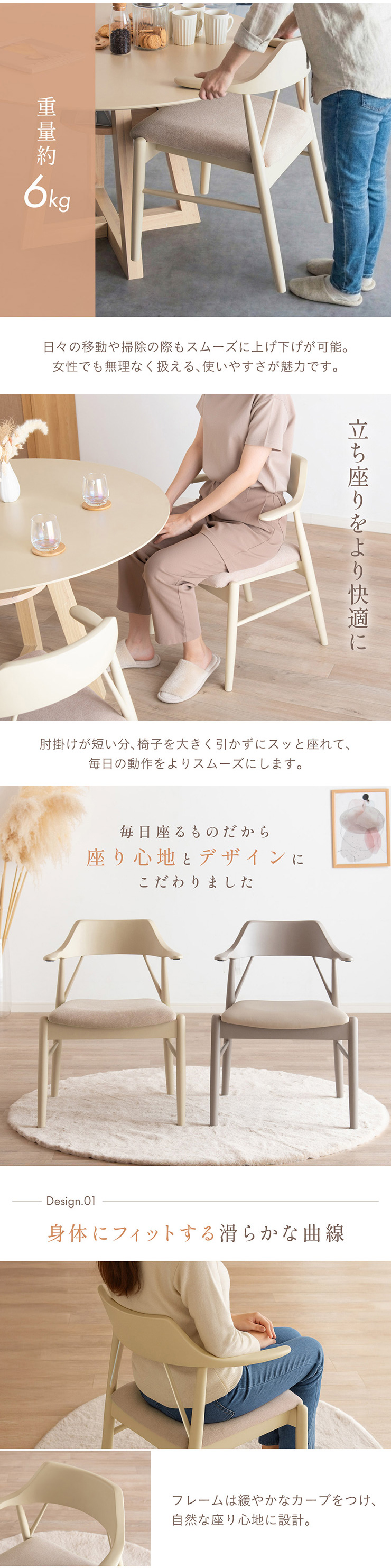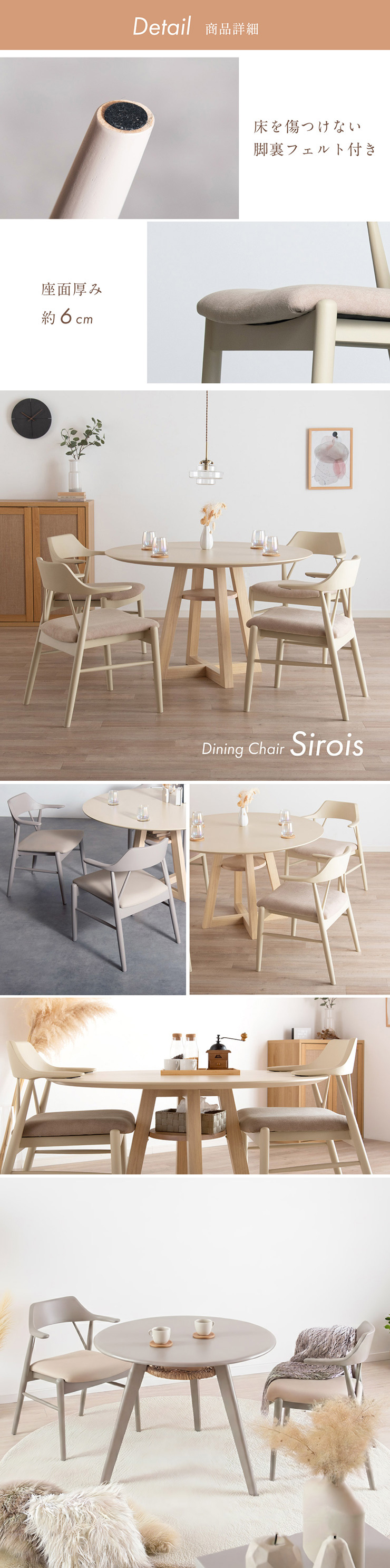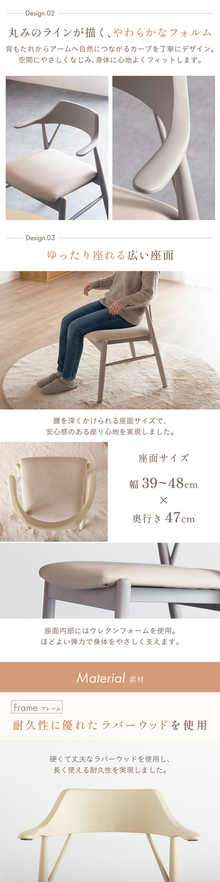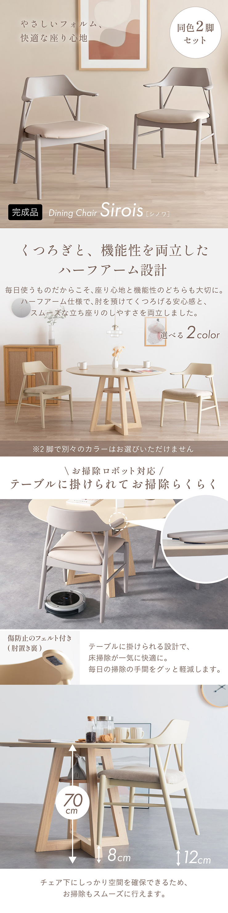| Round Chair Sirois(シノワ) 2脚セット くつろぎと、機能性を両立したハーフアーム設計 毎日使うものだからこそ、座り心地と機能性のどちらも大切に。ハーフアーム仕様で、肘を預けてくつろげる安心感と、スムーズな立ち座りのしやすさを両立しました。 ■お掃除ロボット対応!テーブルに掛けられてお掃除らくらく ・傷防止のフェルト付き(肘置き裏) ・テーブルに掛けられる設計で、床掃除が一気に快適に。毎日の掃除の手間をグッと軽減します。 ・チェア下にしっかり空間を確保できる為、お掃除ロボットはもちろん、掃除でのお手入れもスムーズに行なえます。 ・重量約6kg 日々の移動や掃除の際もスムーズに上げ下げが可能。女性でも無理なく扱える、使いやすさが魅力です。 ・肘掛けが短い分、椅子を大きく引かずにスッと座れて、毎日の動作をよりスムーズにします。 ■身体にフィットする滑らかな曲線 フレームは緩やかなカーブをつけ、自然な座り心地に設計。 ■丸みのラインが描く、やわらかなフォルム 背もたれからアームへ自然につながるカーブを丁寧にデザイン。空間にやさしくなじみ、身体に心地よくフィットします。 ■ゆったり座れる広い座面 腰を深くかけられる座面サイズで、安心感のある座り心地を実現しました。 座面内部にはウレタンフォームを使用。ほどよい弾力で身体をやさしく支えます。 ■Material 素材 ・frame(フレーム):耐久性に優れたラバーウッドを使用。 ・木目が見えにくい塗装仕上げ・ファブリック:やわらかな肌触りと通気性の良さで、一年中快適に過ごせます。 ・PVC:水や汚れに強く、お手入れ簡単。清潔を保ちやすい素材です。 ■detail ・床を傷付けない脚裏フェルト付き ・座面厚み約6cm ※こちらの商品は完成品となります。 ※組立方や若干の個体差により、表記サイズと完成形サイズに多少の誤差が生じる場合があります。予めご了承下さい。 ※こちらは、チェア2脚セットの販売ページとなります。テーブル等は付属しておりません。 | |