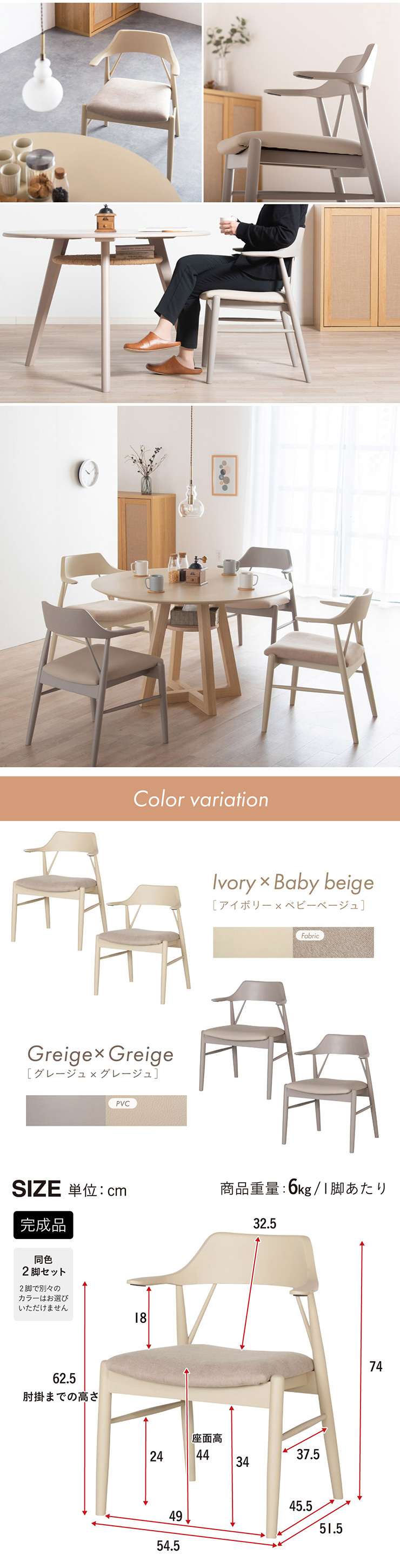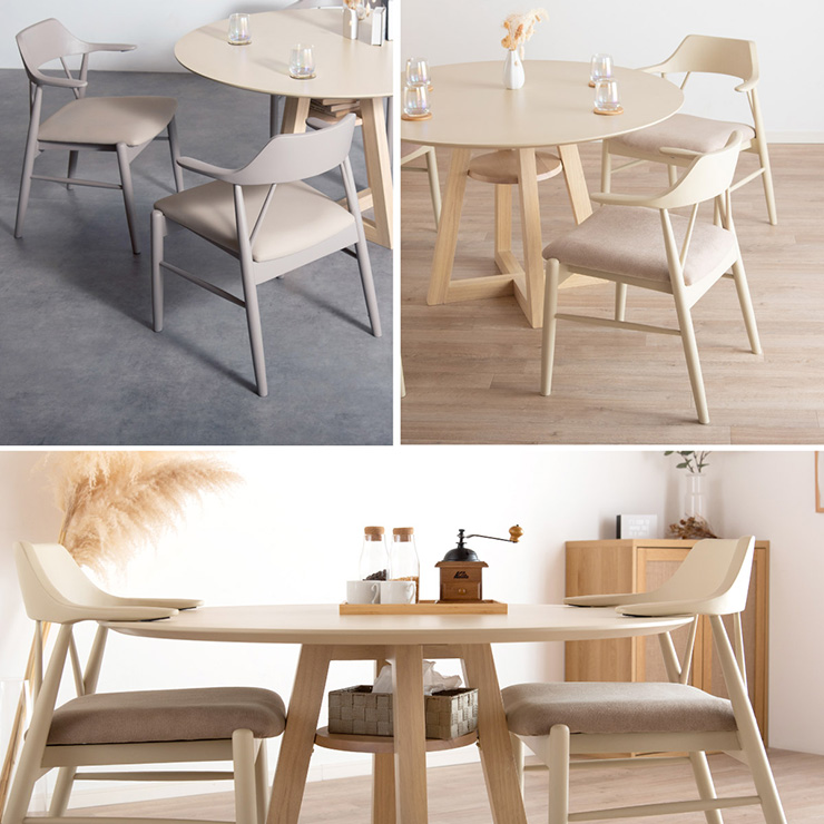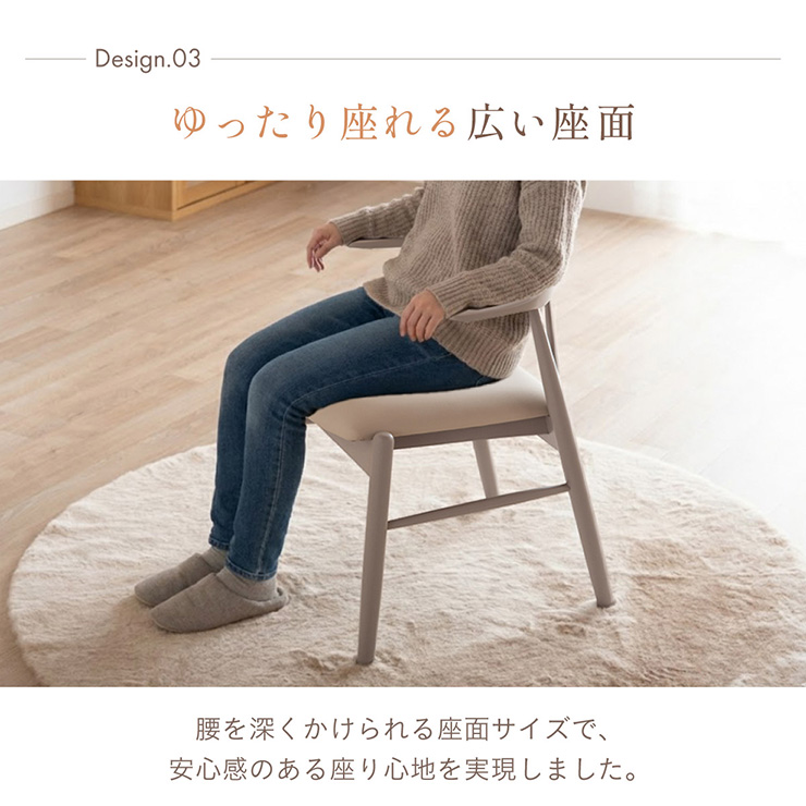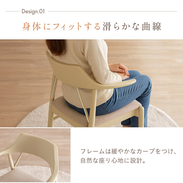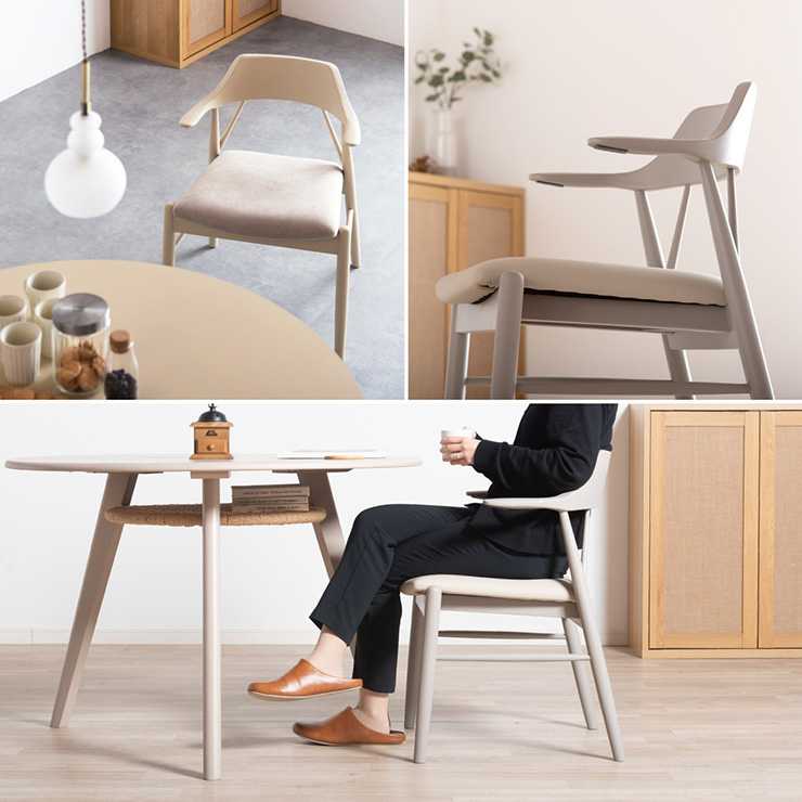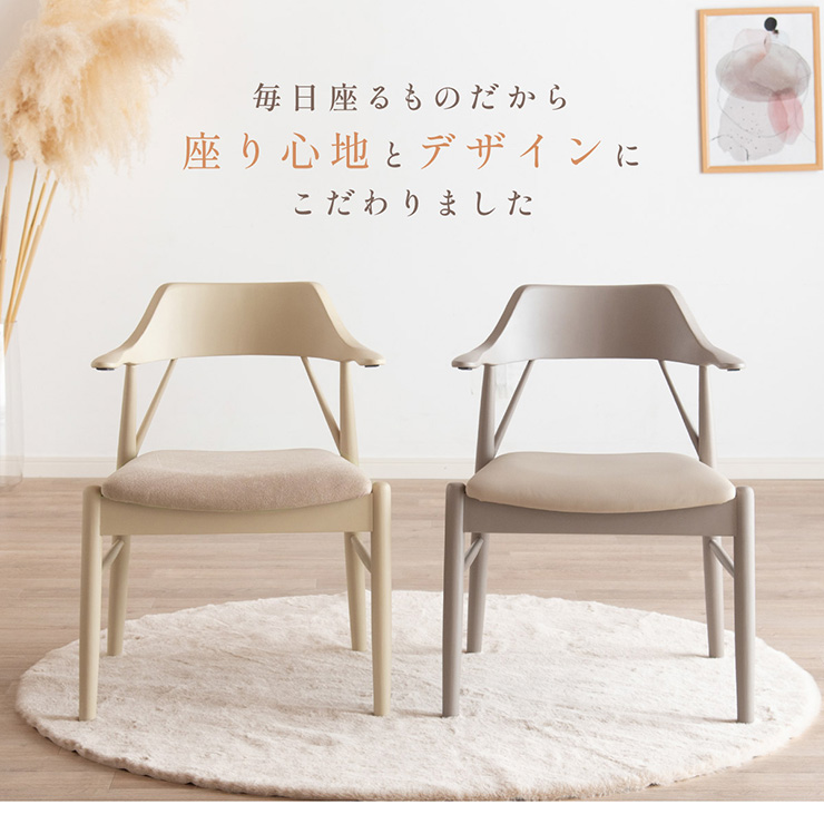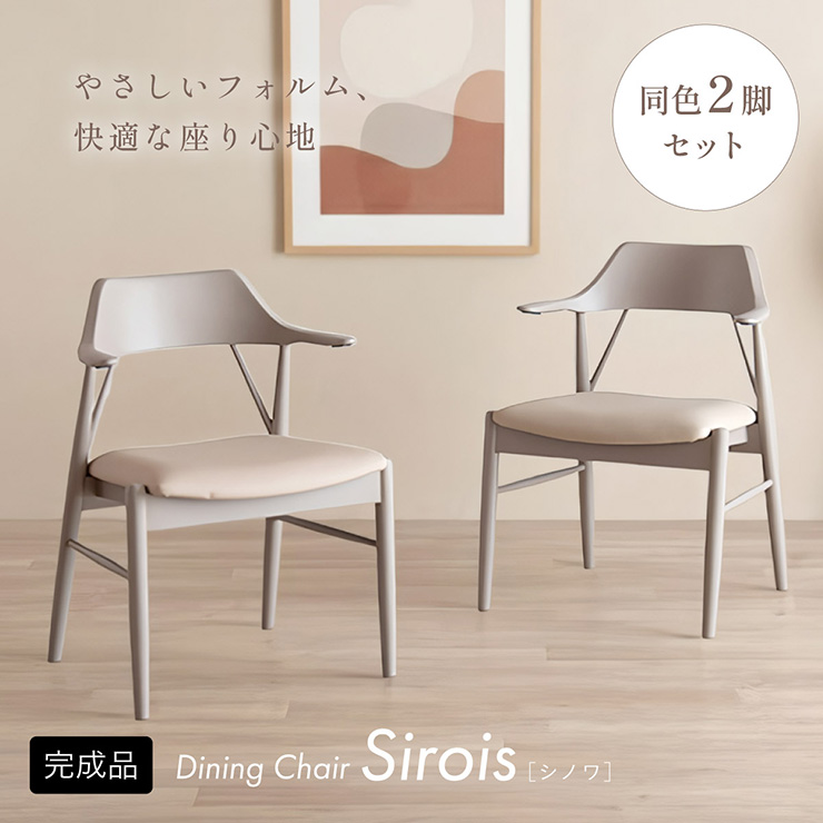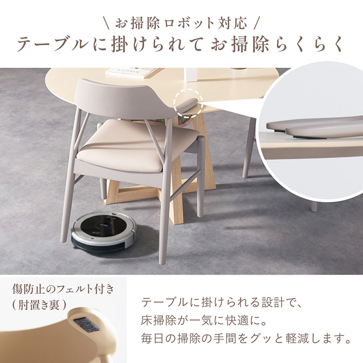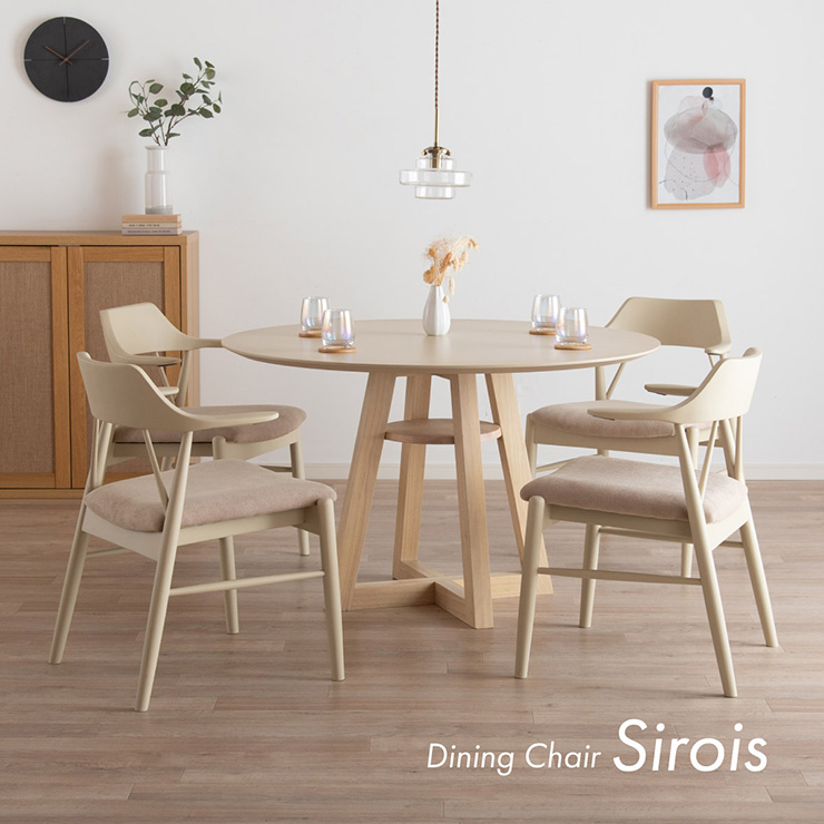 | Round Chair Sirois(シノワ) 2脚セット くつろぎと、機能性を両立したハーフアーム設計 毎日使うものだからこそ、座り心地と機能性のどちらも大切に。ハーフアーム仕様で、肘を預けてくつろげる安心感と、スムーズな立ち座りのしやすさを両立しました。 ■お掃除ロボット対応!テーブルに掛けられてお掃除らくらく ・傷防止のフェルト付き(肘置き裏) ・テーブルに掛けられる設計で、床掃除が一気に快適に。毎日の掃除の手間をグッと軽減します。 ・チェア下にしっかり空間を確保できる為、お掃除ロボットはもちろん、掃除でのお手入れもスムーズに行なえます。 ・重量約6kg 日々の移動や掃除の際もスムーズに上げ下げが可能。女性でも無理なく扱える、使いやすさが魅力です。 ・肘掛けが短い分、椅子を大きく引かずにスッと座れて、毎日の動作をよりスムーズにします。 ■身体にフィットする滑らかな曲線 フレームは緩やかなカーブをつけ、自然な座り心地に設計。 ■丸みのラインが描く、やわらかなフォルム 背もたれからアームへ自然につながるカーブを丁寧にデザイン。空間にやさしくなじみ、身体に心地よくフィットします。 ■ゆったり座れる広い座面 腰を深くかけられる座面サイズで、安心感のある座り心地を実現しました。 座面内部にはウレタンフォームを使用。ほどよい弾力で身体をやさしく支えます。 ■Material 素材 ・frame(フレーム):耐久性に優れたラバーウッドを使用。 ・木目が見えにくい塗装仕上げ・ファブリック:やわらかな肌触りと通気性の良さで、一年中快適に過ごせます。 ・PVC:水や汚れに強く、お手入れ簡単。清潔を保ちやすい素材です。 ■detail ・床を傷付けない脚裏フェルト付き ・座面厚み約6cm ※こちらの商品は完成品となります。 ※組立方や若干の個体差により、表記サイズと完成形サイズに多少の誤差が生じる場合があります。予めご了承下さい。 ※こちらは、チェア2脚セットの販売ページとなります。テーブル等は付属しておりません。 | |