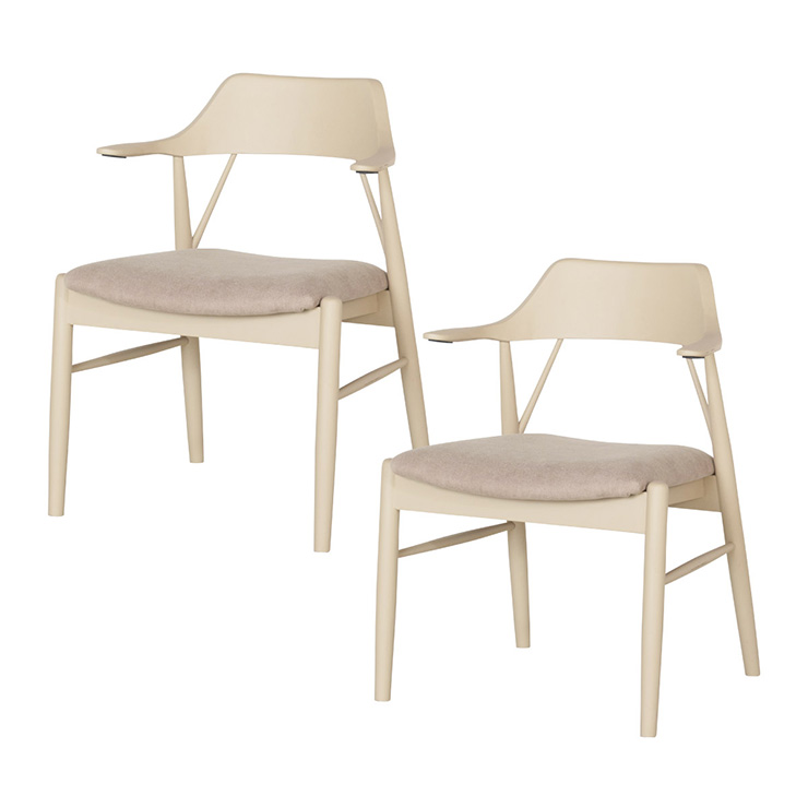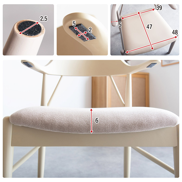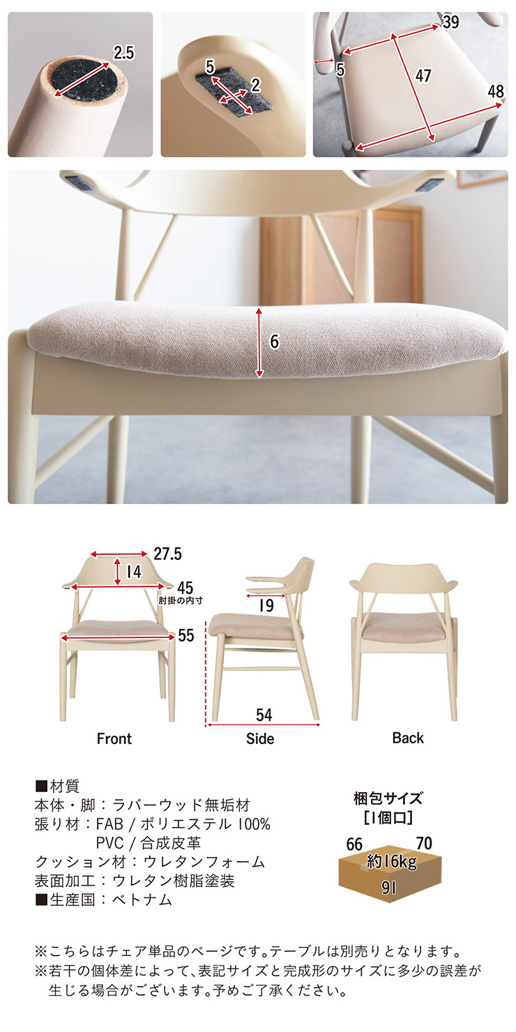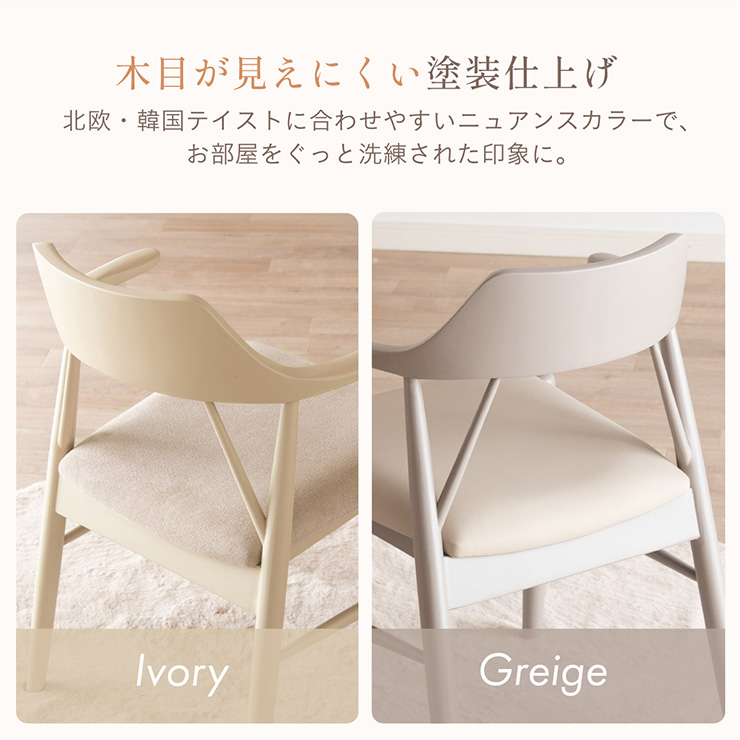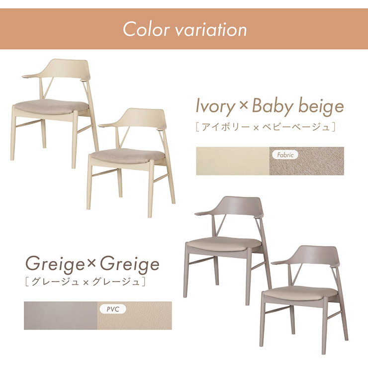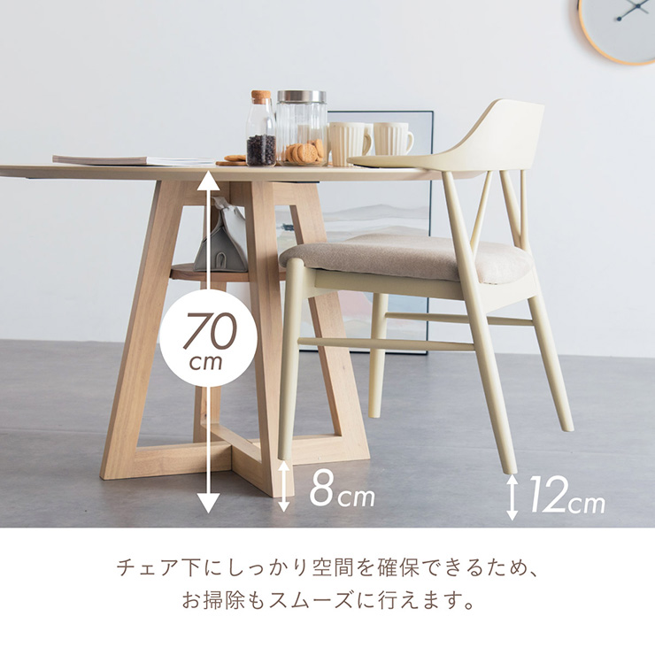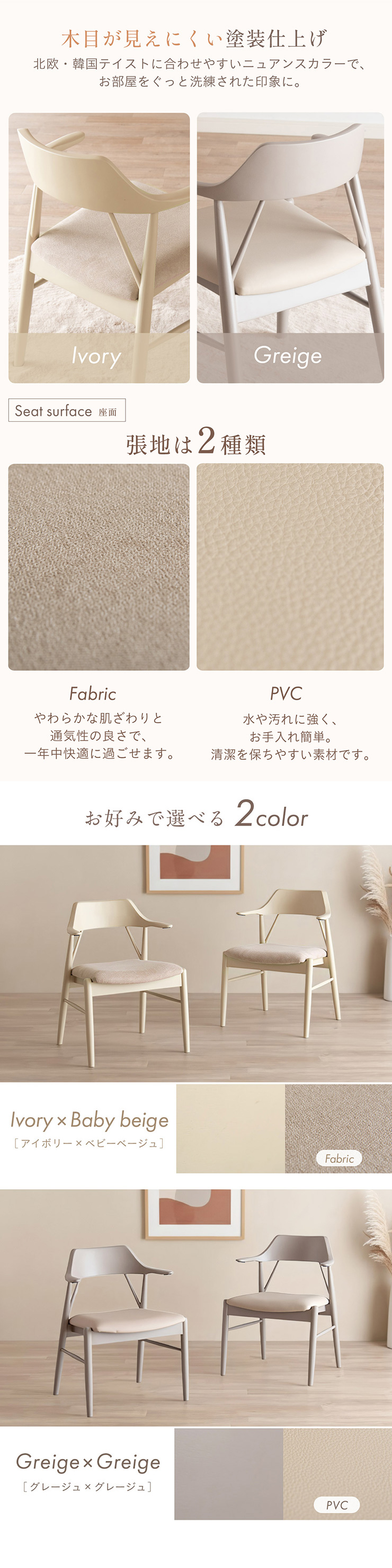 | Round Chair Sirois(シノワ) 2脚セット くつろぎと、機能性を両立したハーフアーム設計 毎日使うものだからこそ、座り心地と機能性のどちらも大切に。ハーフアーム仕様で、肘を預けてくつろげる安心感と、スムーズな立ち座りのしやすさを両立しました。 ■お掃除ロボット対応!テーブルに掛けられてお掃除らくらく ・傷防止のフェルト付き(肘置き裏) ・テーブルに掛けられる設計で、床掃除が一気に快適に。毎日の掃除の手間をグッと軽減します。 ・チェア下にしっかり空間を確保できる為、お掃除ロボットはもちろん、掃除でのお手入れもスムーズに行なえます。 ・重量約6kg 日々の移動や掃除の際もスムーズに上げ下げが可能。女性でも無理なく扱える、使いやすさが魅力です。 ・肘掛けが短い分、椅子を大きく引かずにスッと座れて、毎日の動作をよりスムーズにします。 ■身体にフィットする滑らかな曲線 フレームは緩やかなカーブをつけ、自然な座り心地に設計。 ■丸みのラインが描く、やわらかなフォルム 背もたれからアームへ自然につながるカーブを丁寧にデザイン。空間にやさしくなじみ、身体に心地よくフィットします。 ■ゆったり座れる広い座面 腰を深くかけられる座面サイズで、安心感のある座り心地を実現しました。 座面内部にはウレタンフォームを使用。ほどよい弾力で身体をやさしく支えます。 ■Material 素材 ・frame(フレーム):耐久性に優れたラバーウッドを使用。 ・木目が見えにくい塗装仕上げ・ファブリック:やわらかな肌触りと通気性の良さで、一年中快適に過ごせます。 ・PVC:水や汚れに強く、お手入れ簡単。清潔を保ちやすい素材です。 ■detail ・床を傷付けない脚裏フェルト付き ・座面厚み約6cm ※こちらの商品は完成品となります。 ※組立方や若干の個体差により、表記サイズと完成形サイズに多少の誤差が生じる場合があります。予めご了承下さい。 ※こちらは、チェア2脚セットの販売ページとなります。テーブル等は付属しておりません。 | |