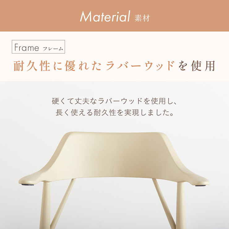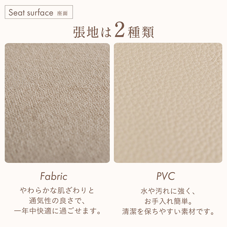 | 材質 | 本体・脚:ラバーウッド無垢材 張地:FAB/ポリエステル100%・PVC/合成皮革 クッション材:ウレタンフォーム 表面加工:ウレタン樹脂塗装 |