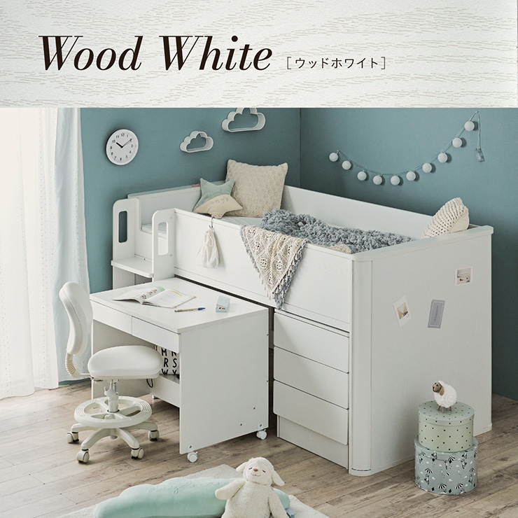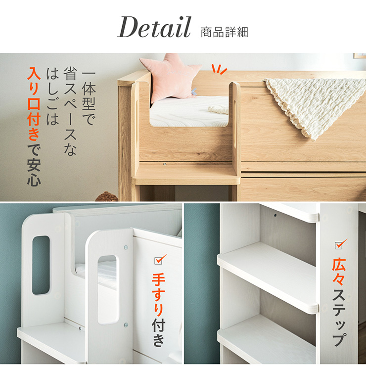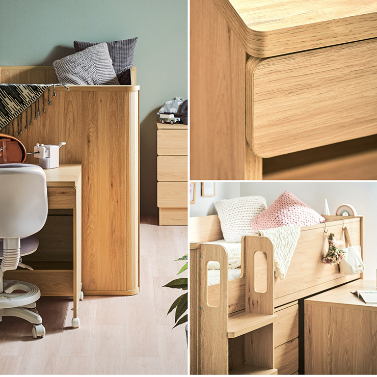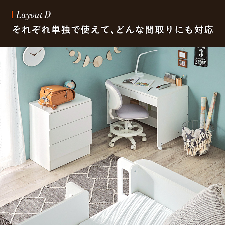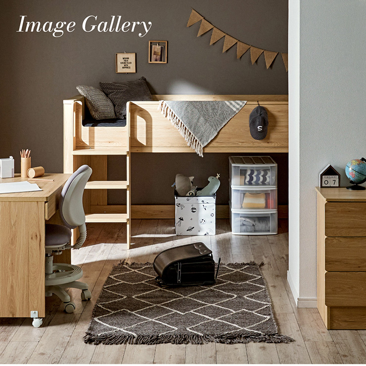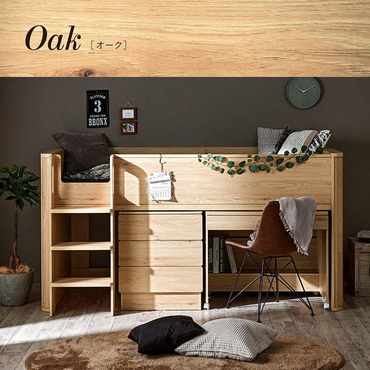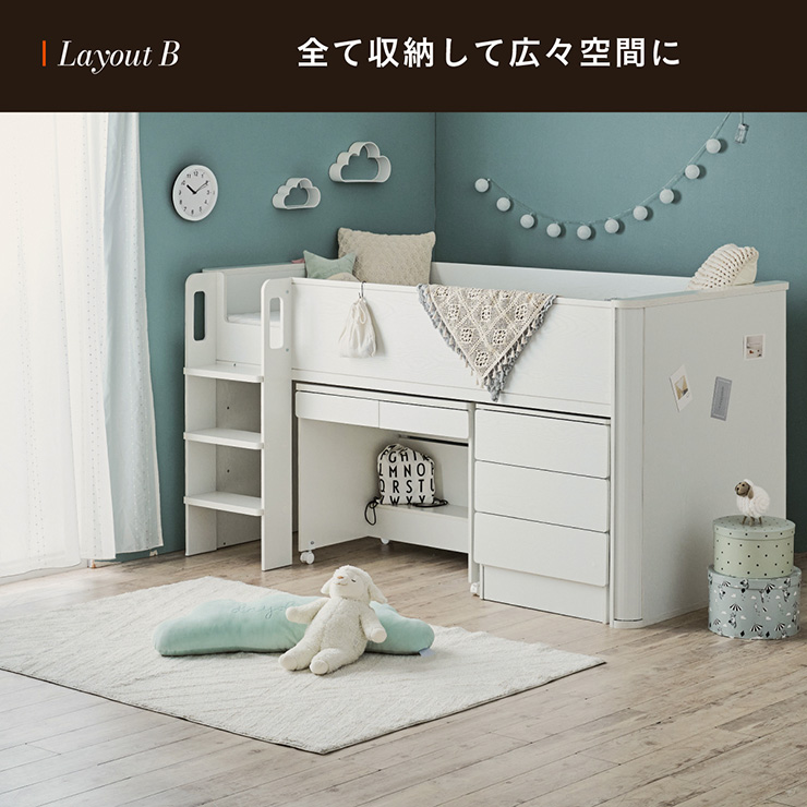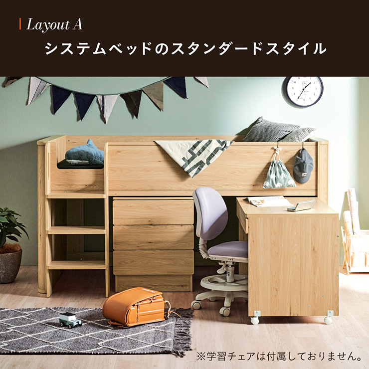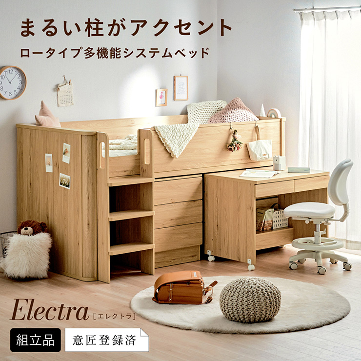 | まるい柱がアクセント。ロータイプ多機能システムベッド Electra(エレクトラ) コンパクト省スペース ・デザイン支柱 ・分割使用可の3点セット ・安心のロータイプ ■新構造ラウンドポール やさしい曲線のプレミアムデザイン支柱 丸みのあるデザインが、やさしい雰囲気と高級感をアップ ■用途に合わせて使い分けできる分割3点セット シーン別に使えて毎日がもっと快適に。 お部屋に合わせて自由にレイアウトできます。 ・LayoutA システムベッドのスタンダードスタイル ・LayoutB 全て収納して広々空間に ・LayoutC お部屋を広く使ってベッド下も有効活用 ・LayoutD それぞれ単独で使えてどんな間取りにも対応 ■Bed 安心のロータイプ&高さのあるサイドフレーム ※はしごの左右の入れ替えはできません。 ■ロータイプなので布団やマットレスの上げ下ろしもスムーズに行えます。 通気性のいいLVLボードで風の通り道を確保し、カビやダニの繁殖を防ぎます。 ■Desk 広々天板で嬉しい引き出し付き&足元にも収納棚 ・散らかりがちな文具をしまえる2杯の引き出し付き ・レールはスムーズに開閉できるスライドレール仕様 ・デスクの足元を有効活用できる、便利なオープン棚 ・勉強道具がしっかり置けるワイド天板 出し入れがスムーズにできるキャスター付。 前方2つにはロック機能が付いているので固定することも可能 ■Chest スライドレール仕様でスムーズに開閉&小物や衣類を収納可 引き出しはスライドレール仕様で、力を入れずにスムーズに開閉できます。 横からのスムーズ開閉で取手のないフラットデザイン ベッド下の空間をムダなく活用布団収納スペースとしても使えるベッド下空間。 一体型で省スペースなはしごは入り口付きで安心。 手すり付き&広々ステップで上り下りラクラク。 尖った危険な角には丸みをつけ、安全性をアップ! ネジ穴を隠せるシール付き ※こちらの商品はお客様組み立てとなります。 ※組み立て方や若干の個体差によって、表記サイズと完成形のサイズに多少の誤差が生じる場合がございます。予めご了承ください。 ※こちらの商品はベッド本体のみの販売となります。マットレスは付属しておりません。 | |