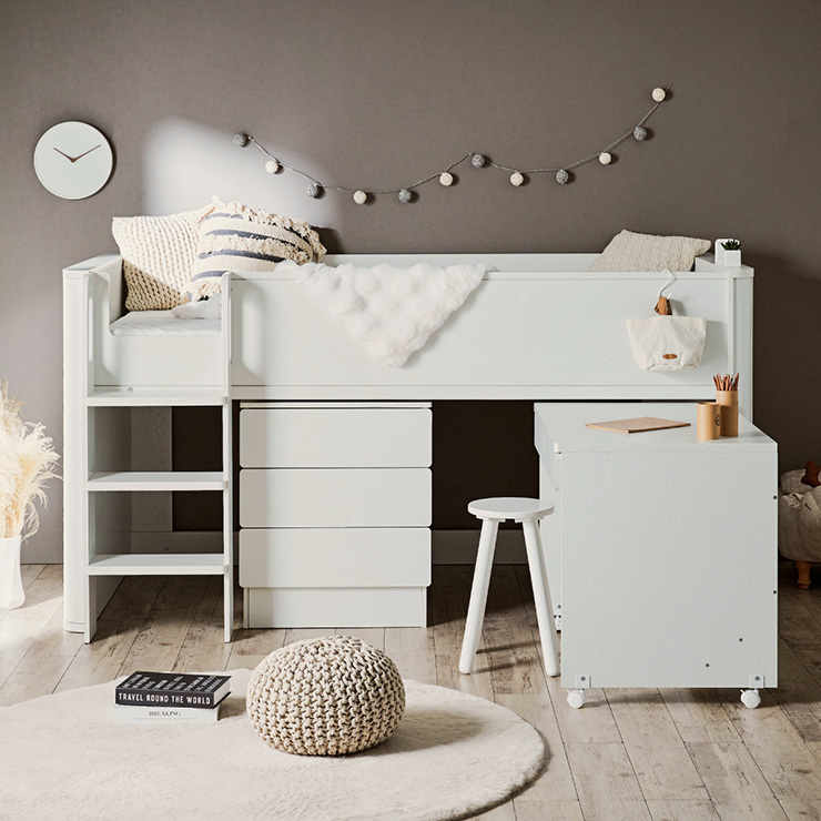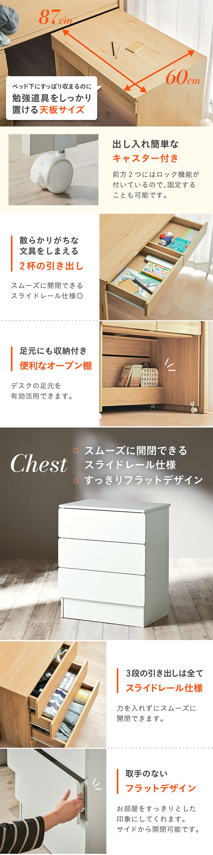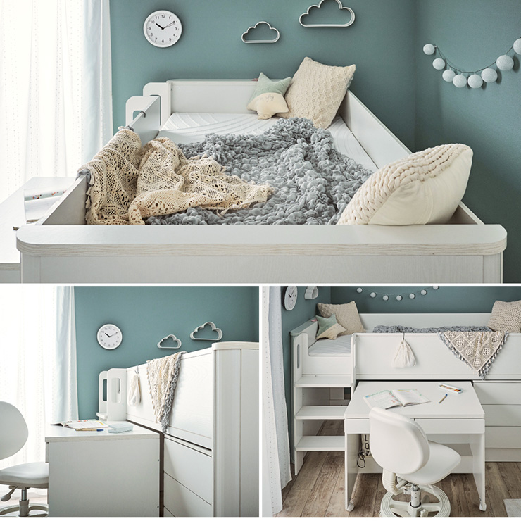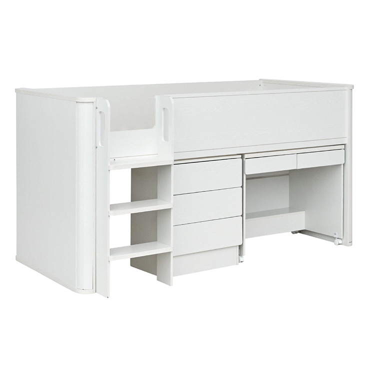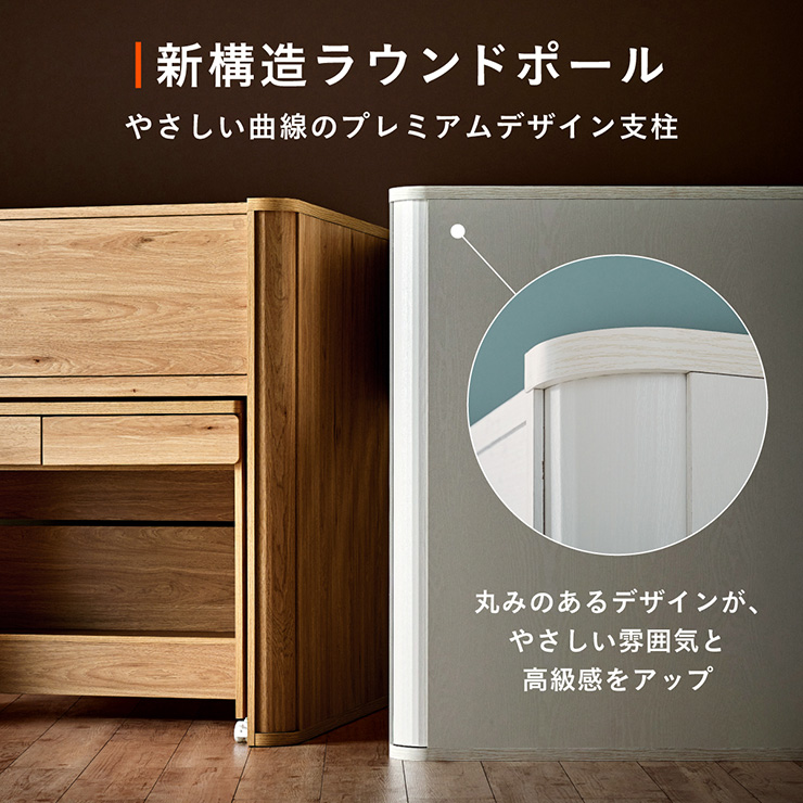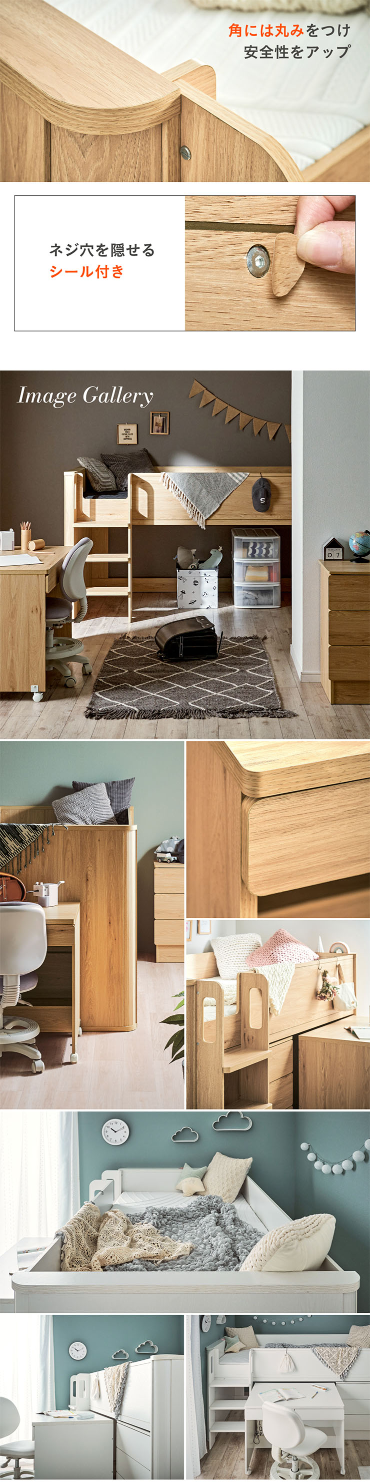 | まるい柱がアクセント。ロータイプ多機能システムベッド Electra(エレクトラ) コンパクト省スペース ・デザイン支柱 ・分割使用可の3点セット ・安心のロータイプ ■新構造ラウンドポール やさしい曲線のプレミアムデザイン支柱 丸みのあるデザインが、やさしい雰囲気と高級感をアップ ■用途に合わせて使い分けできる分割3点セット シーン別に使えて毎日がもっと快適に。 お部屋に合わせて自由にレイアウトできます。 ・LayoutA システムベッドのスタンダードスタイル ・LayoutB 全て収納して広々空間に ・LayoutC お部屋を広く使ってベッド下も有効活用 ・LayoutD それぞれ単独で使えてどんな間取りにも対応 ■Bed 安心のロータイプ&高さのあるサイドフレーム ※はしごの左右の入れ替えはできません。 ■ロータイプなので布団やマットレスの上げ下ろしもスムーズに行えます。 通気性のいいLVLボードで風の通り道を確保し、カビやダニの繁殖を防ぎます。 ■Desk 広々天板で嬉しい引き出し付き&足元にも収納棚 ・散らかりがちな文具をしまえる2杯の引き出し付き ・レールはスムーズに開閉できるスライドレール仕様 ・デスクの足元を有効活用できる、便利なオープン棚 ・勉強道具がしっかり置けるワイド天板 出し入れがスムーズにできるキャスター付。 前方2つにはロック機能が付いているので固定することも可能 ■Chest スライドレール仕様でスムーズに開閉&小物や衣類を収納可 引き出しはスライドレール仕様で、力を入れずにスムーズに開閉できます。 横からのスムーズ開閉で取手のないフラットデザイン ベッド下の空間をムダなく活用布団収納スペースとしても使えるベッド下空間。 一体型で省スペースなはしごは入り口付きで安心。 手すり付き&広々ステップで上り下りラクラク。 尖った危険な角には丸みをつけ、安全性をアップ! ネジ穴を隠せるシール付き ※こちらの商品はお客様組み立てとなります。 ※組み立て方や若干の個体差によって、表記サイズと完成形のサイズに多少の誤差が生じる場合がございます。予めご了承ください。 ※こちらの商品はベッド本体のみの販売となります。マットレスは付属しておりません。 | |