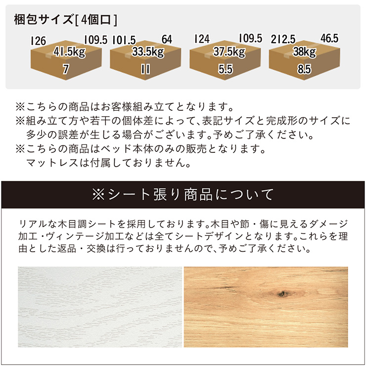 | 梱包(4個口) | サイズ:W126 x D109.5 x H7cm(41.5kg)/W101.5 x D64 x H11cm(33.5kg)/W124 x D109.5 x H5.5cm(37.5kg)/W212.5 x D46.5 x H8.5cm(38kg) |