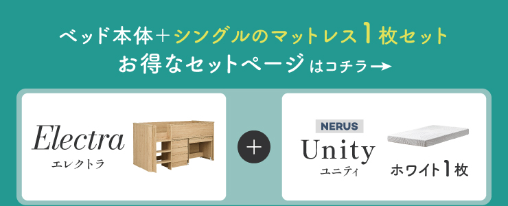 | まるい柱がアクセント。ロータイプ多機能システムベッド Electra(エレクトラ) コンパクト省スペース ・デザイン支柱 ・分割使用可の3点セット ・安心のロータイプ ■新構造ラウンドポール やさしい曲線のプレミアムデザイン支柱 丸みのあるデザインが、やさしい雰囲気と高級感をアップ ■用途に合わせて使い分けできる分割3点セット シーン別に使えて毎日がもっと快適に。 お部屋に合わせて自由にレイアウトできます。 ・LayoutA システムベッドのスタンダードスタイル ・LayoutB 全て収納して広々空間に ・LayoutC お部屋を広く使ってベッド下も有効活用 ・LayoutD それぞれ単独で使えてどんな間取りにも対応 ■Bed 安心のロータイプ&高さのあるサイドフレーム ※はしごの左右の入れ替えはできません。 ■ロータイプなので布団やマットレスの上げ下ろしもスムーズに行えます。 通気性のいいLVLボードで風の通り道を確保し、カビやダニの繁殖を防ぎます。 ■Desk 広々天板で嬉しい引き出し付き&足元にも収納棚 ・散らかりがちな文具をしまえる2杯の引き出し付き ・レールはスムーズに開閉できるスライドレール仕様 ・デスクの足元を有効活用できる、便利なオープン棚 ・勉強道具がしっかり置けるワイド天板 出し入れがスムーズにできるキャスター付。 前方2つにはロック機能が付いているので固定することも可能 ■Chest スライドレール仕様でスムーズに開閉&小物や衣類を収納可 引き出しはスライドレール仕様で、力を入れずにスムーズに開閉できます。 横からのスムーズ開閉で取手のないフラットデザイン ベッド下の空間をムダなく活用布団収納スペースとしても使えるベッド下空間。 一体型で省スペースなはしごは入り口付きで安心。 手すり付き&広々ステップで上り下りラクラク。 尖った危険な角には丸みをつけ、安全性をアップ! ネジ穴を隠せるシール付き ※こちらの商品はお客様組み立てとなります。 ※組み立て方や若干の個体差によって、表記サイズと完成形のサイズに多少の誤差が生じる場合がございます。予めご了承ください。 ※こちらの商品はベッド本体のみの販売となります。マットレスは付属しておりません。 | |