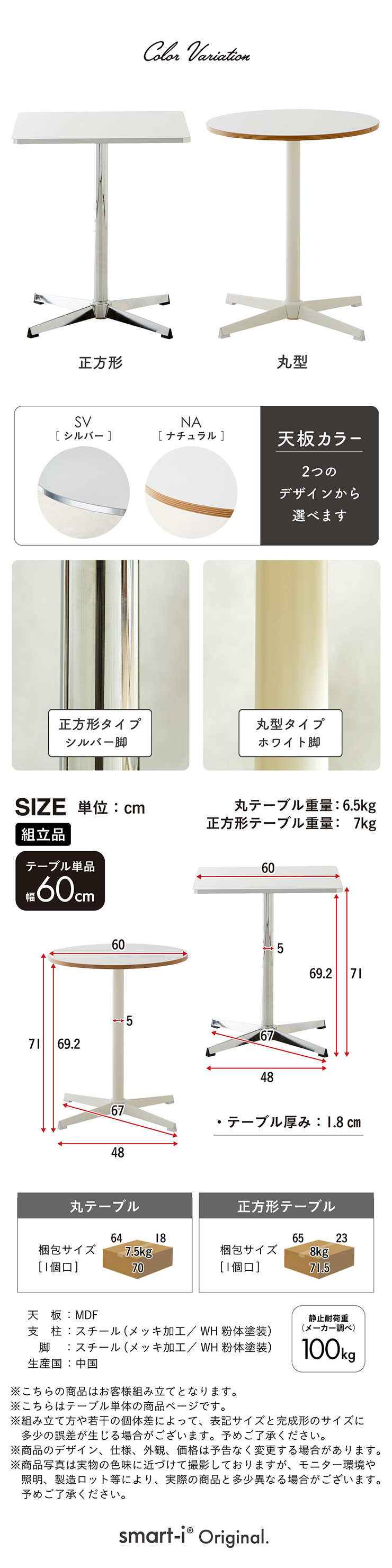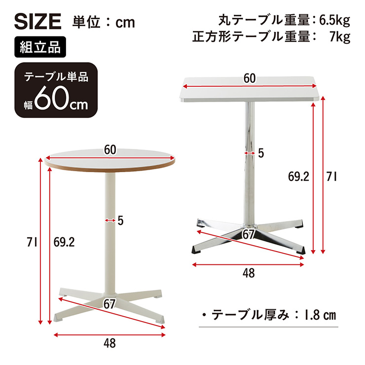 | 商品重量 | 丸テーブル:6.5kg 正方形テーブル:7kg |