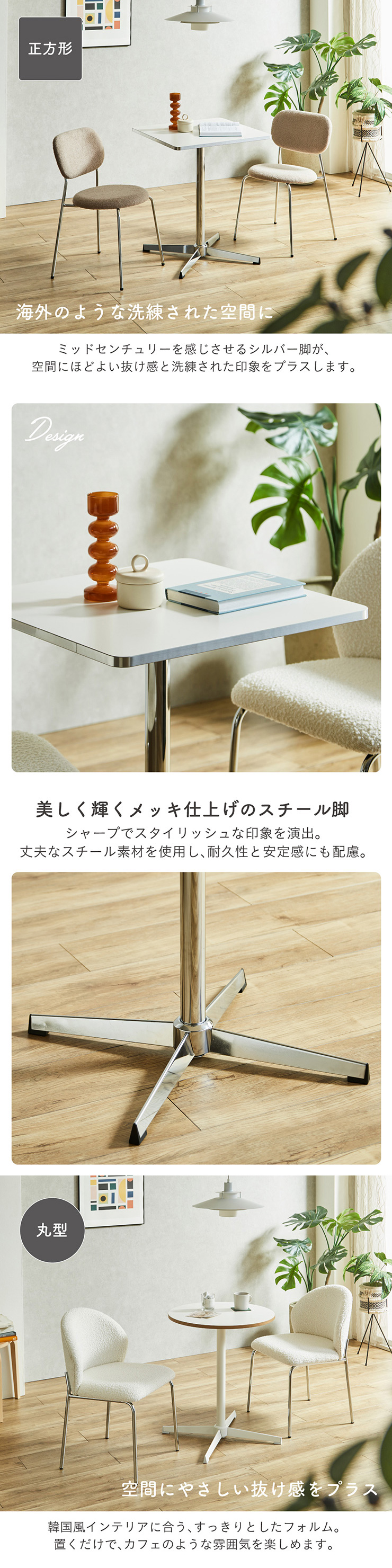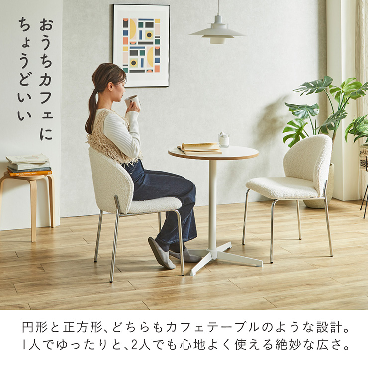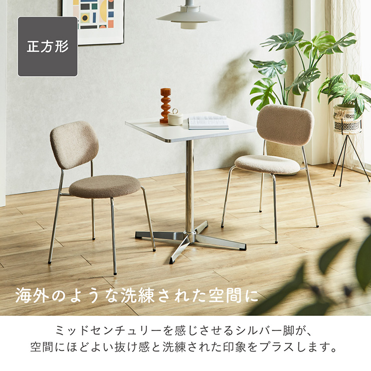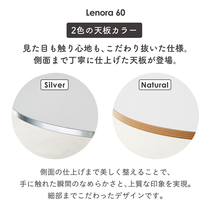 | 2色の天板カラー ダイニングテーブル Lenora(レノーラ) 幅60cm 見た目も触り心地も、こだわり抜いた仕様。 側面まで丁寧に仕上げた天板が登場。 側面の仕上げまで美しく整えることで、手に触れた瞬間の滑らかさと、上質な印象を実現。 細部までこだわったデザインです。 ■2つのデザインから選べます。 正方形はスタイリッシュな印象のシルバー脚 円型は韓国テイストのホワイト脚 ■海外のような洗練された空間に ミッドセンチュリーを感じさせるシルバー脚が、空間に程よい抜け感と洗練された印象をプラスします。 ■美しく輝くメッキ仕上げのスチール脚 シャープでスタイリッシュな印象を演出。 丈夫なスチール素材を使用し、耐久性と安定感にも配慮。 ■空間にやさしい抜け感をプラス 韓国風インテリアに合う、すっきりとしたフォルム 置くだけで、カフェのような雰囲気を楽しめます。 ■水谷汚れに強い粉体塗装仕上げ サビにくく、傷がつきにくい仕様で、美しさを長く保てる耐久性の高い仕上がりです。 ■美しさが続くメラミン天板 傷や水分、熱にも強い高耐久仕様。 汚れても軽く拭くだけで清潔を保てる、扱いやすい天板。 ■おうちカフェにちょうどいい 円形と正方形、どちらもカフェテーブルのような設計。 1人でゆったりと、2人でも心地よく使える絶妙な広さ。 ※こちらの商品はお客様組み立てとなります。 ※こちらはテーブル単体の商品ページです。 ※サイズの計測の仕方や若干の個体差によって、表記サイズと完成系のサイズに多少の誤差が生じる場合がございます。予めご了承ください。 ※商品のデザイン、仕様、外観、価格は予告なく変更する場合がございます。 ※商品写真は実物の色味に近づけて撮影しておりますが、モニター環境や照明、製造ロットにより、実際の商品と多少異なる場合がございます。あらかじめご了承ください。 | |