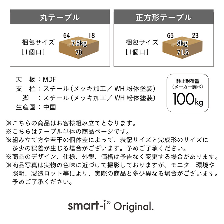| 梱包サイズ(1個口) | 丸テーブル:W64 x D18 x H70cm(7.5kg) 正方形テーブル:W65 x D23 x H71.5cm(8kg) |