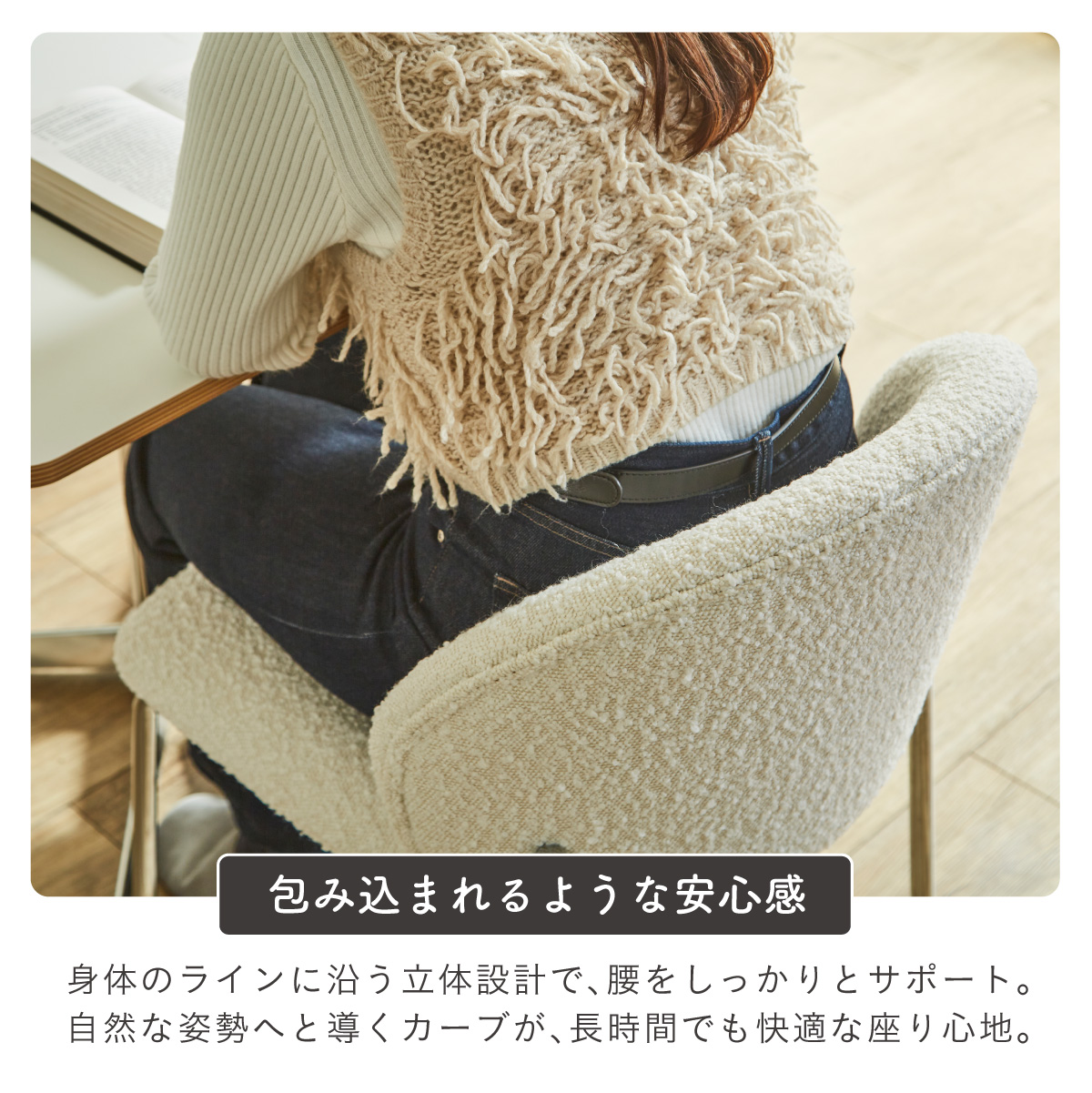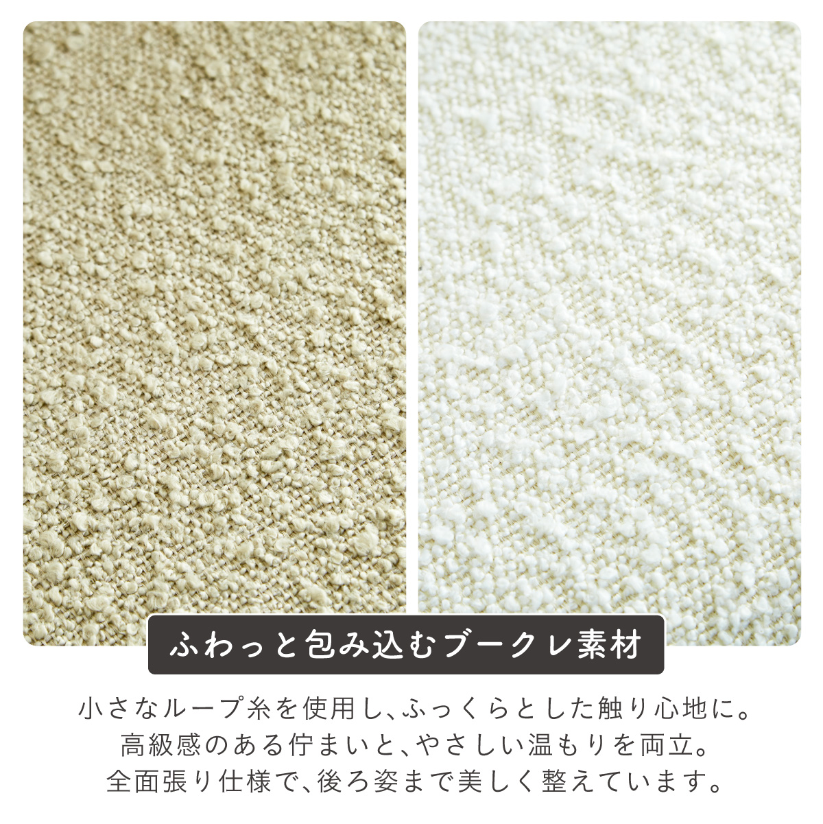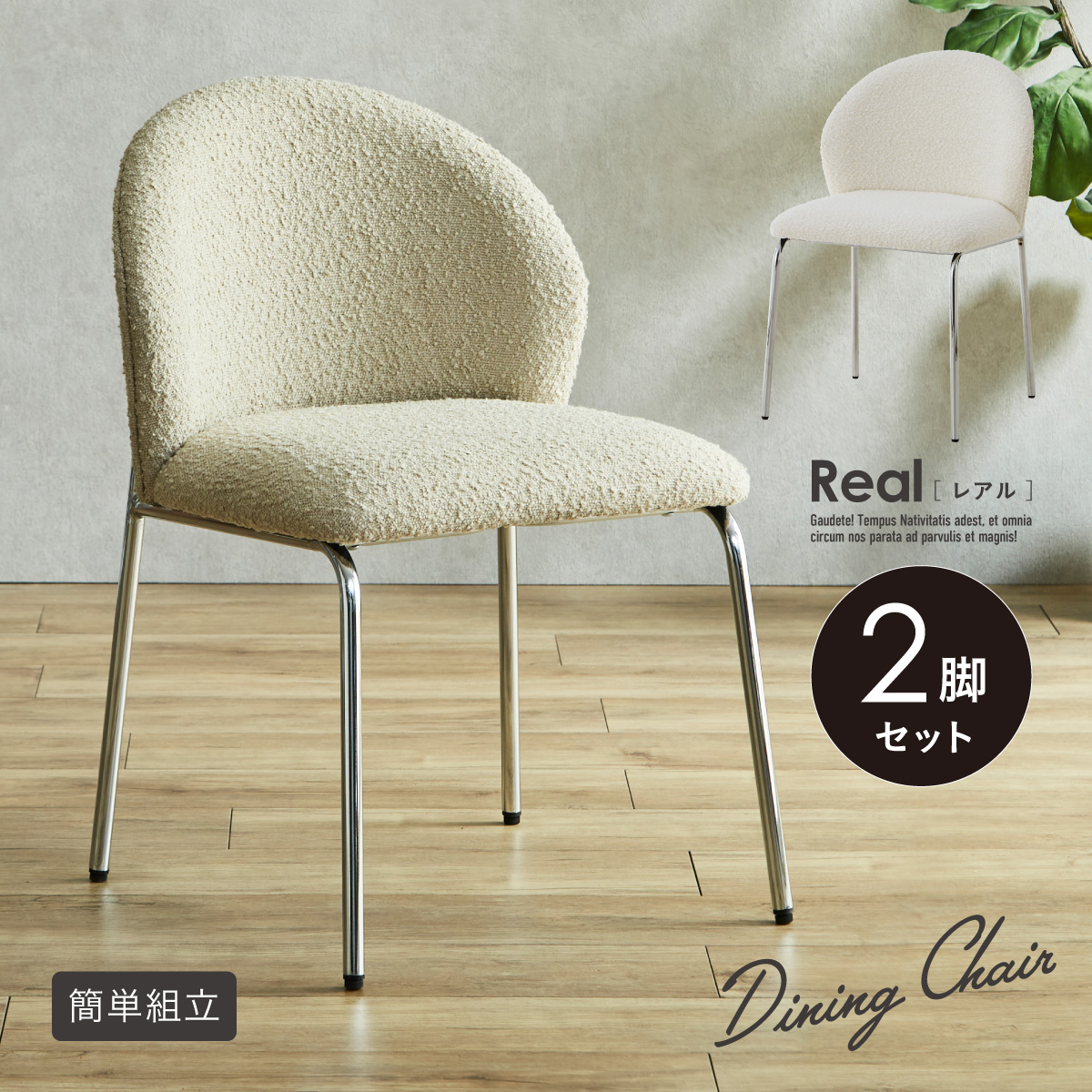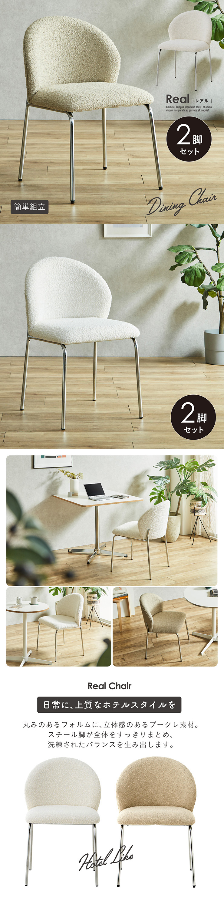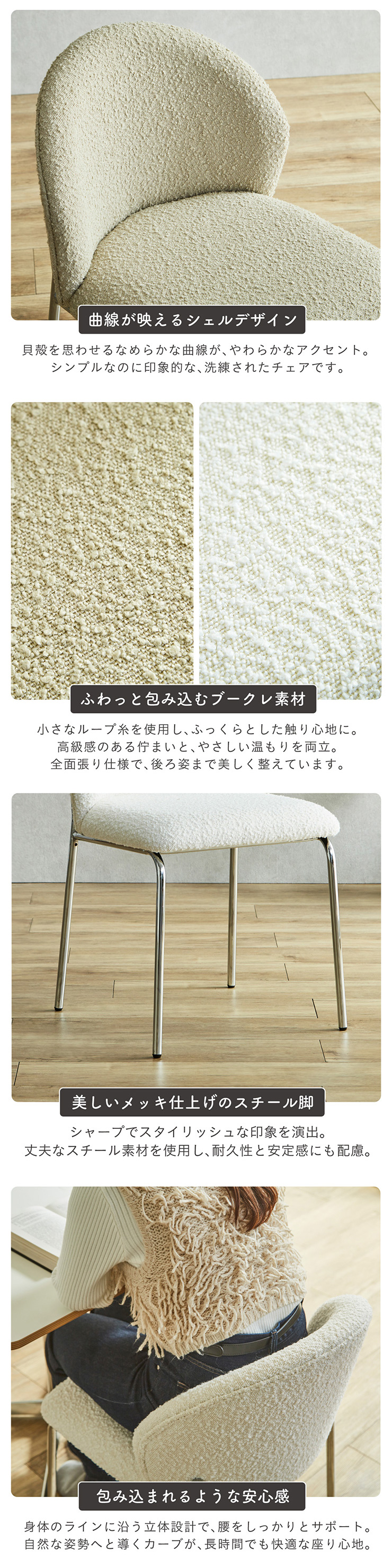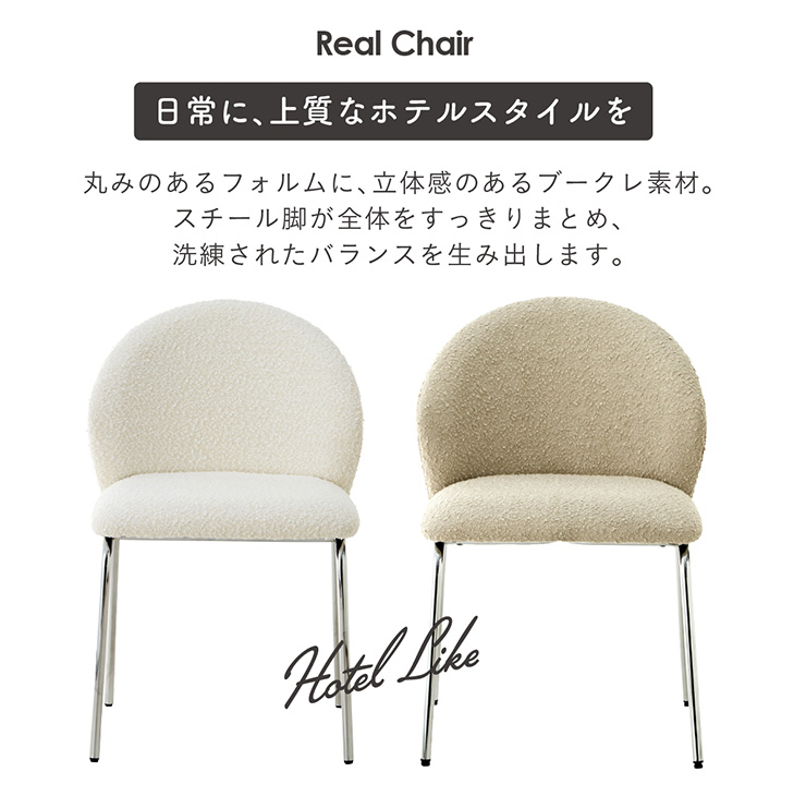 | 日常に、上質なホテルスタイルを Real(レアル)2脚セット 丸みのあるフォルムに、立体感のあるブークレ素材。 スチール脚が全体をすっきりまとめ、洗練されたバランスを生み出します。 ■曲線が映えるシェルデザイン 貝殻を思わせるなめらかな曲線が、やわらかなアクセント。 シンプルなのに印象的な、戦乱されたチェアです。 ■ふわっと包み込むブークレ素材 小さなループ糸を仕様し、ふっくらとした触り心地に。 高級感のある佇まいと、やさしい温もりを両立。 全面張り仕様で、後ろ姿まで美しく整えています。 ■美しいメッキ仕上げのスチール脚 シャープでスタイリッシュな印象を演出。 丈夫なスチール素材を使用し、耐久性と安定感にも配慮。 ■包み込まれるような安心感 身体のラインに沿う立体設計で、腰をサポート。 自然な姿勢へと導くカーブが、長時間でも快適な座り心地。 ■しっかり支える、快適クッション 座面と背もたれに程よい弾力をもたせたウレタンを使用。 身体をやさしく受け止めながら体圧を分散し、心地よい座り心地が続きます。 工具いらずのかんたん組み立て ネジで脚を固定するだけの簡単設計。 工具は付属しているので追加購入は不要です。 高さ調整ができるアジャスター付き 床に合わせて調整でき、安定して設置できます。 ※こちらの商品はお客様組み立てとなります。 ※こちらはチェア2脚セットの商品ページです。 ※サイズの計測の仕方や若干の個体差によって、表記サイズと完成系のサイズに多少の誤差が生じる場合がございます。予めご了承ください。 ※商品のデザイン、仕様、外観、価格は予告なく変更する場合がございます。 ※商品写真は実物の色味に近づけて撮影しておりますが、モニター環境や照明、製造ロットにより、実際の商品と多少異なる場合がございます。あらかじめご了承ください。 | |